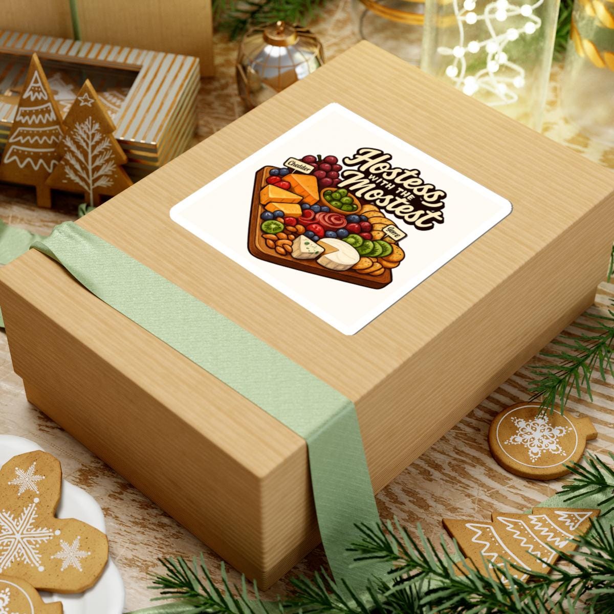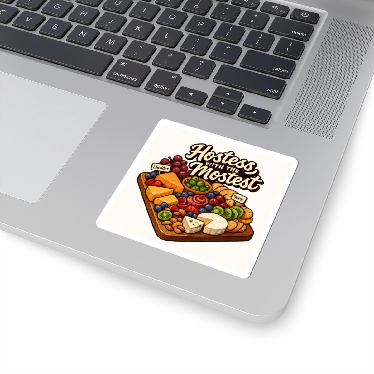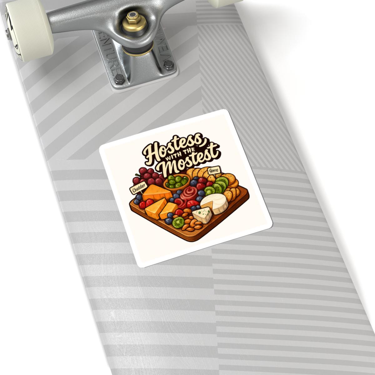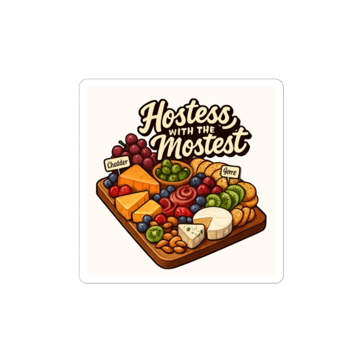 A glossy kiss-cut sticker celebrating the art of hosting — illustrated with a warm, detailed charcuterie board and the playful script “Hostess with the Mostest.” The rich, eco-solvent printed colors and glossy finish make every slice of cheese and cluster of grapes pop, whether it’s brightening a laptop, journal, or recipe box. Lightweight and easy to apply, the kiss-cut shape peels away cleanly while the strong permanent adhesive holds on smooth, flat surfaces for long-lasting display. Choose white or transparent backing and from four sizes to match your placement. This sticker brings a bit of cozy kitchen charm to everyday items and reminds the host in your life of the care they put into gatherings.