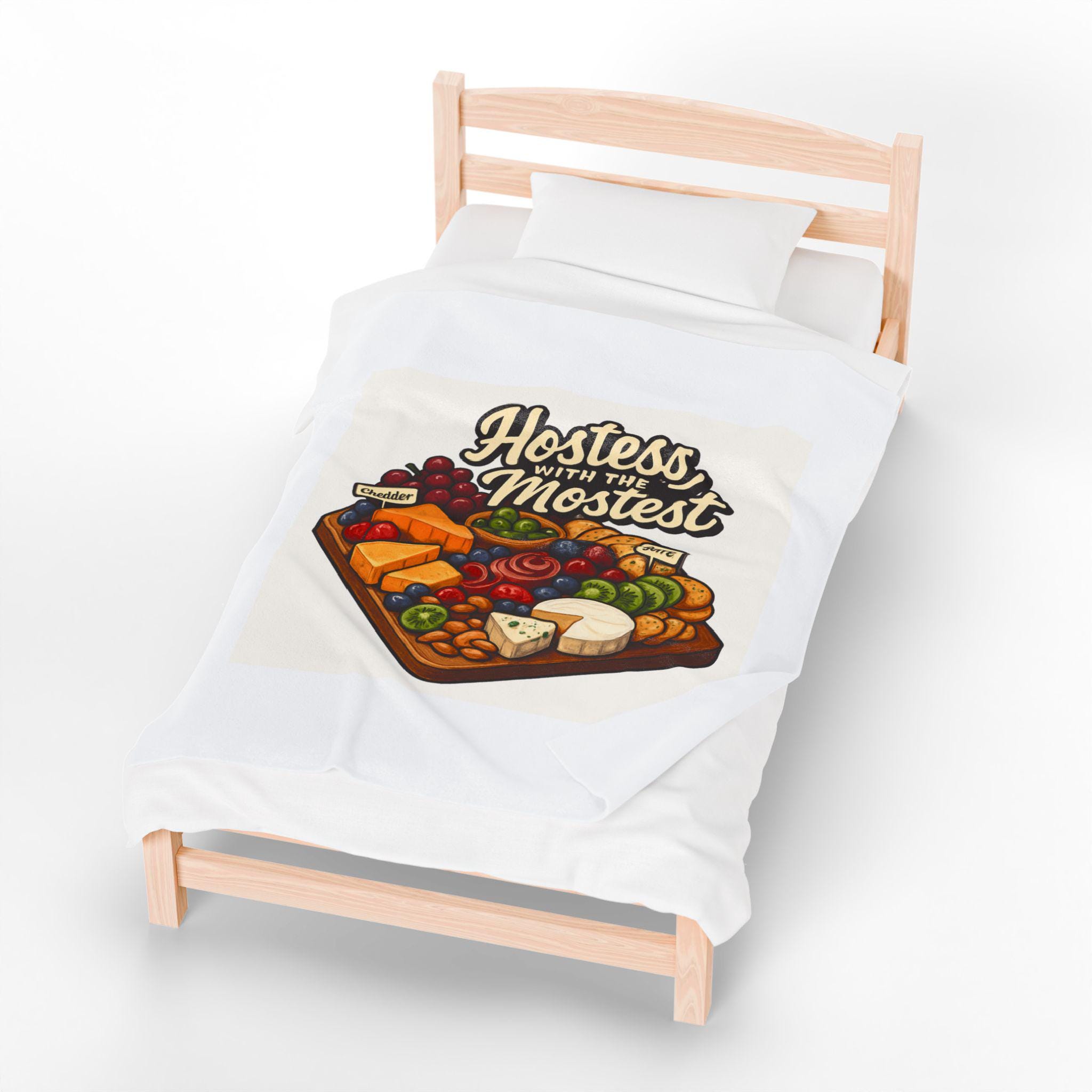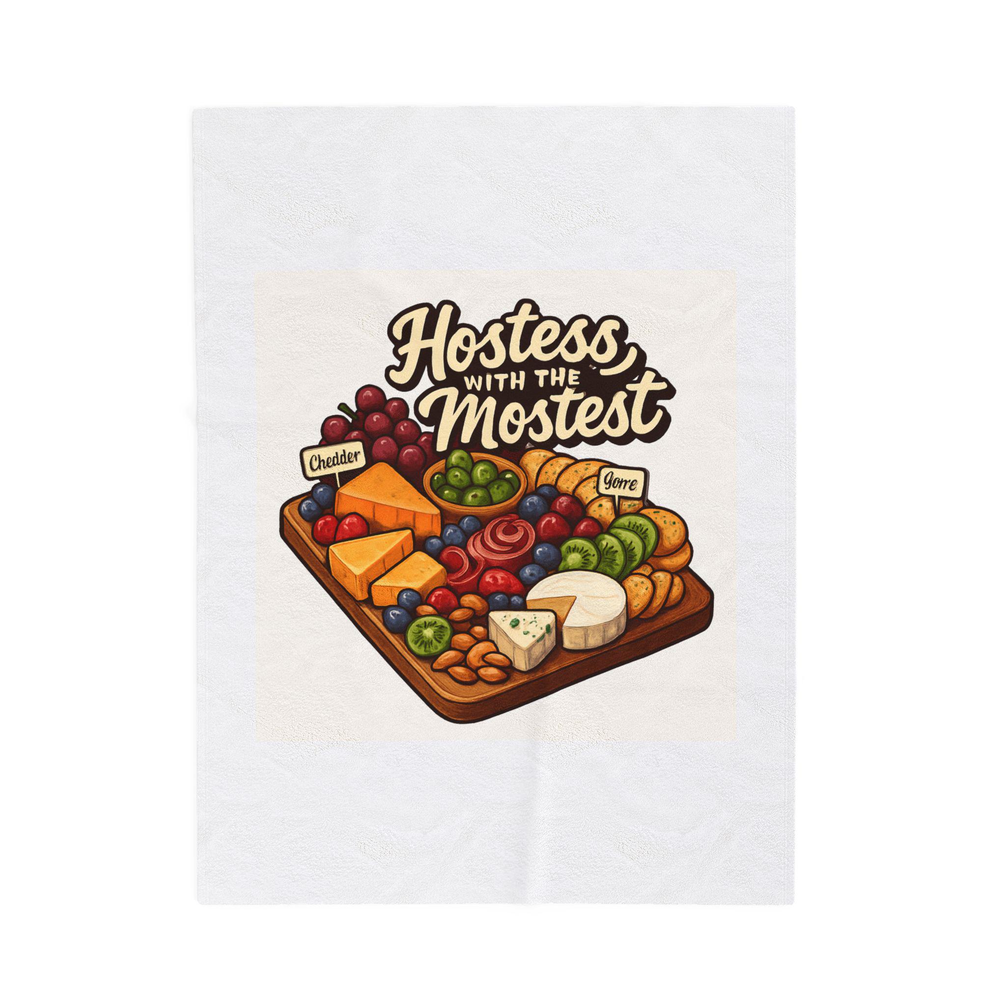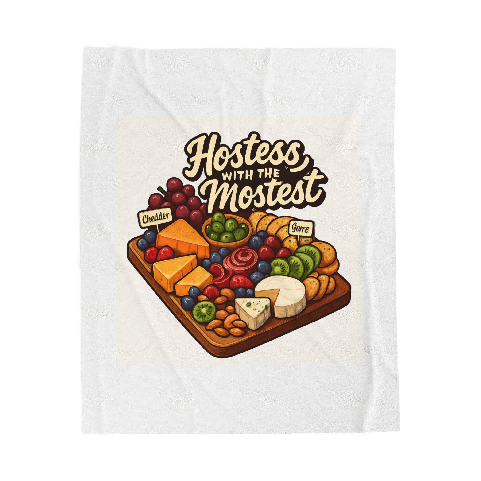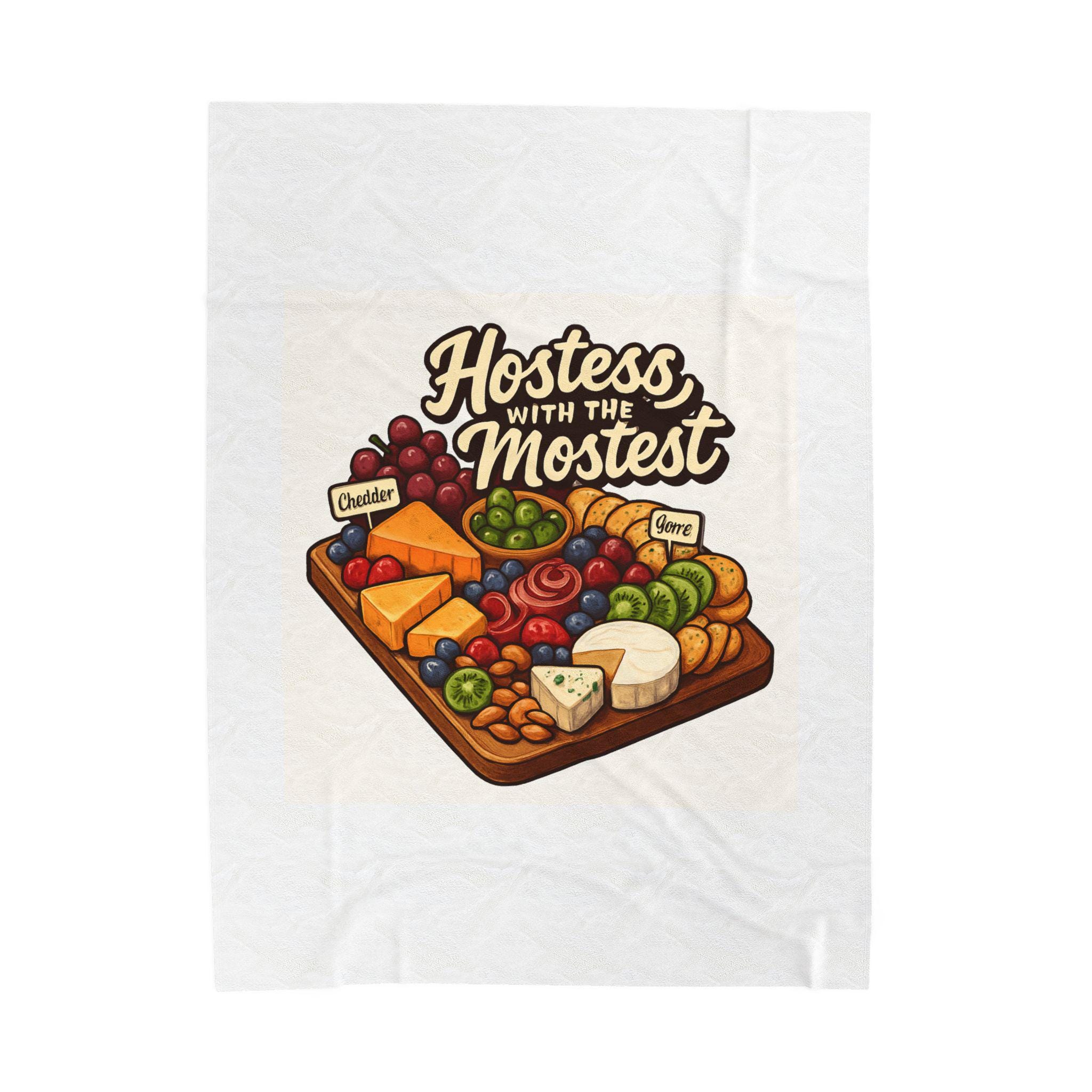A sumptuously soft velveteen blanket printed with a warm, playful illustration: a loaded cheese and charcuterie board under the hand-lettered phrase “Hostess with the Mostest.” The design pops in rich, vivid color on one side of the medium-weight plush fabric, while the reverse stays clean and cozy. Draped over the couch or folded on a guest chair, it sets a relaxed, welcoming tone and invites lingering conversation and shared plates. Machine-friendly polyester keeps the blanket lightweight, quick-drying, and resilient through many gatherings, while reinforced double-needle topstitching holds up to repeated use.