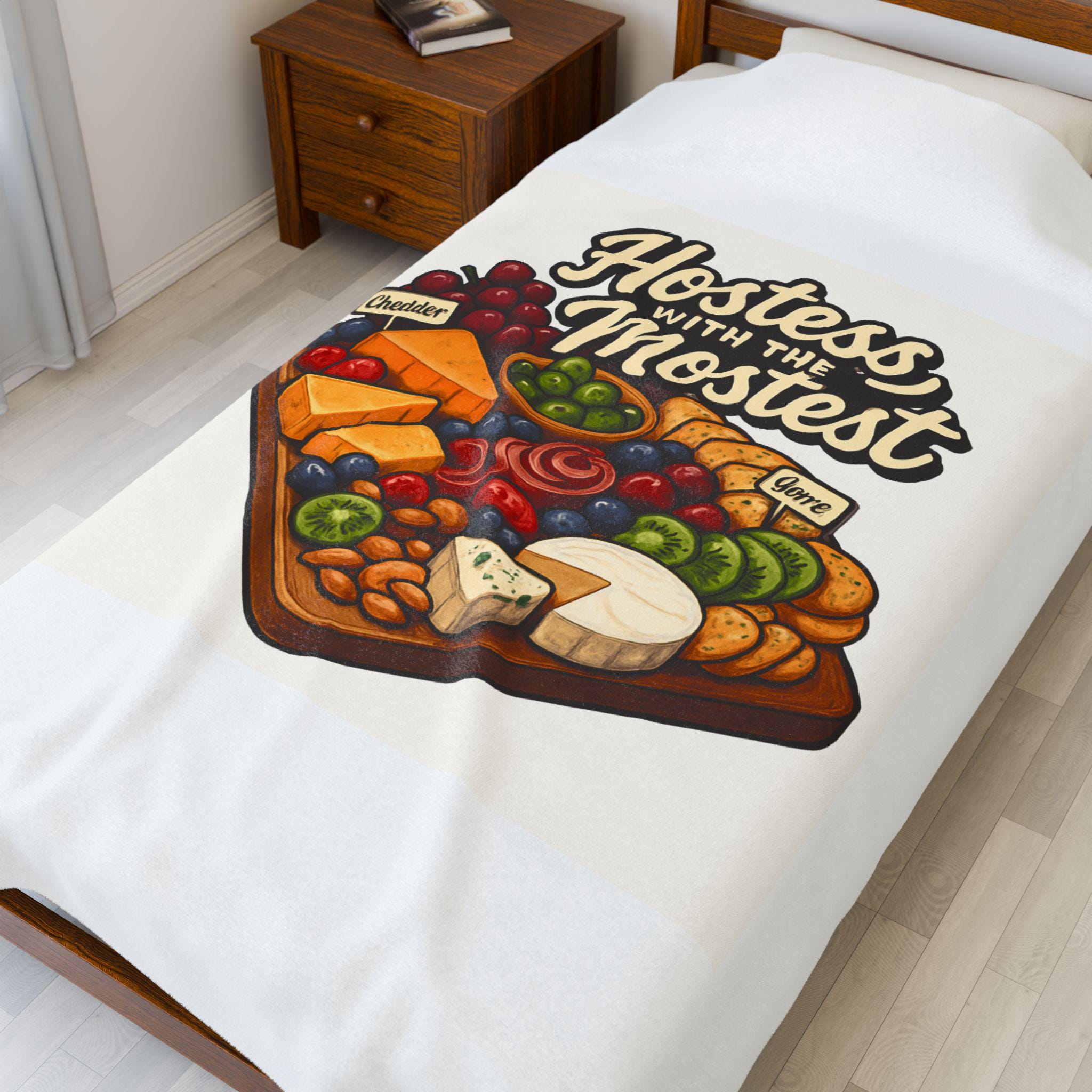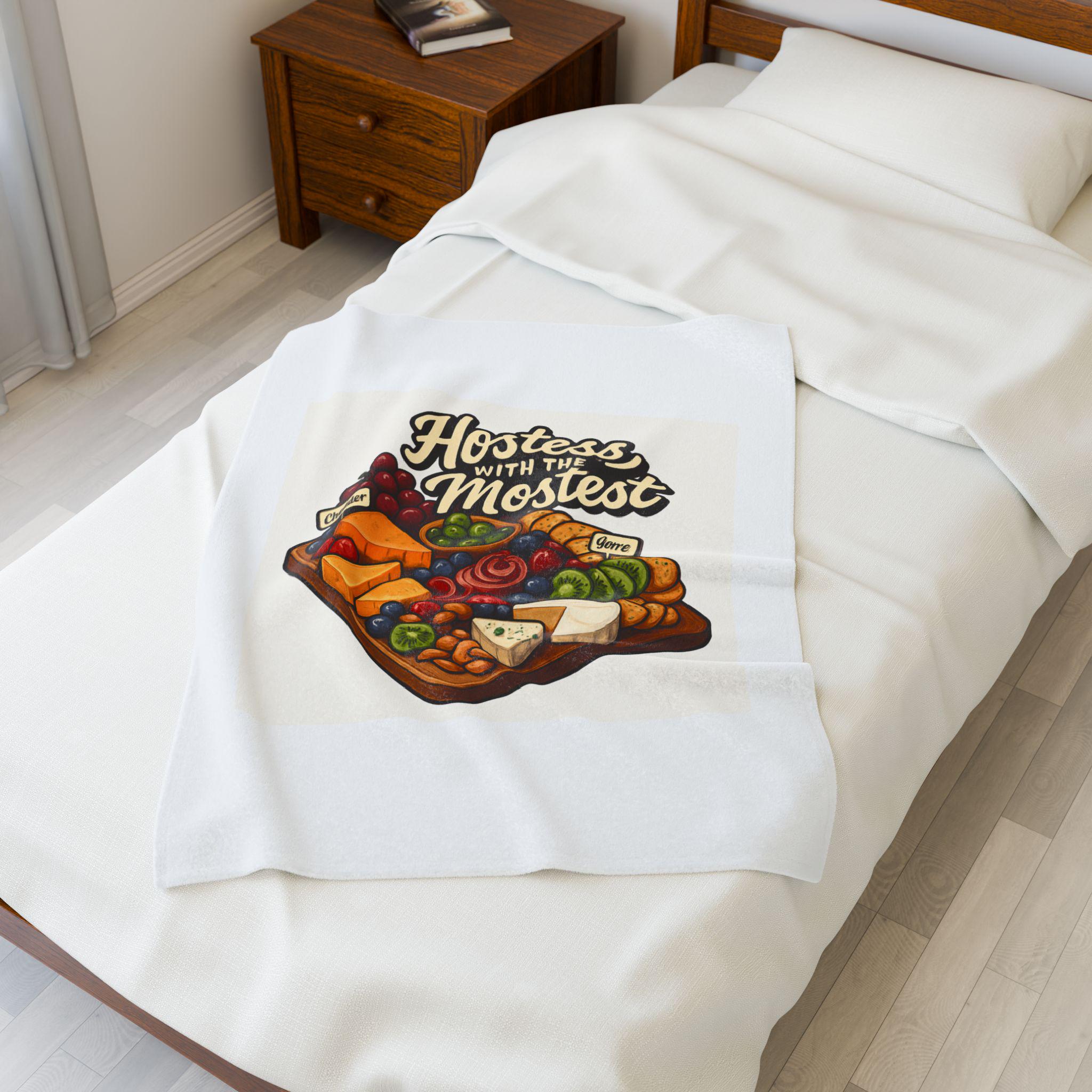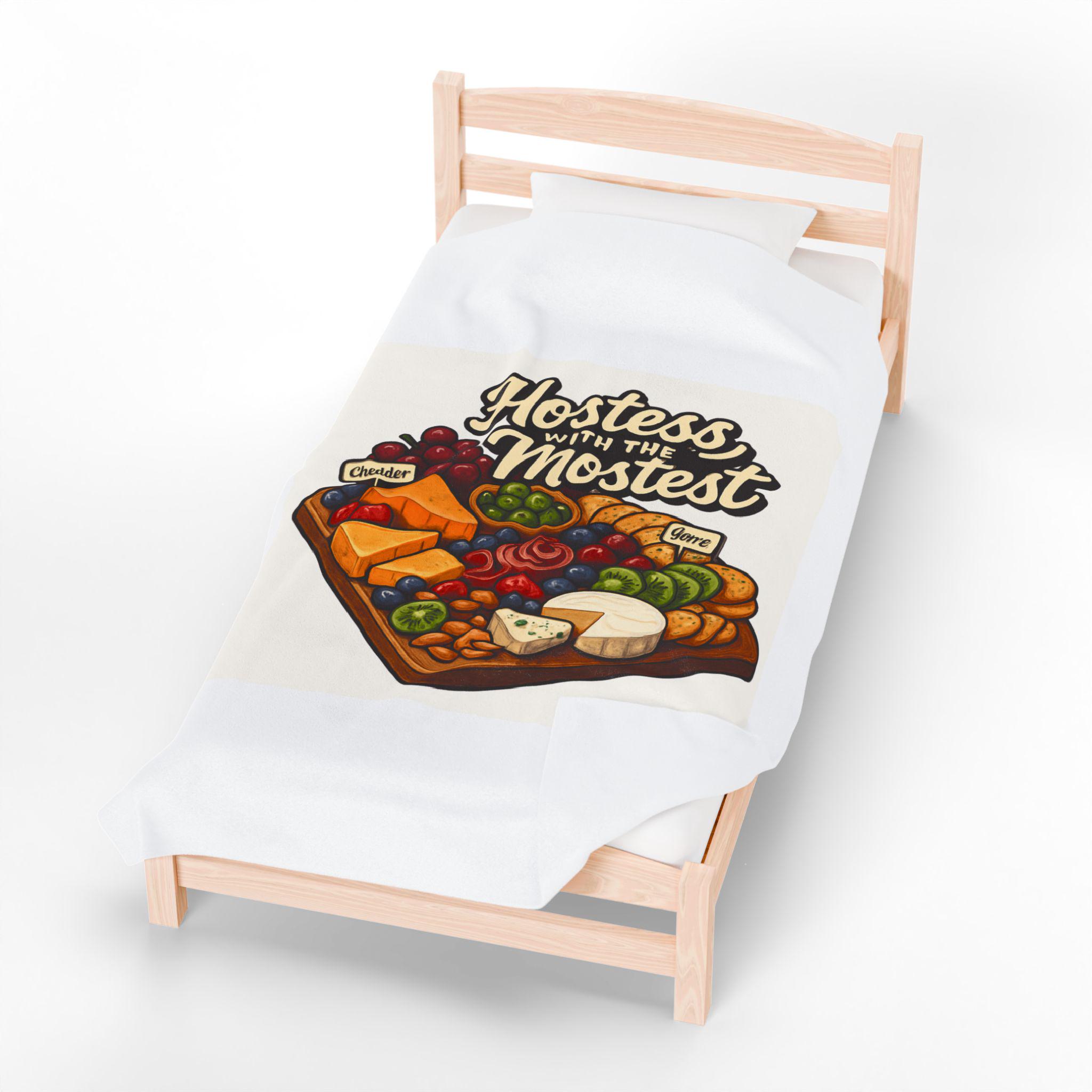 A sumptuously soft velveteen blanket printed with a warm, playful illustration: a loaded cheese and charcuterie board under the hand-lettered phrase “Hostess with the Mostest.” The design pops in rich, vivid color on one side of the medium-weight plush fabric, while the reverse stays clean and cozy. Draped over the couch or folded on a guest chair, it sets a relaxed, welcoming tone and invites lingering conversation and shared plates. Machine-friendly polyester keeps the blanket lightweight, quick-drying, and resilient through many gatherings, while reinforced double-needle topstitching holds up to repeated use.