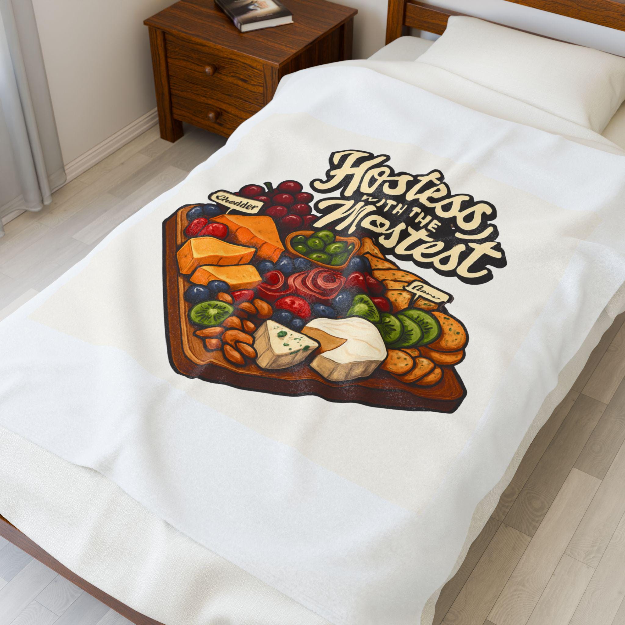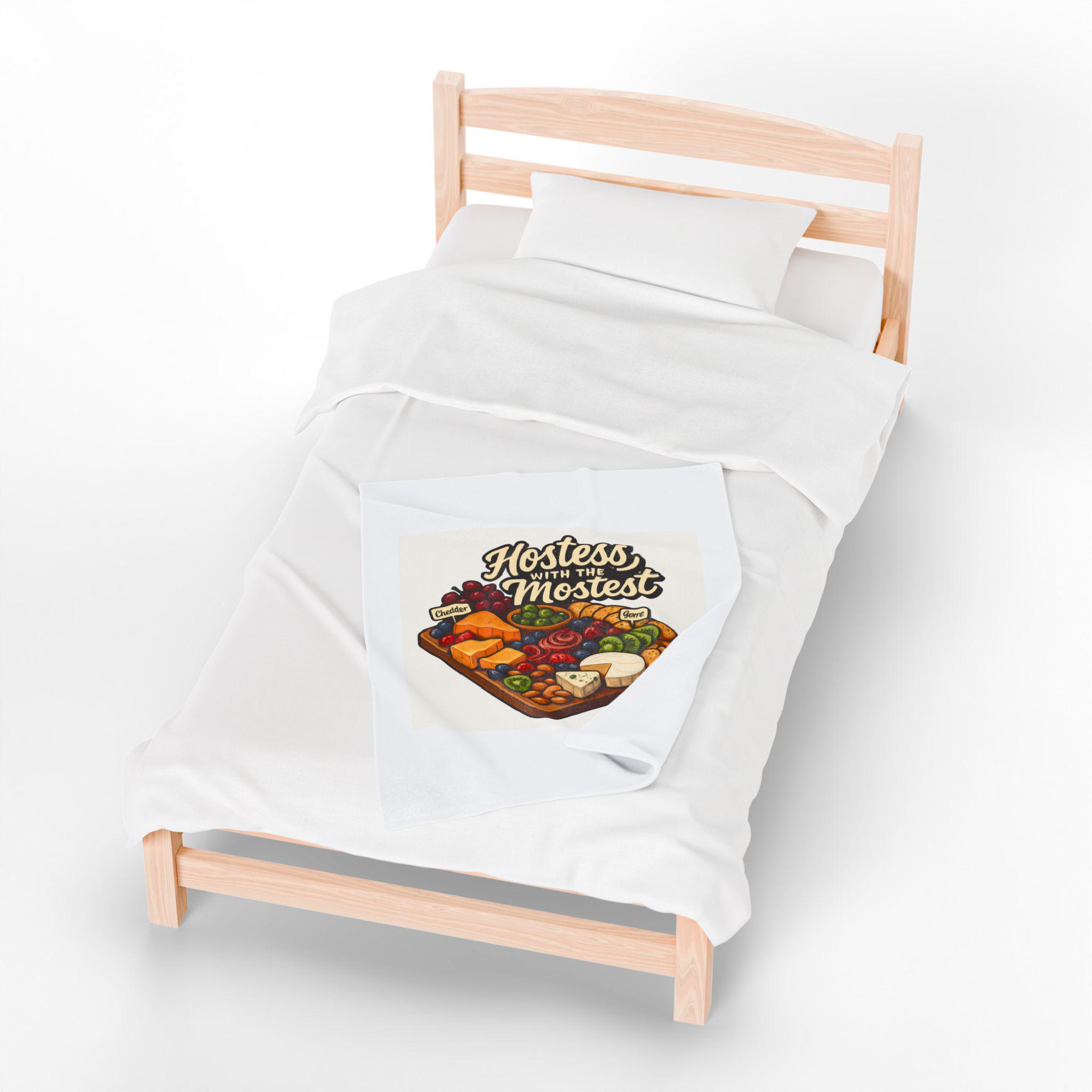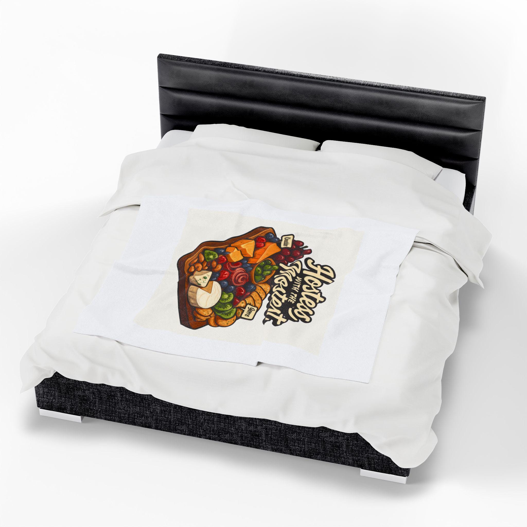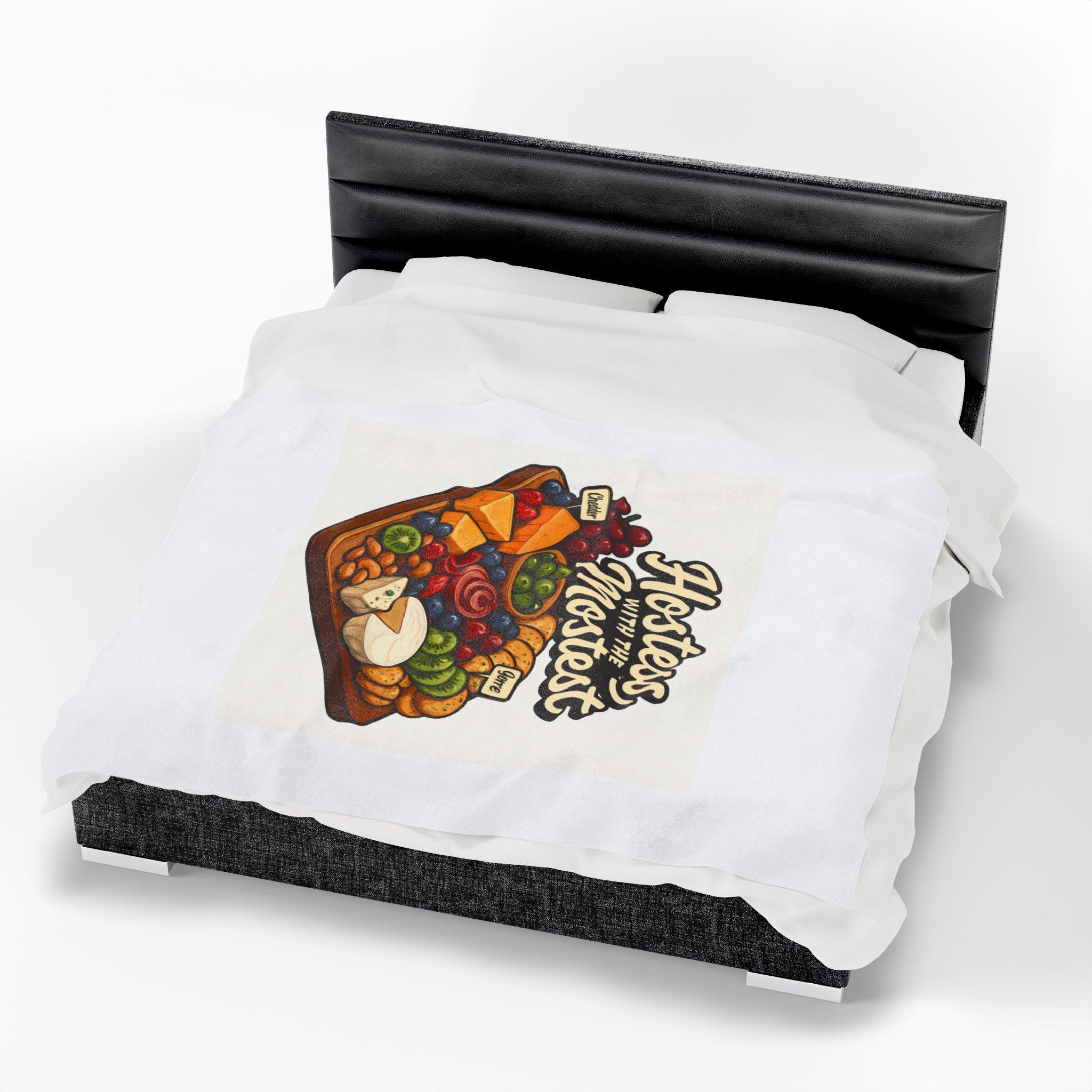 A sumptuously soft velveteen blanket printed with a warm, playful illustration: a loaded cheese and charcuterie board under the hand-lettered phrase “Hostess with the Mostest.” The design pops in rich, vivid color on one side of the medium-weight plush fabric, while the reverse stays clean and cozy. Draped over the couch or folded on a guest chair, it sets a relaxed, welcoming tone and invites lingering conversation and shared plates. Machine-friendly polyester keeps the blanket lightweight, quick-drying, and resilient through many gatherings, while reinforced double-needle topstitching holds up to repeated use.