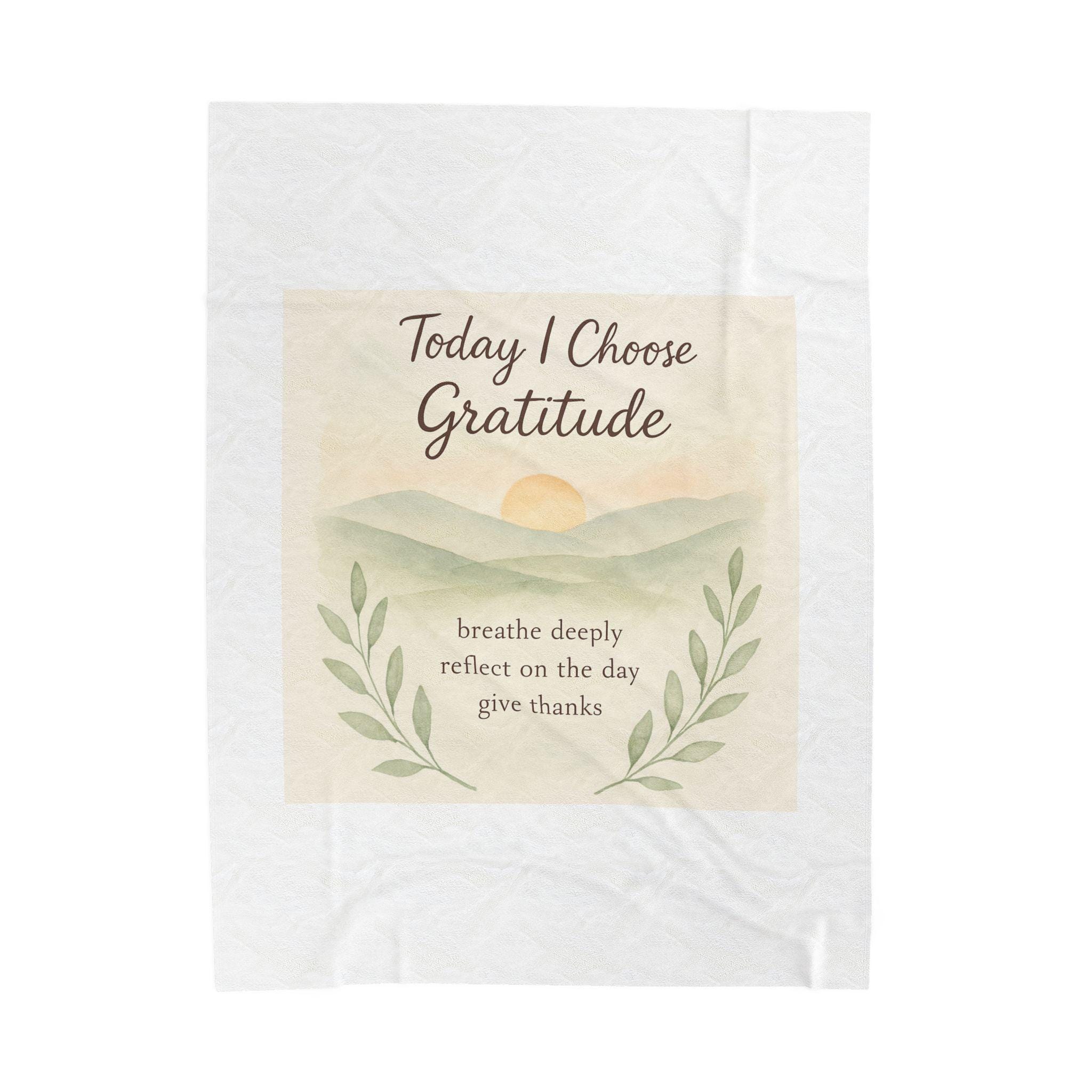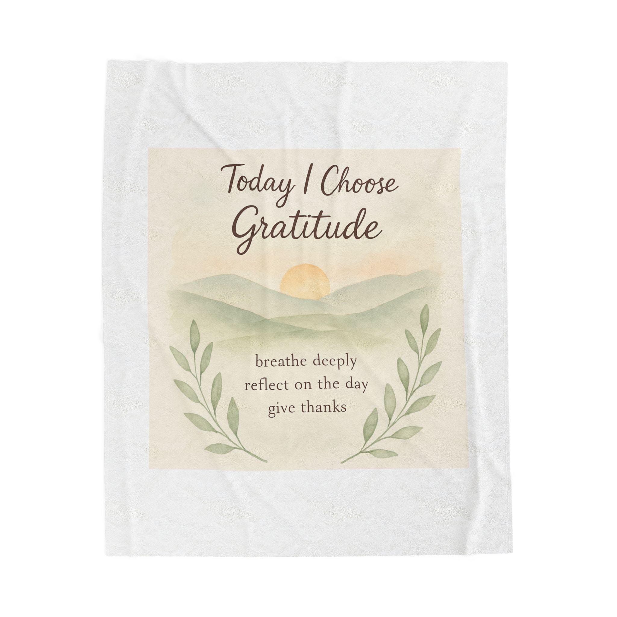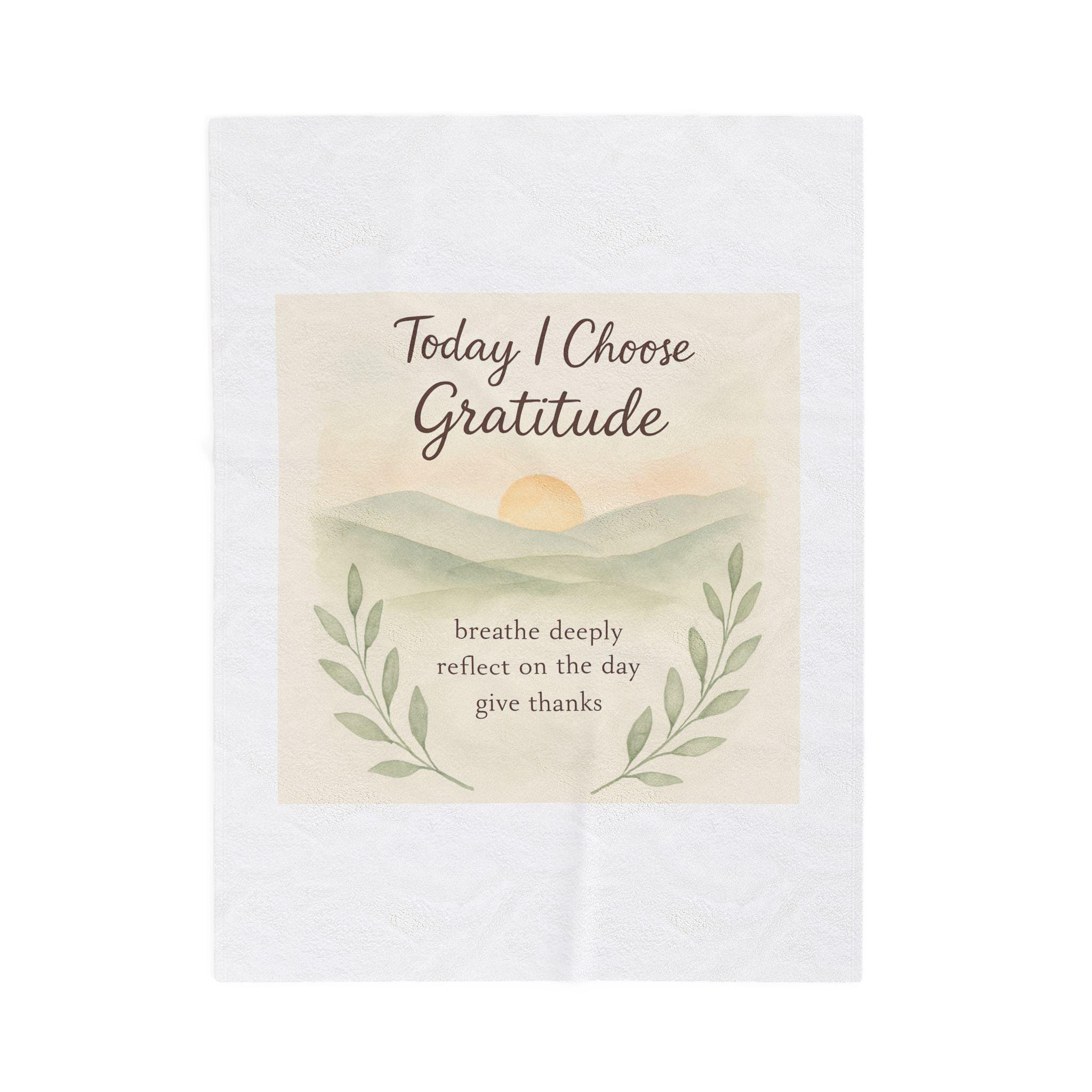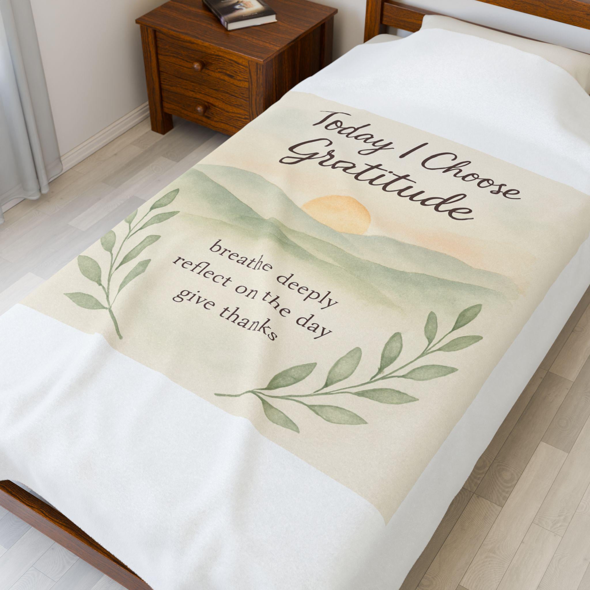 Wrap yourself in a soft, mindful moment. This velveteen plush blanket features a gentle sunrise illustration and the words “Today I Choose Gratitude,” inviting a quiet pause each morning or evening. The plush surface feels warm and soothing against the skin while the printed panel keeps the calming design front-and-center. Drape it over a favorite chair for reflective breathing sessions, tuck it around your shoulders during journaling, or spread it across your lap during slow, restorative evenings. Subtle botanical accents and muted earth tones create a peaceful atmosphere—comfort that encourages presence and gratitude rather than shouting for attention.