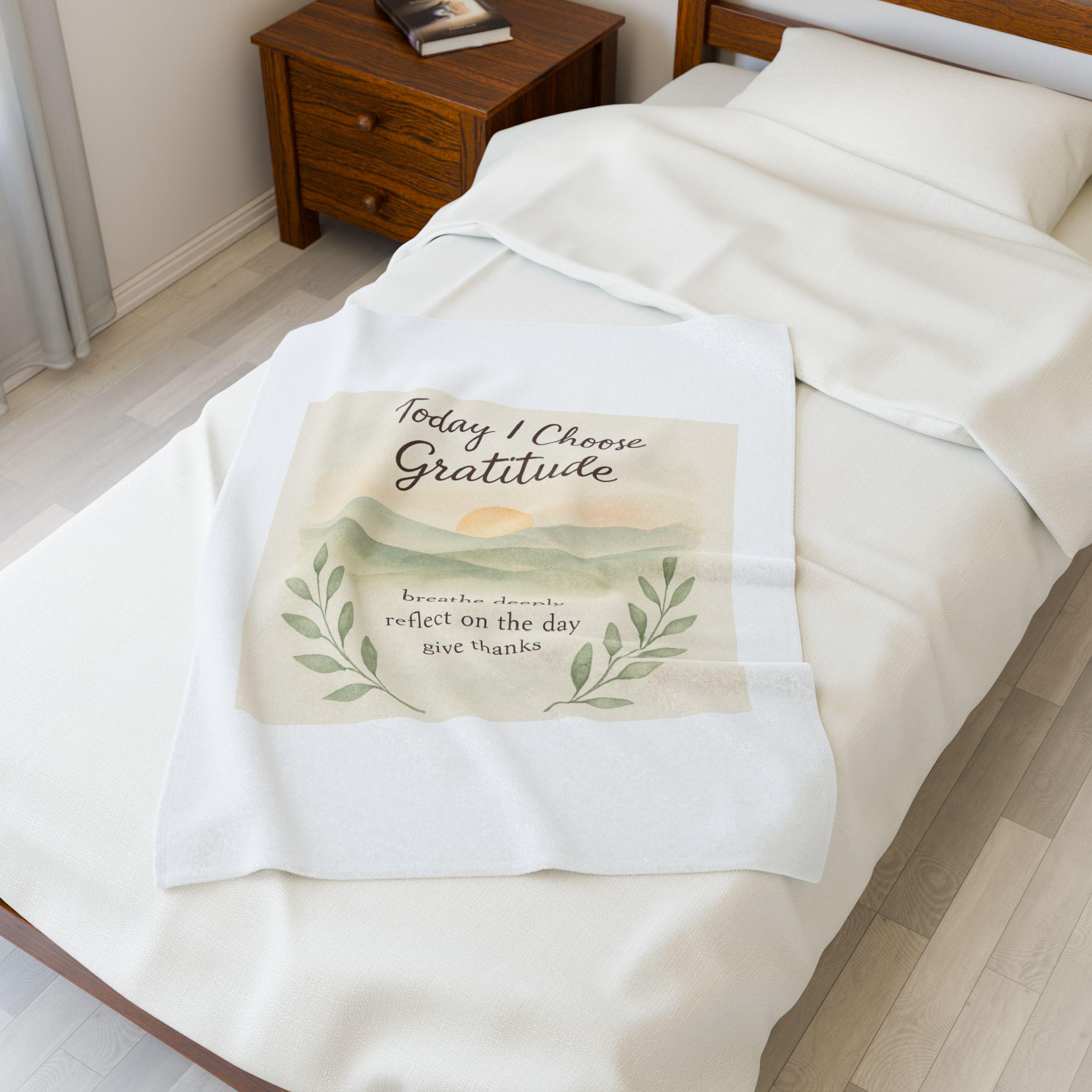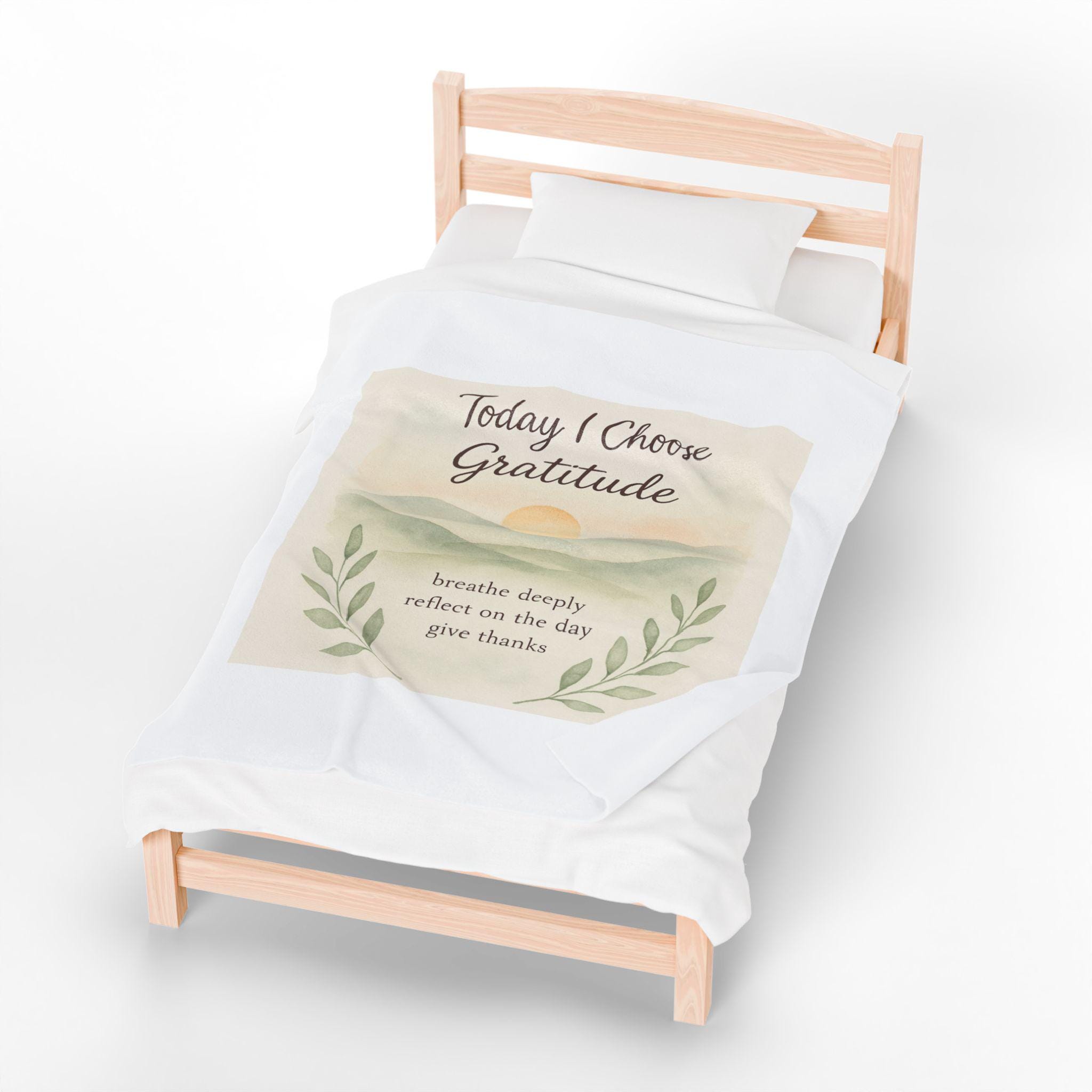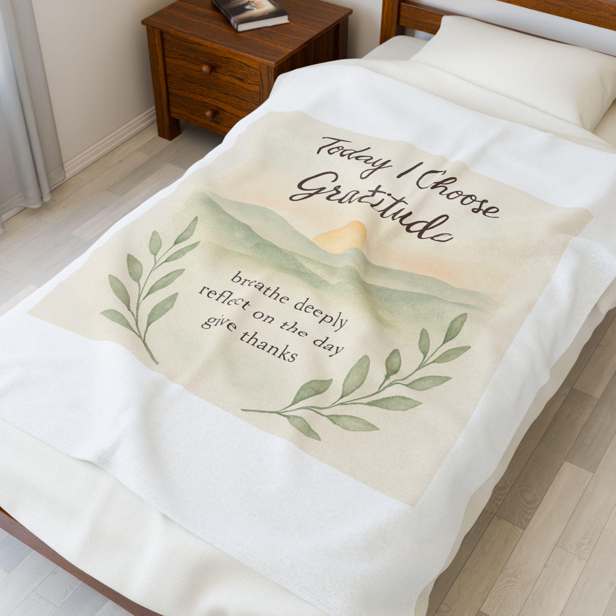 Wrap yourself in a soft, mindful moment. This velveteen plush blanket features a gentle sunrise illustration and the words “Today I Choose Gratitude,” inviting a quiet pause each morning or evening. The plush surface feels warm and soothing against the skin while the printed panel keeps the calming design front-and-center. Drape it over a favorite chair for reflective breathing sessions, tuck it around your shoulders during journaling, or spread it across your lap during slow, restorative evenings. Subtle botanical accents and muted earth tones create a peaceful atmosphere—comfort that encourages presence and gratitude rather than shouting for attention.