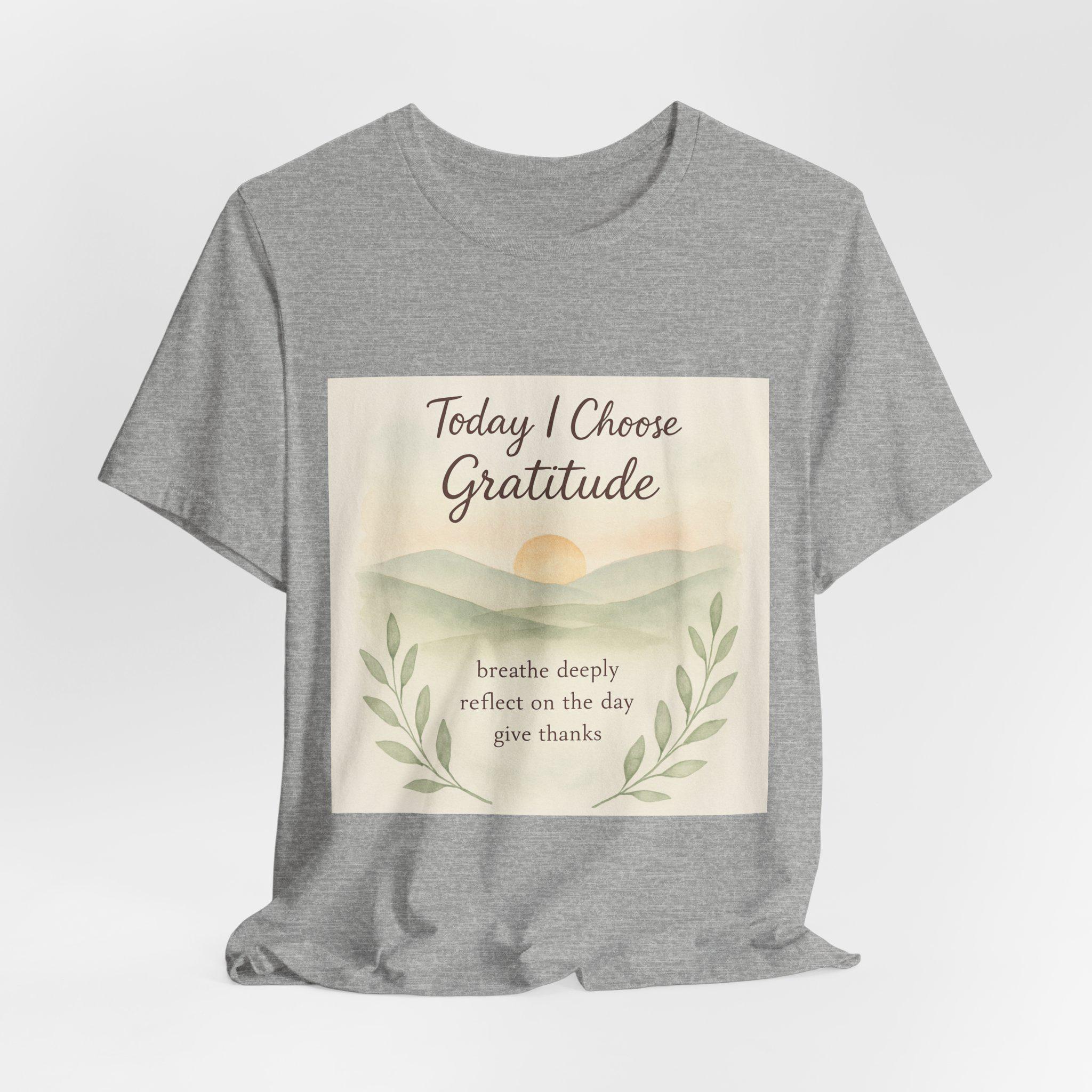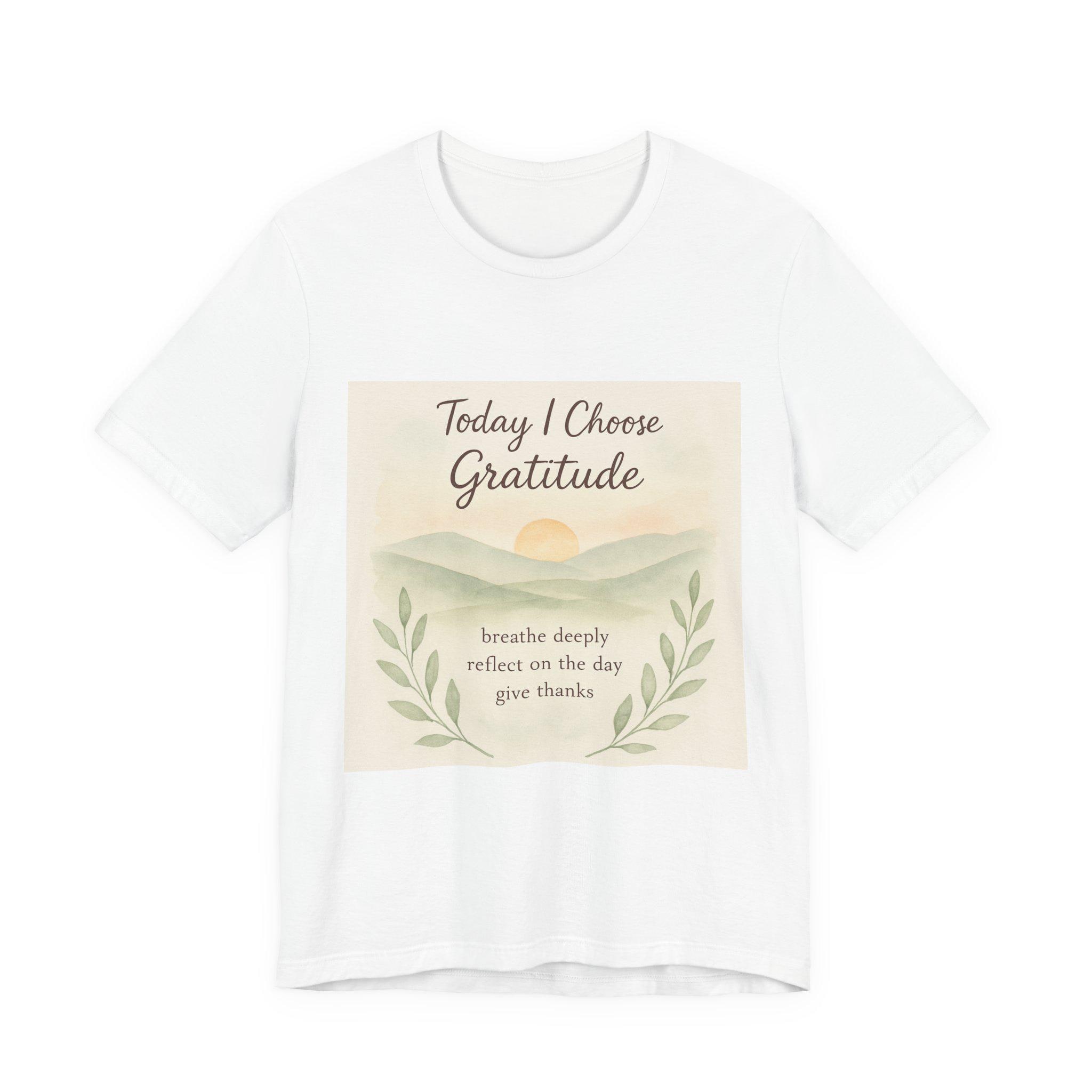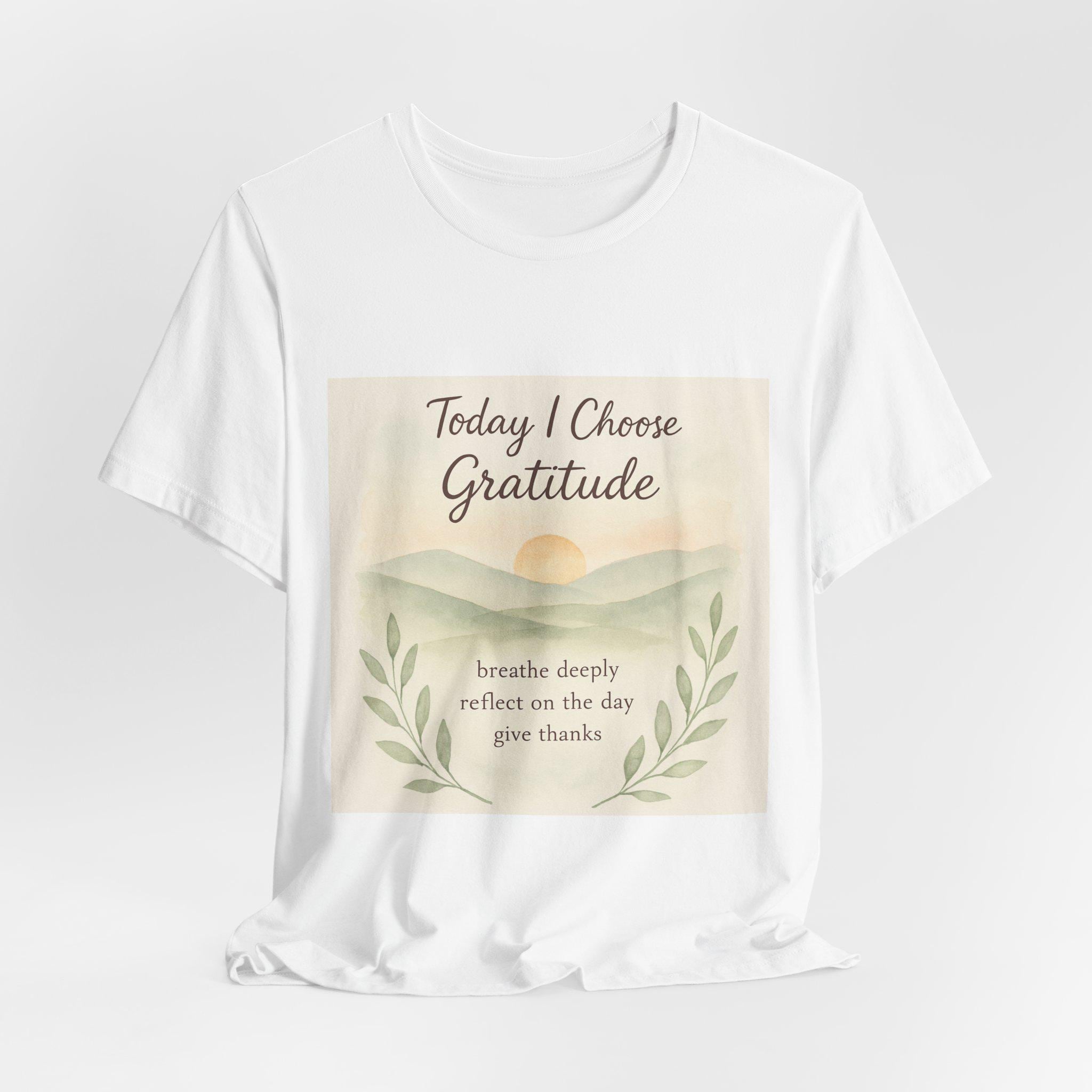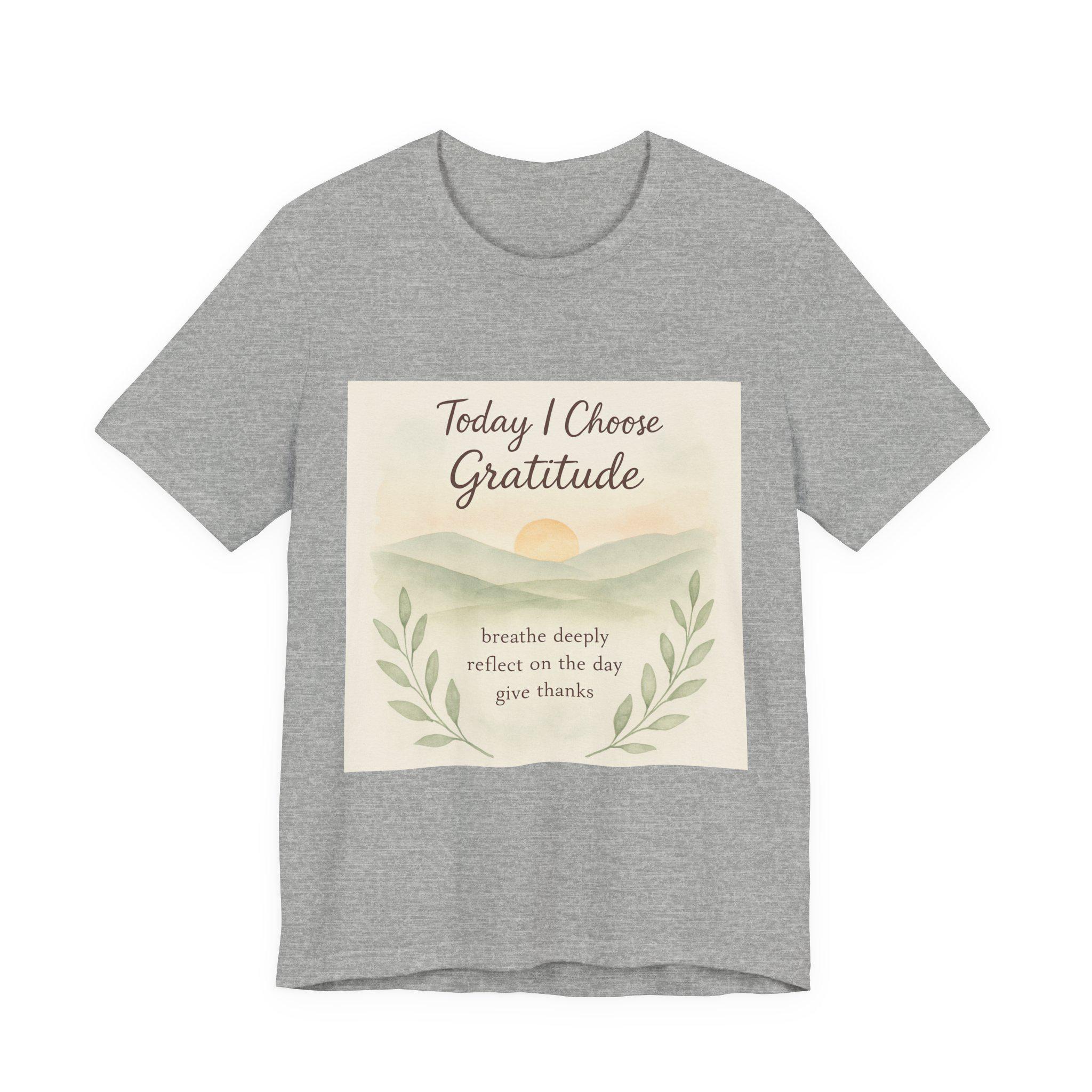 Soft, breathable tee designed to carry a quiet, grounding message. A gentle sunrise illustration and calming script read “Today I Choose Gratitude,” surrounded by delicate laurel leaves — a wearable reminder to breathe, reflect, and give thanks. Lightweight Airlume cotton keeps you comfortable through morning routines, slow walks, or cozy moments at home. The retail crew neckline and clean silhouette layer easily under jackets or pair simply with jeans for a relaxed, intentional look.