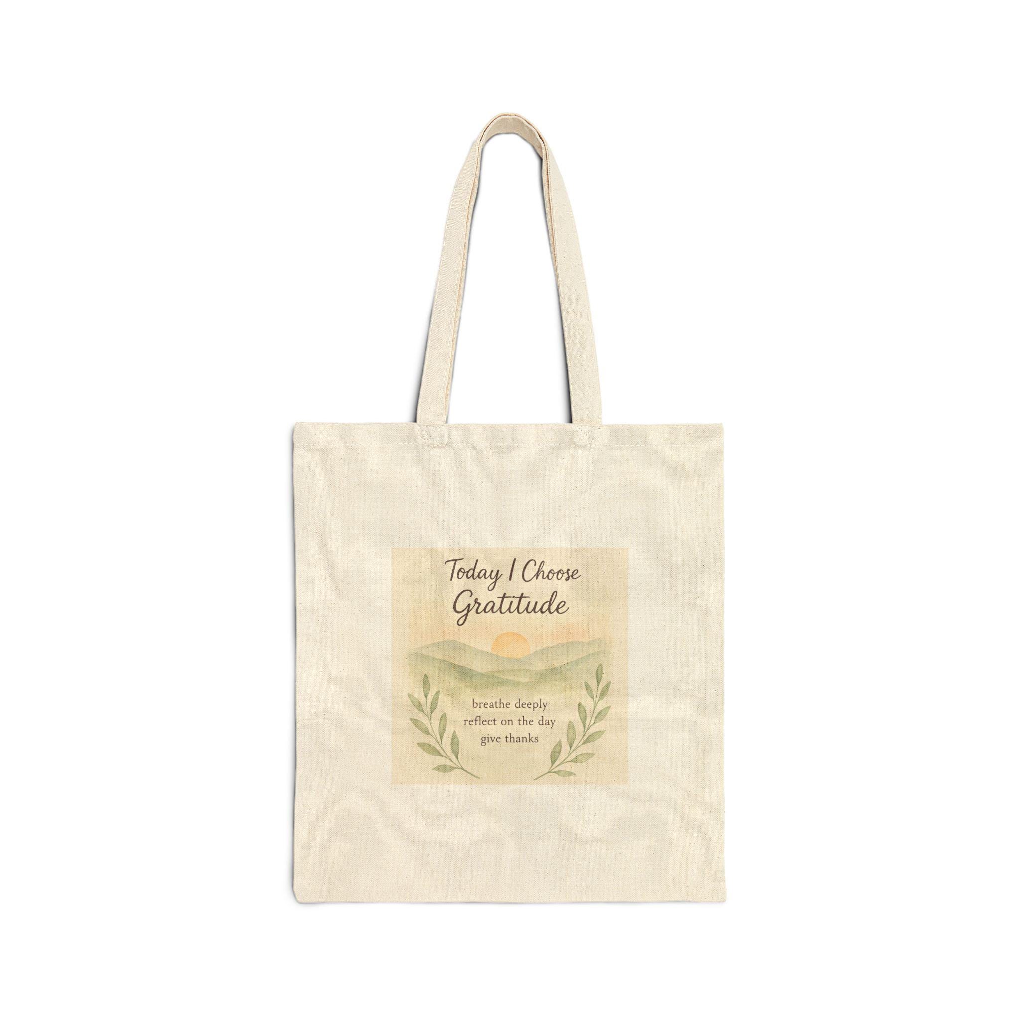 Lightweight, dependable, and warmly inspirational — this cotton canvas tote carries your day with quiet intention. The natural canvas and calming front print invite a moment of pause: a gentle reminder to choose gratitude amid errands, library runs, or market mornings. The flat-corner construction keeps the silhouette slim and tidy while the reinforced self-fabric handles stand up to daily use. It folds easily into a pocket or hangs by the door so you reach for it when you want calm, practical style that speaks softly.