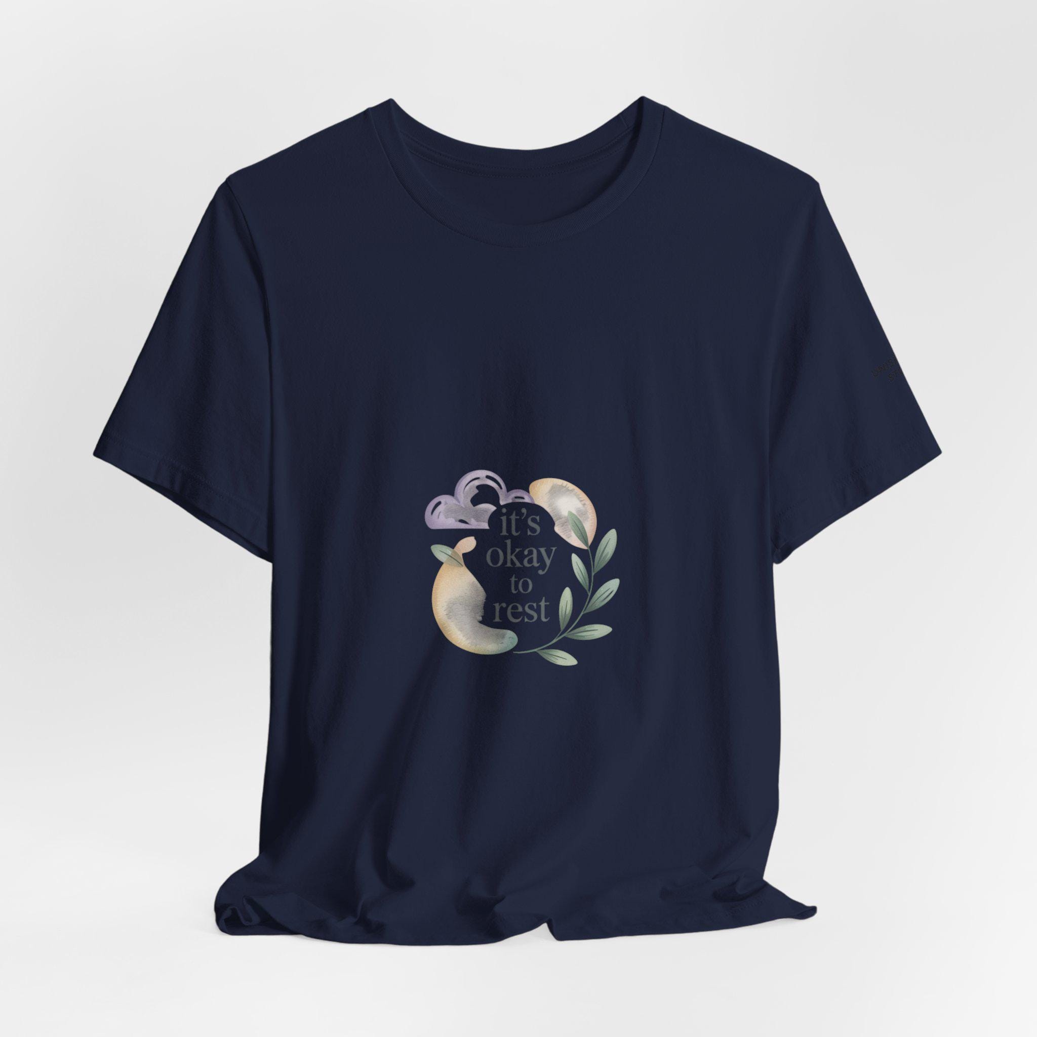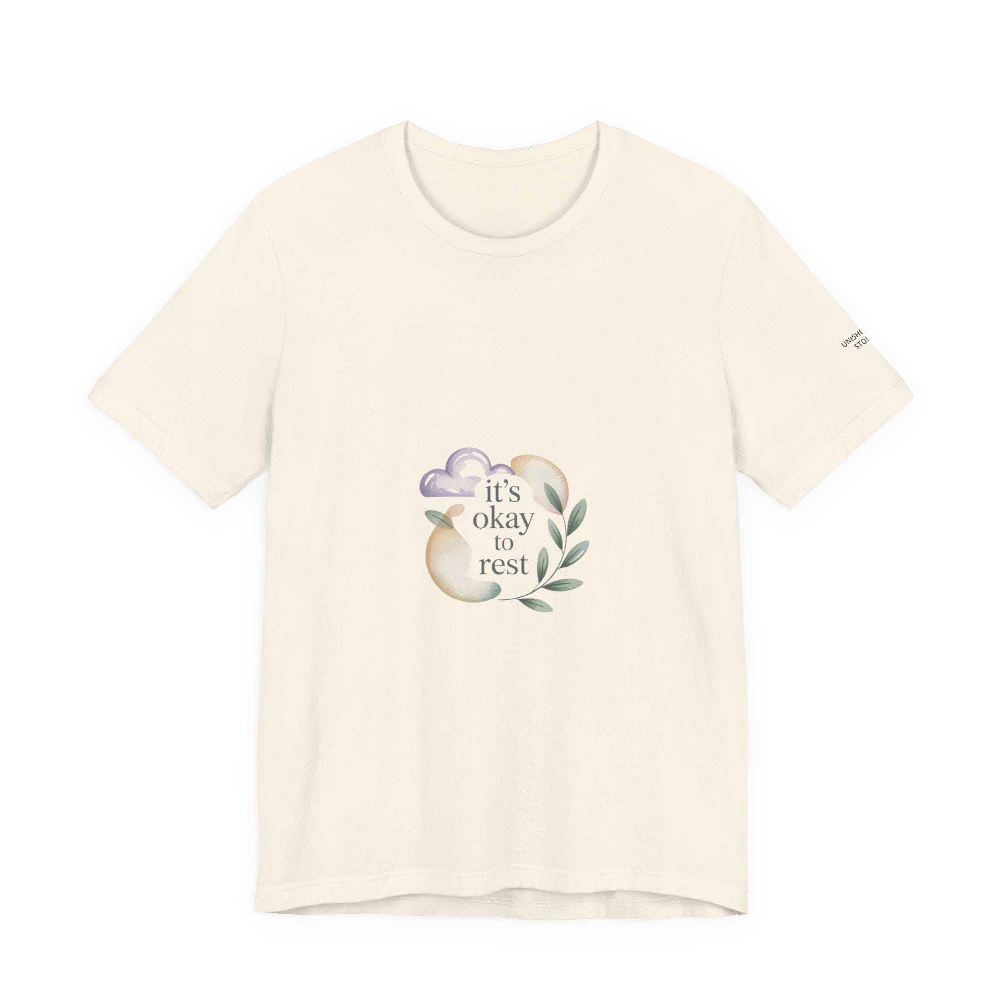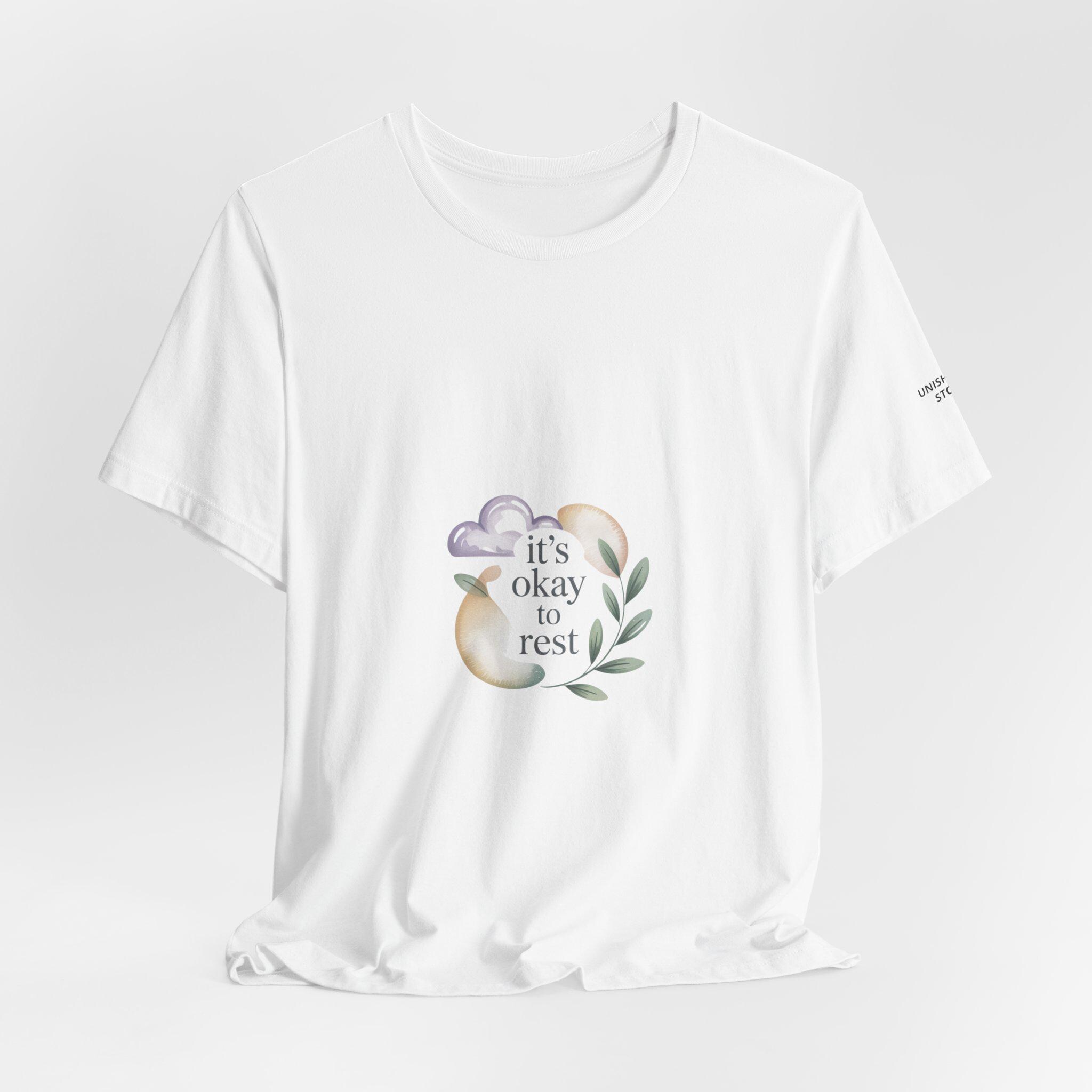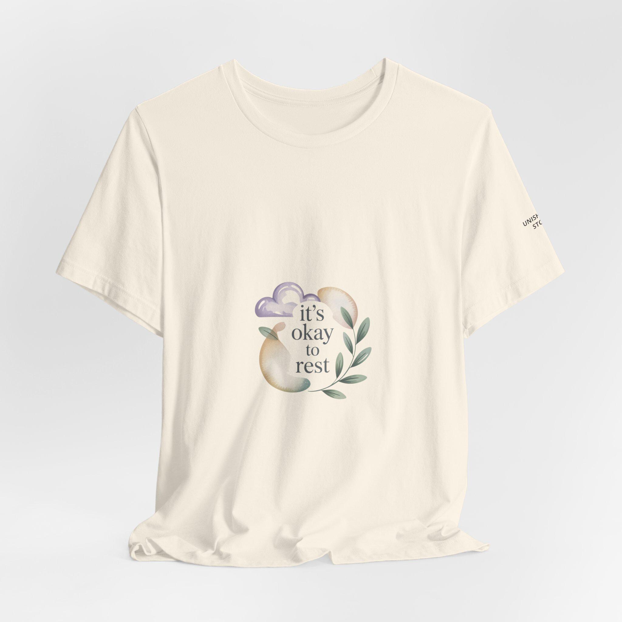Soft, low-energy affirmation tee featuring a gentle pastel illustration and a short validating line that emphasizes rest and self-compassion. The artwork pairs a muted crescent moon, a sleepy cloud, and a small sprig in cream-and-pastel tones with light serif text reading a calm reassurance. Designed to blend into everyday wear for burnout-aware buyers who prefer subtle, soothing messages that normalize slowing down.