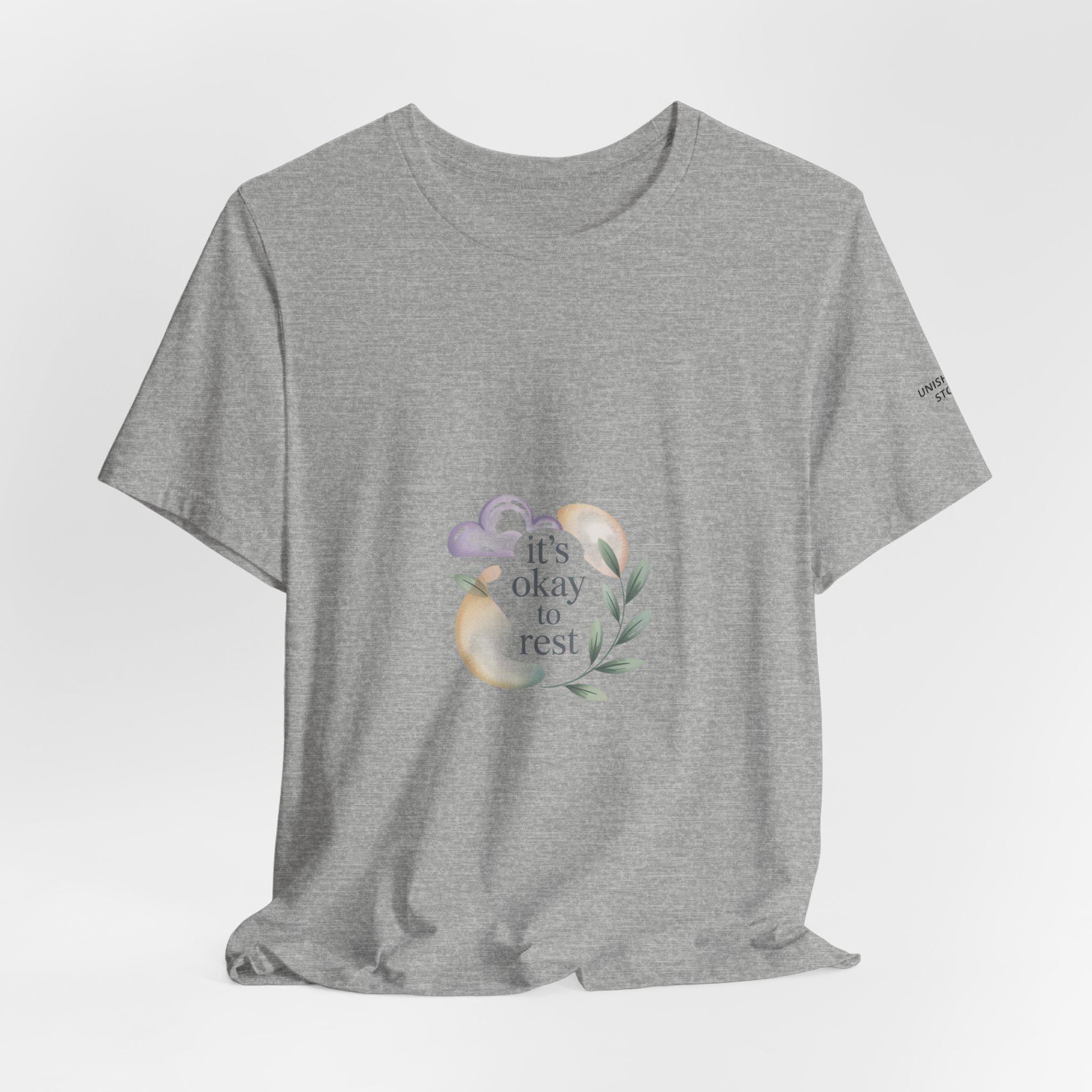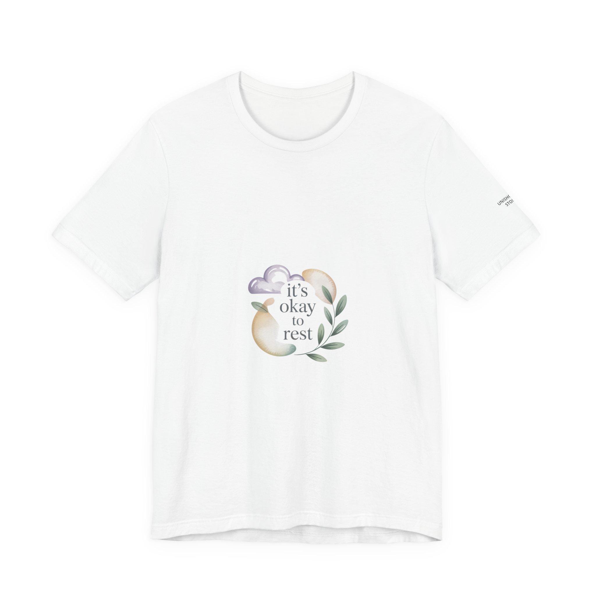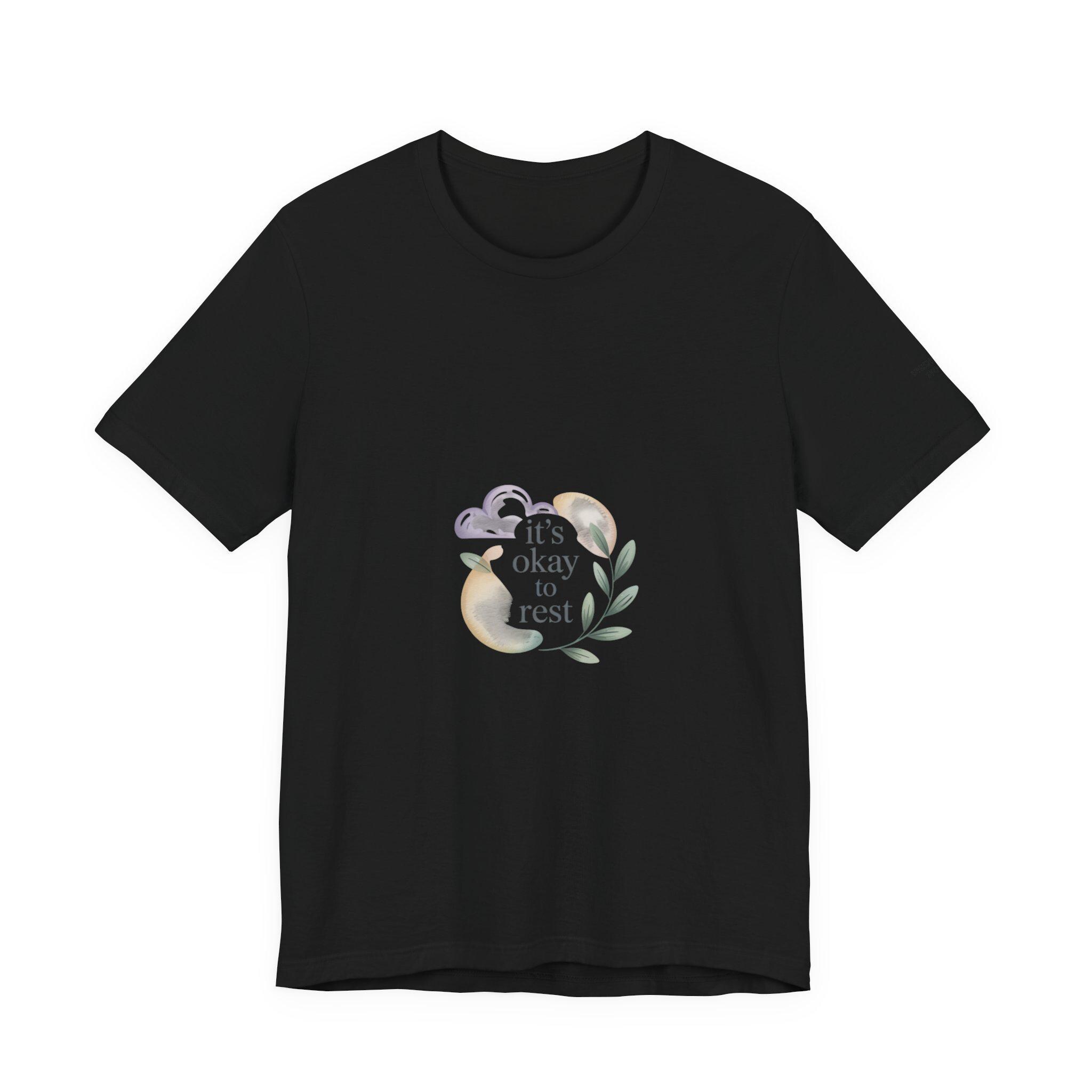 Soft, low-energy affirmation tee featuring a gentle pastel illustration and a short validating line that emphasizes rest and self-compassion. The artwork pairs a muted crescent moon, a sleepy cloud, and a small sprig in cream-and-pastel tones with light serif text reading a calm reassurance. Designed to blend into everyday wear for burnout-aware buyers who prefer subtle, soothing messages that normalize slowing down.