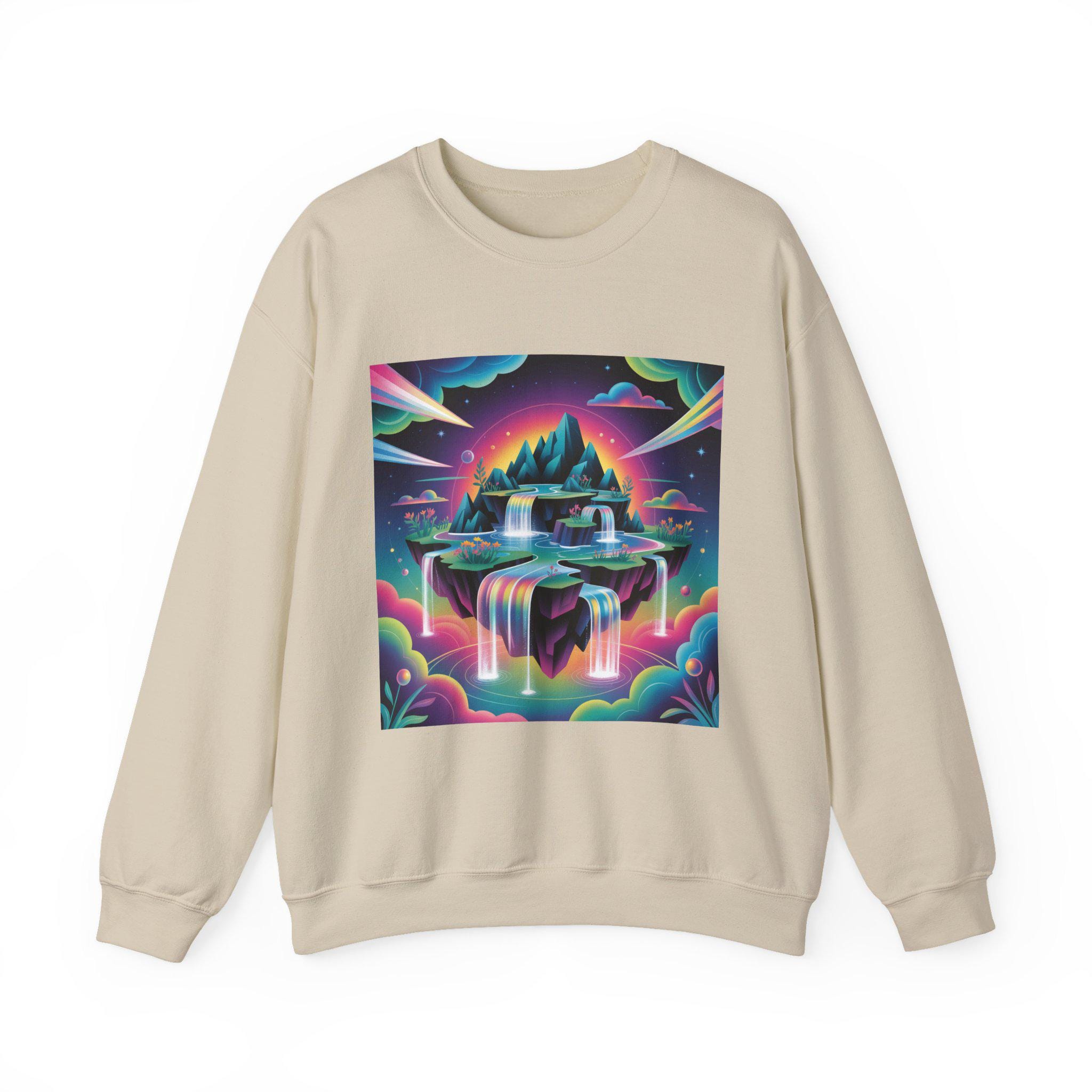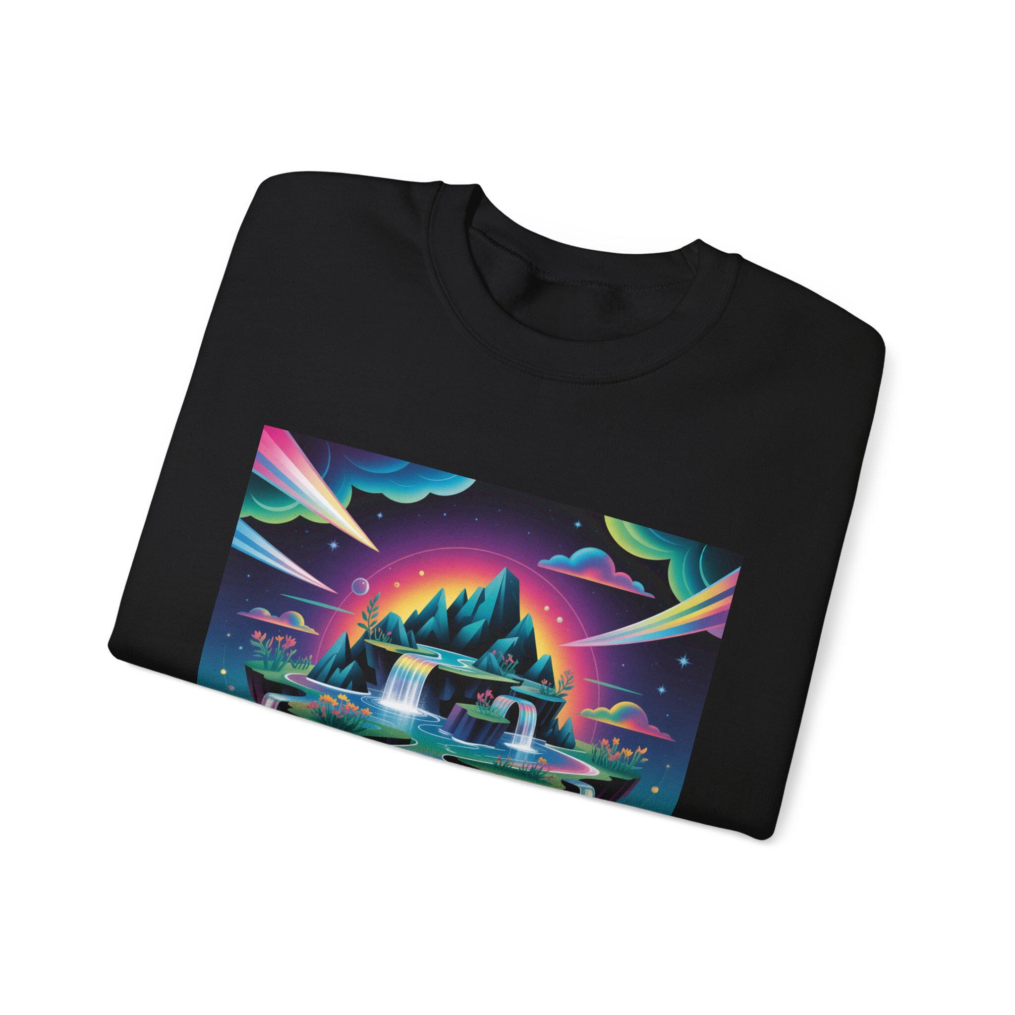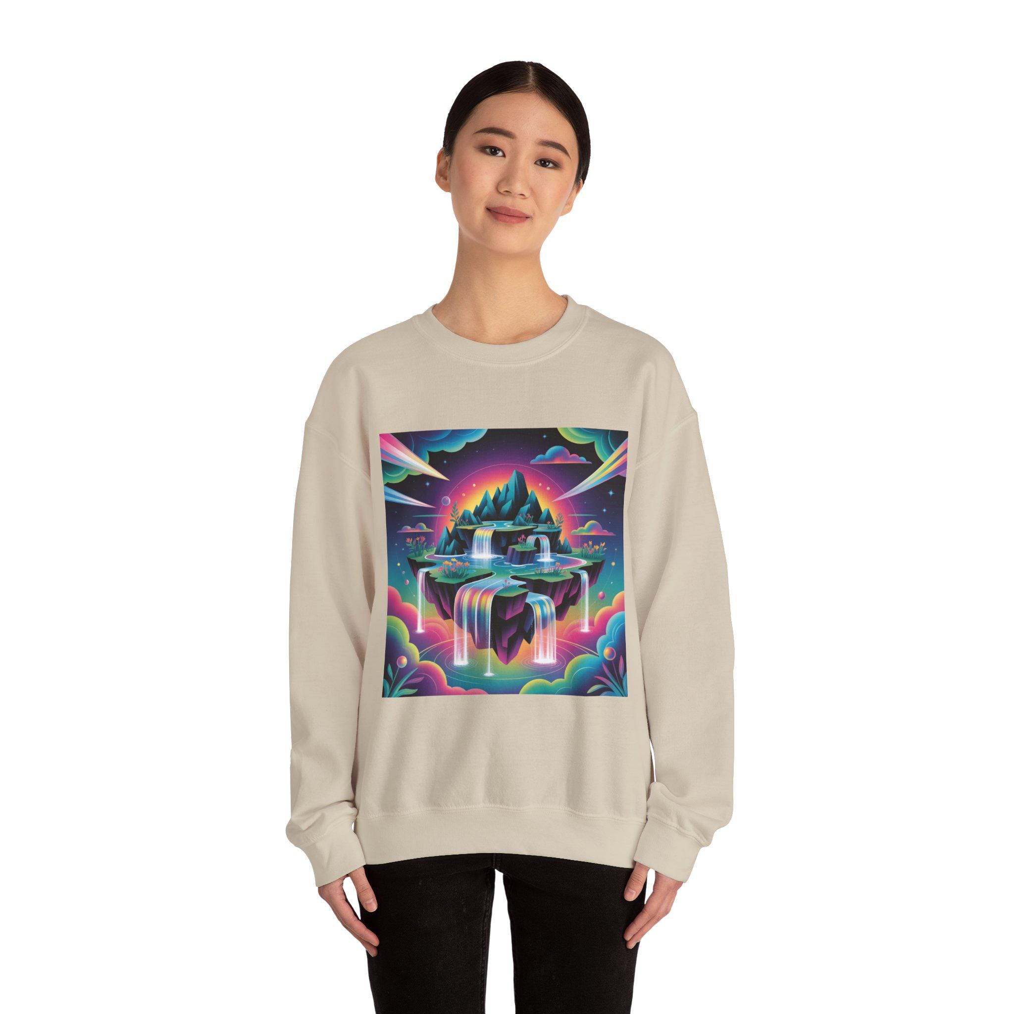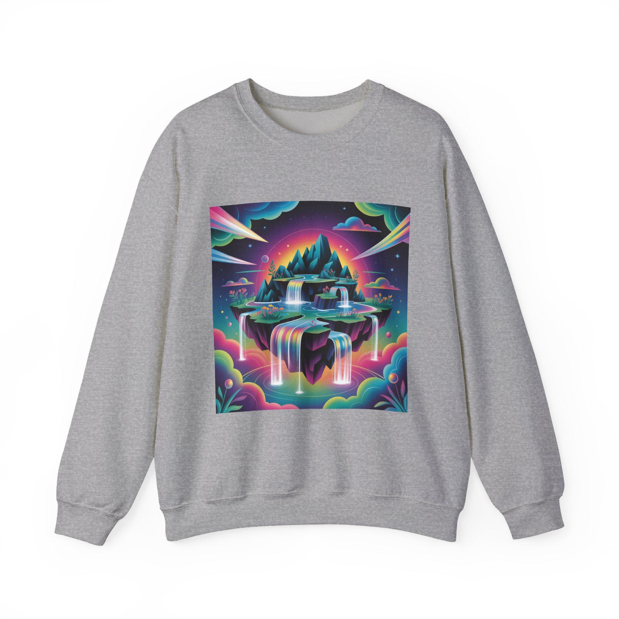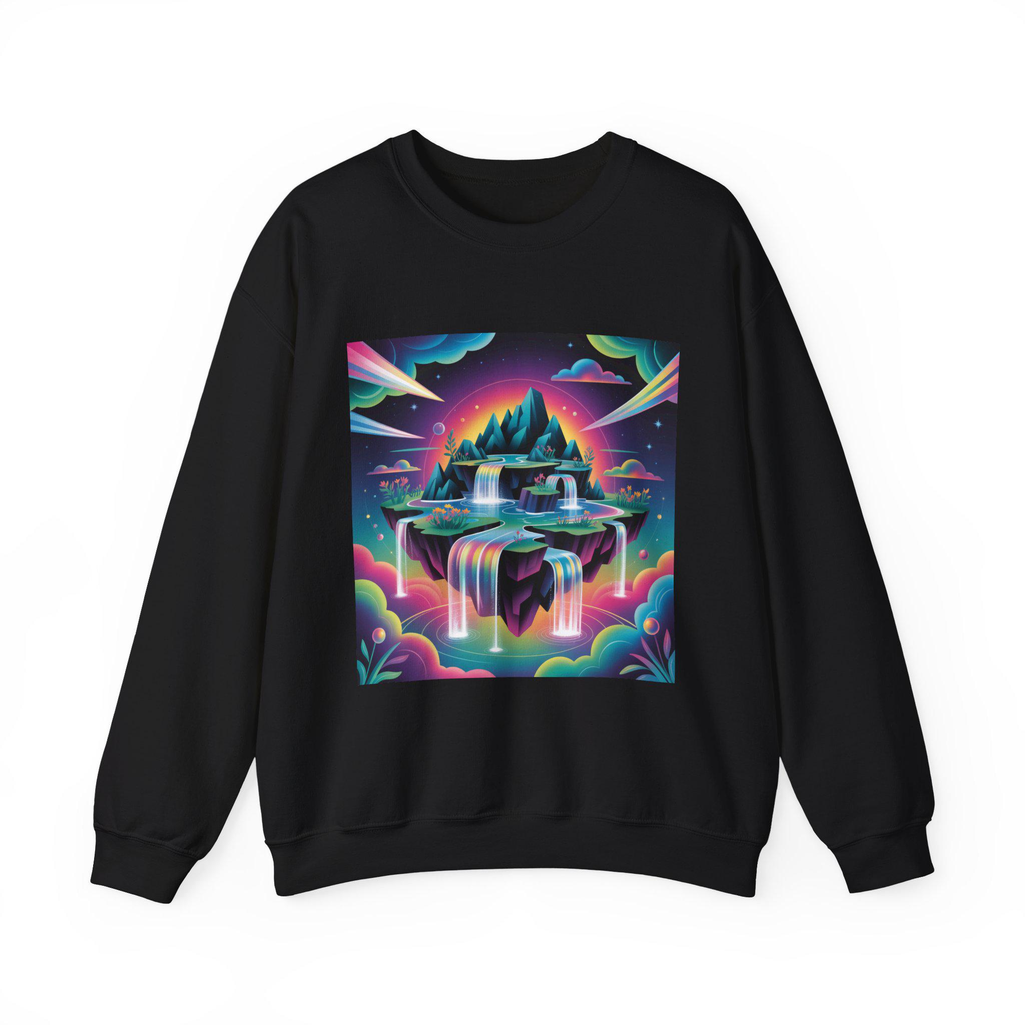 A neon-drenched dreamscape sweatshirt that blends surreal landscape motifs with futuristic gradient colorwork. The print shows a floating island and cascading waterfalls rendered in vivid iridescent hues and high-contrast tones, matching the AI art & dreamscape trend’s emphasis on bold gradients and unexpected juxtapositions. The crew sweatshirt’s clean silhouette and sleek placement let the artwork read like a wearable digital poster for fans of forward-looking, experimental visuals.