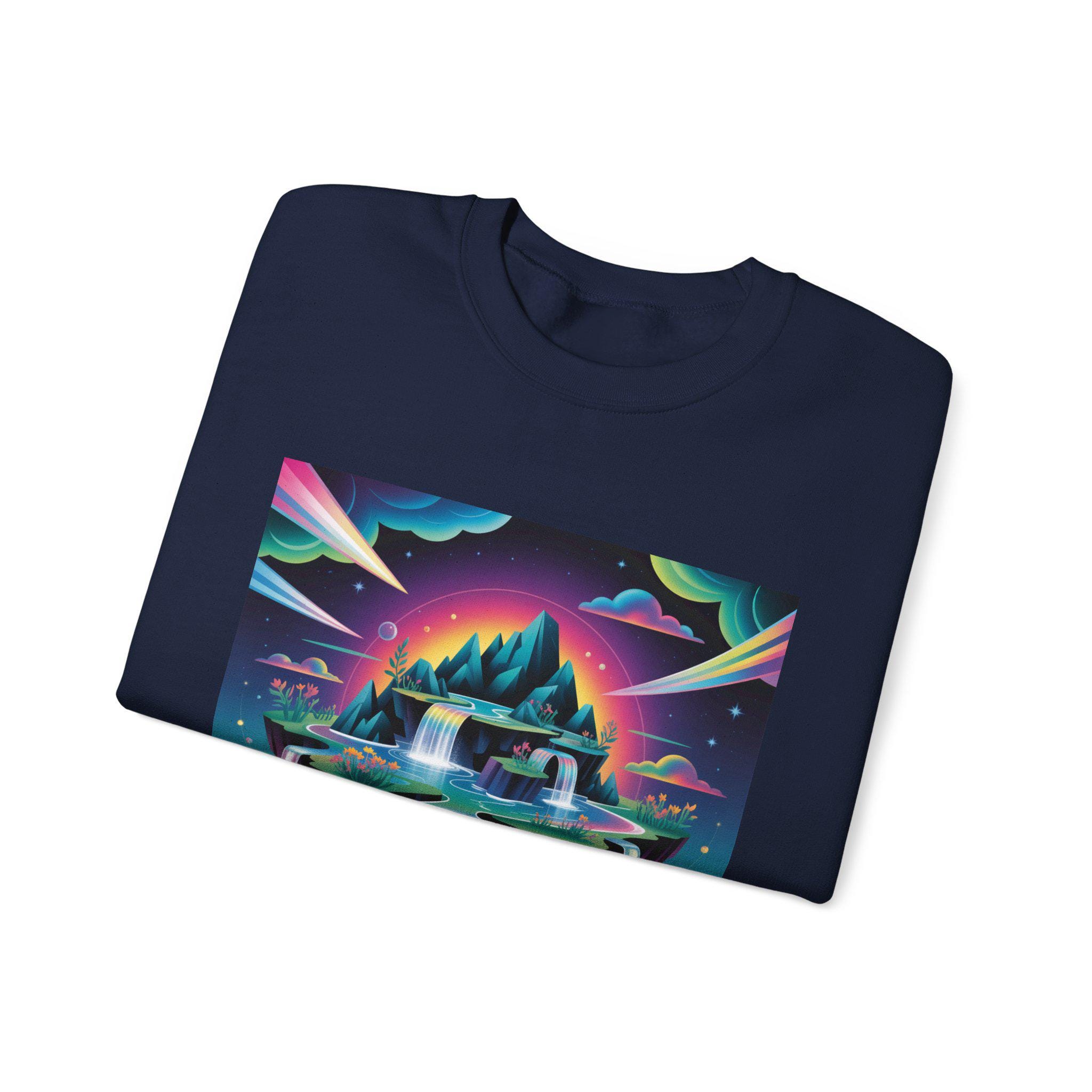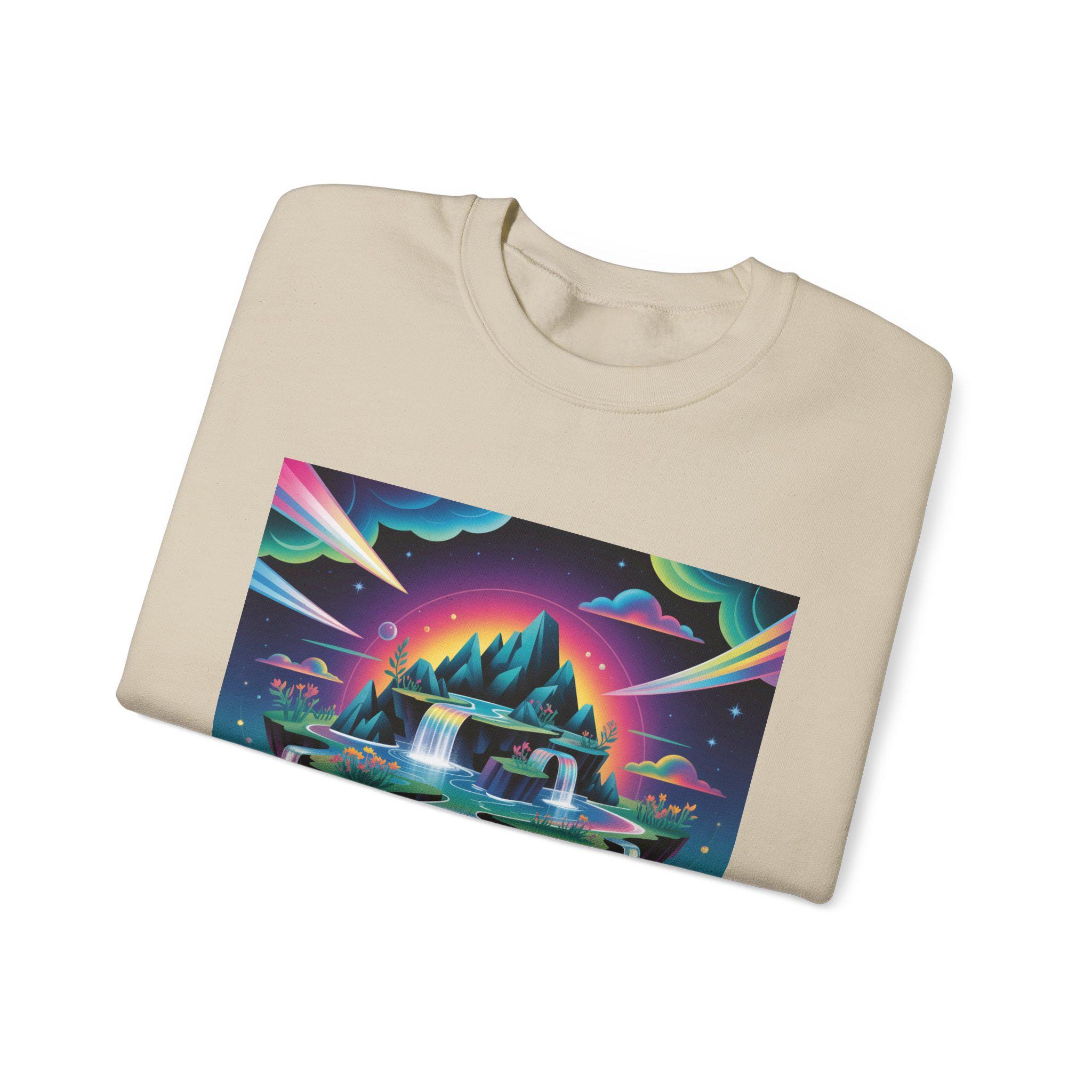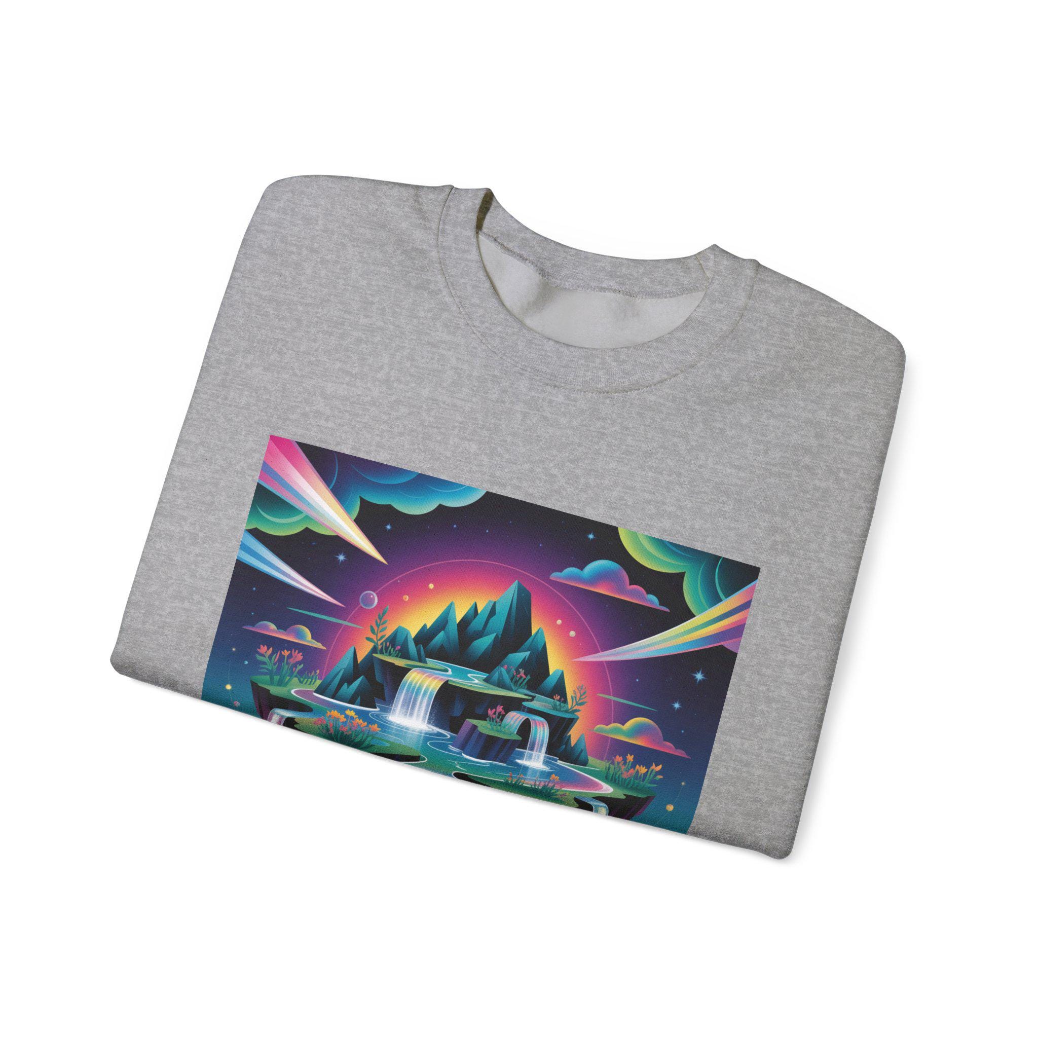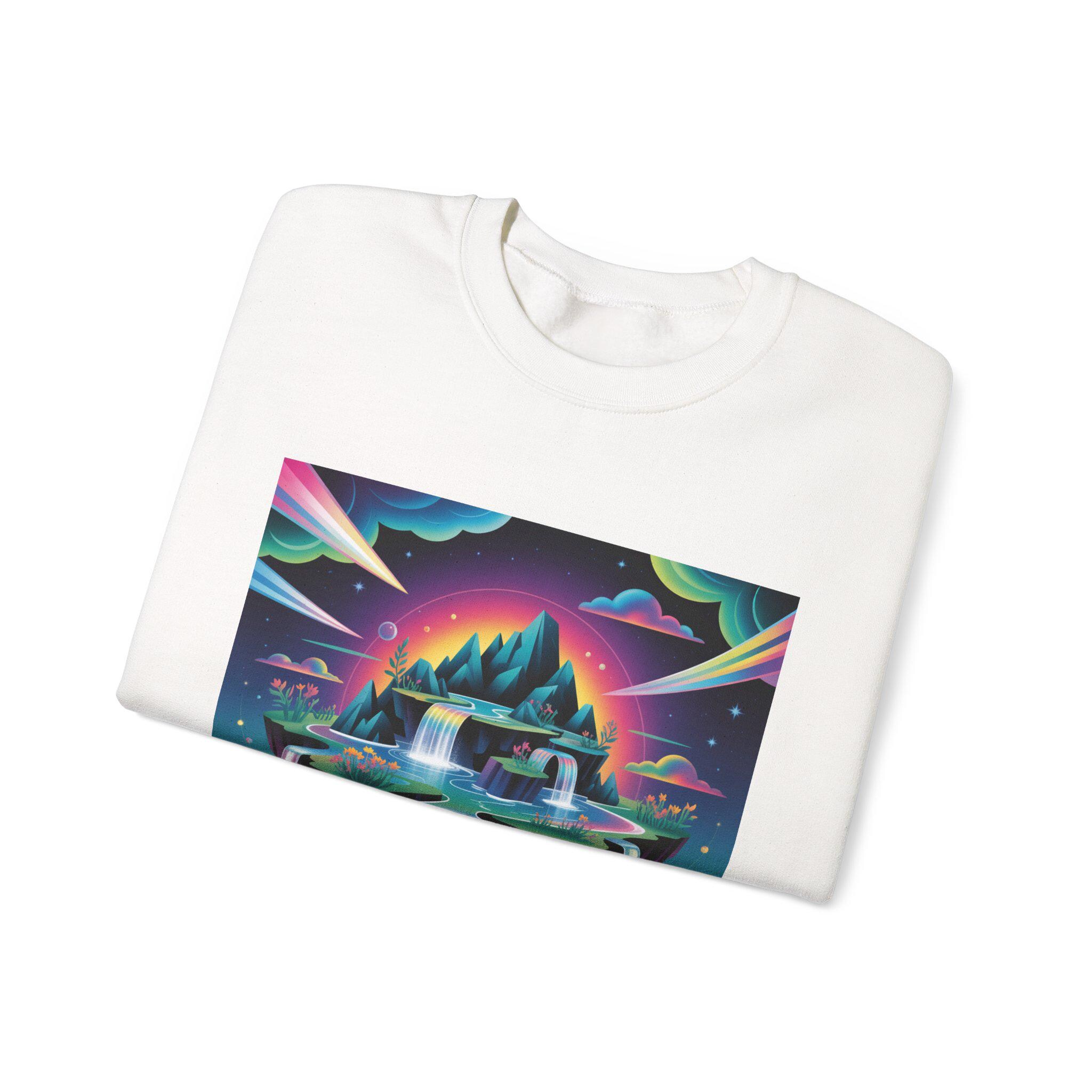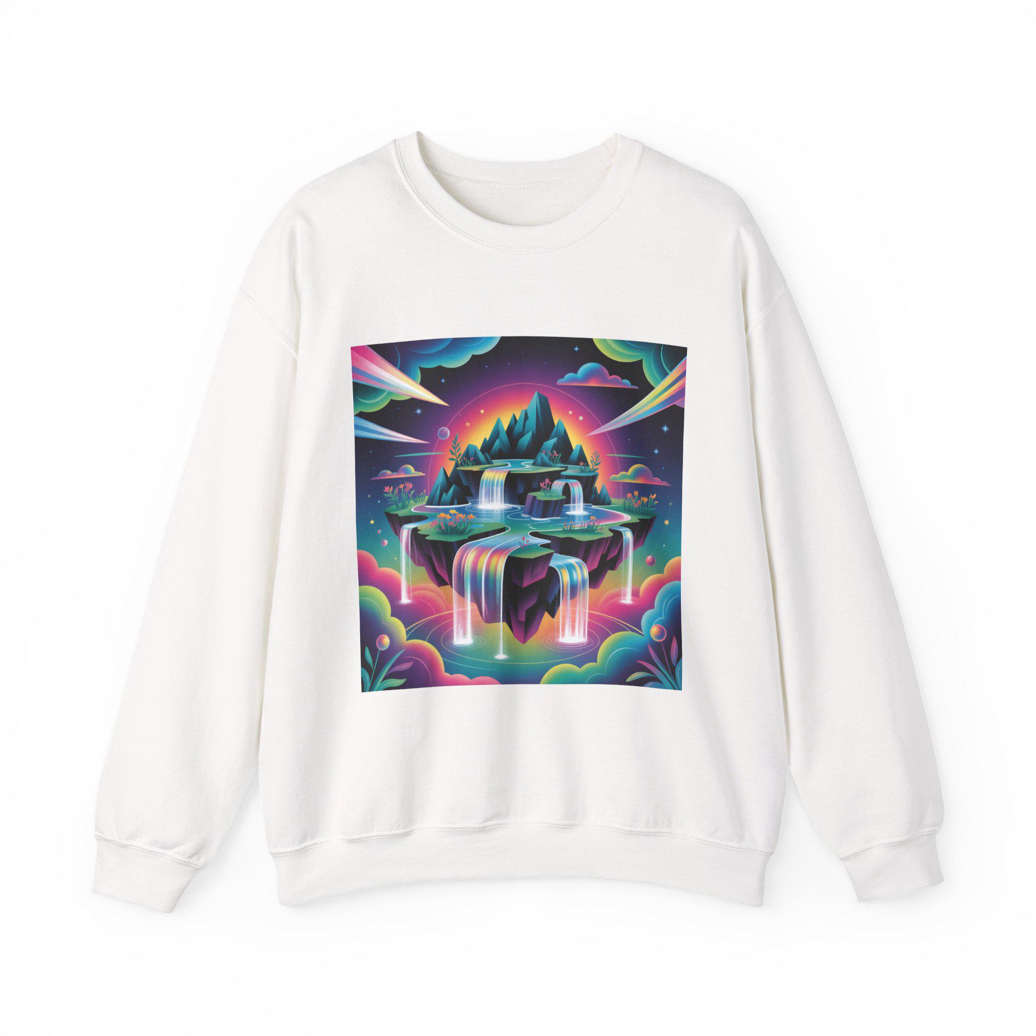 A neon-drenched dreamscape sweatshirt that blends surreal landscape motifs with futuristic gradient colorwork. The print shows a floating island and cascading waterfalls rendered in vivid iridescent hues and high-contrast tones, matching the AI art & dreamscape trend’s emphasis on bold gradients and unexpected juxtapositions. The crew sweatshirt’s clean silhouette and sleek placement let the artwork read like a wearable digital poster for fans of forward-looking, experimental visuals.