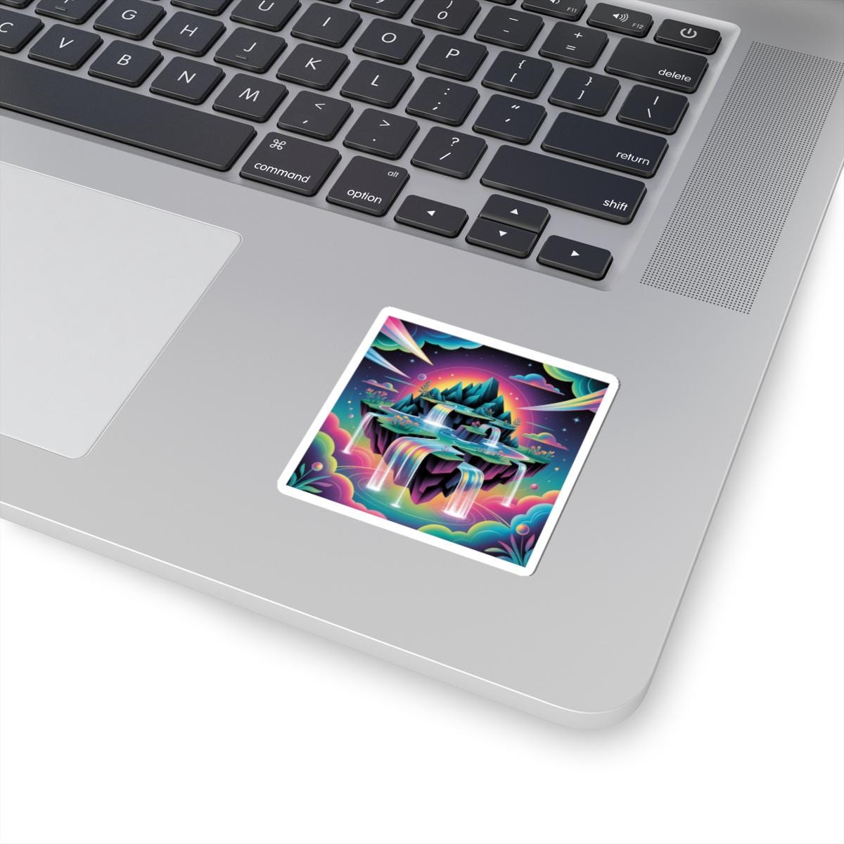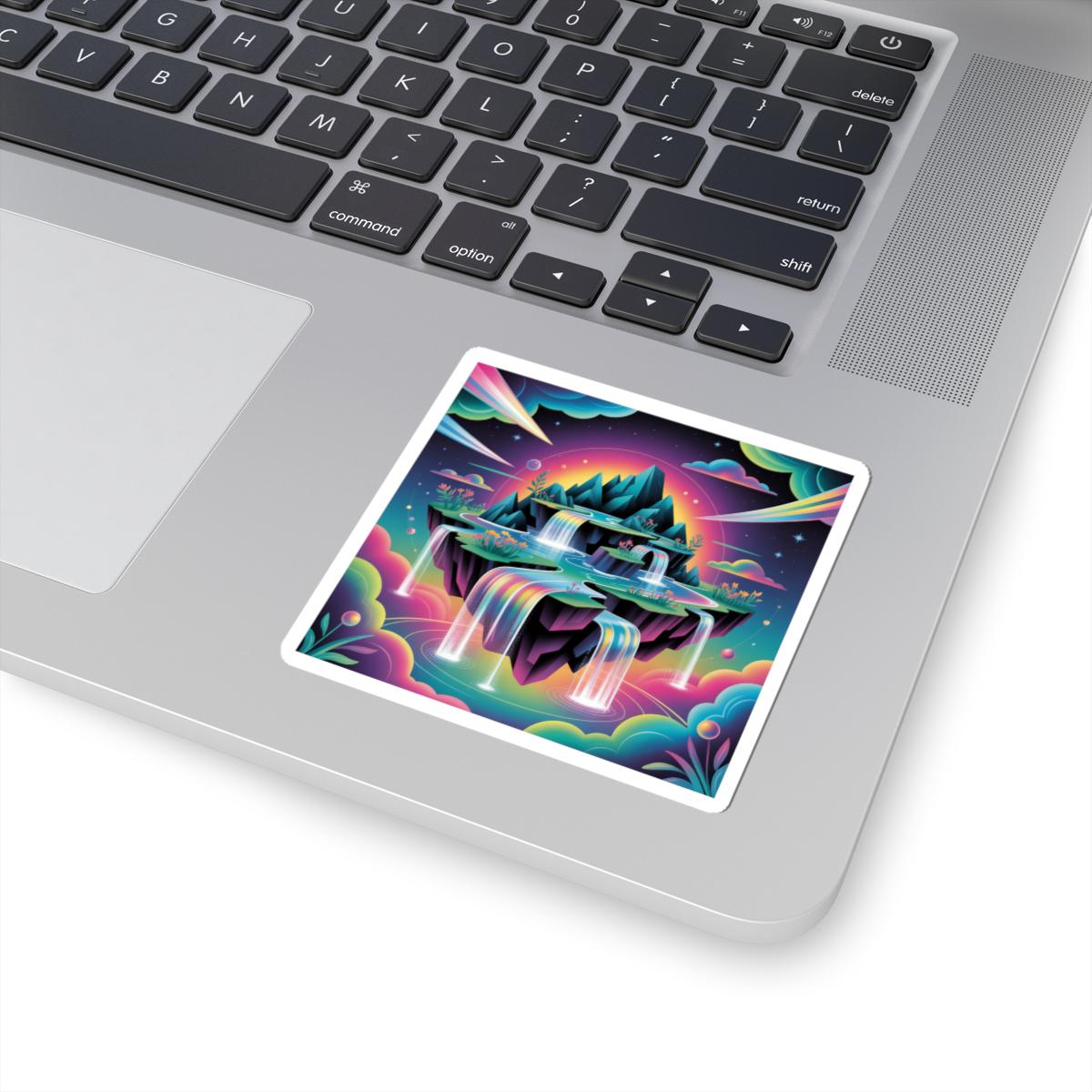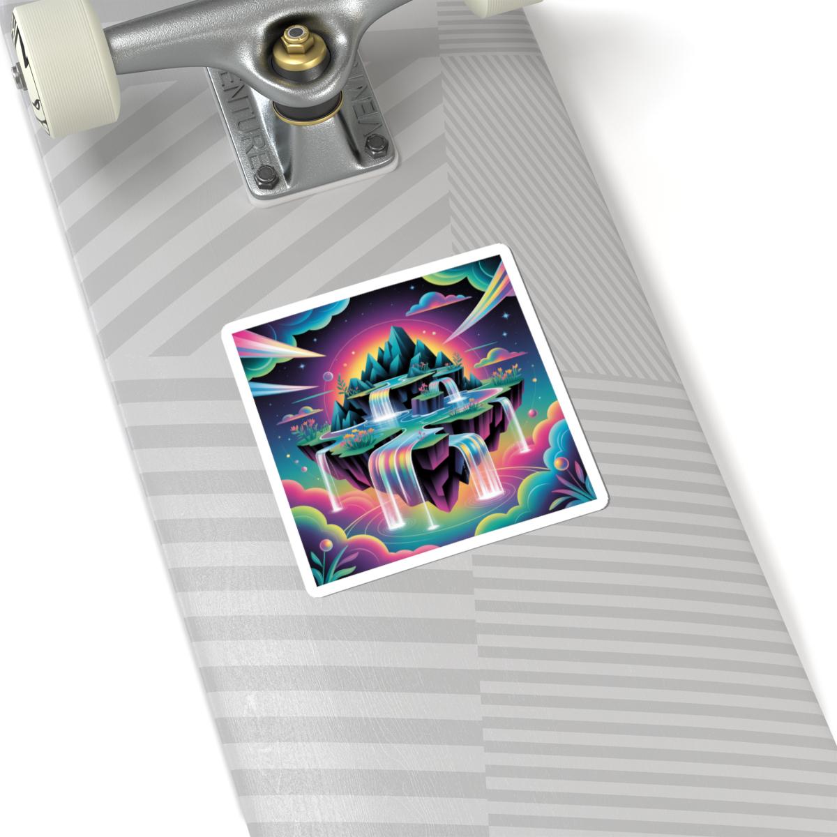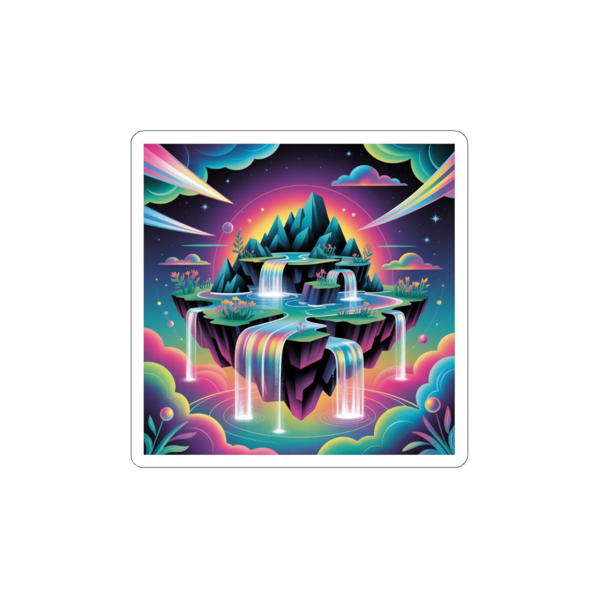 Floating island dreamscape rendered in neon gradients — an AI-art inspired sticker that blends surreal landscape motifs with cyber-fantasy colorways. The artwork features layered cliffs, cascading rainbow waterfalls and iridescent clouds in high-contrast, hyperreal hues that read as both futuristic and whimsical. It suits collectors of digital art, sci‑fi aesthetics, and anyone building a tech-forward, imaginative setup — great for personalizing laptops, journals, and smooth indoor surfaces while nodding to the AI art & dreamscape trend.