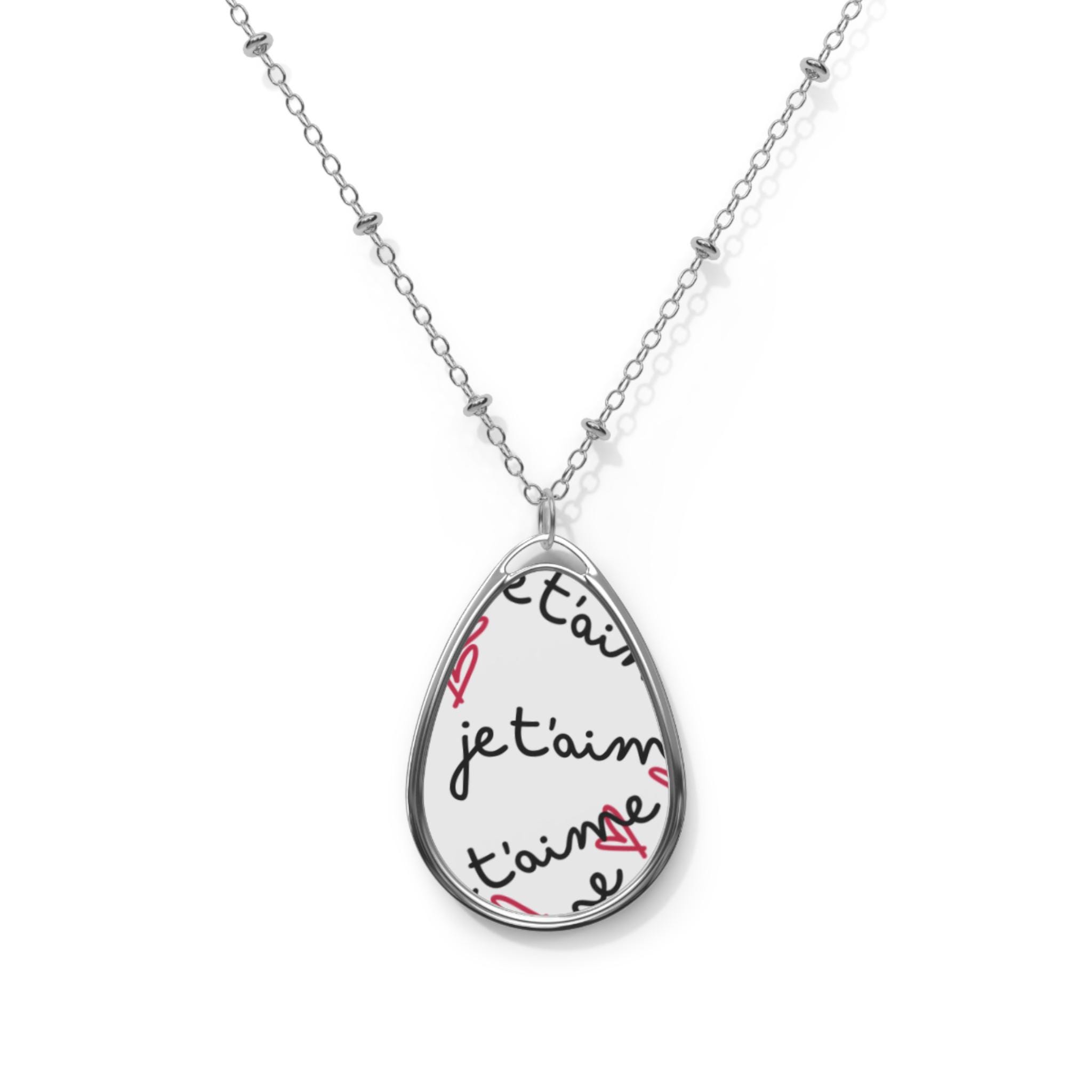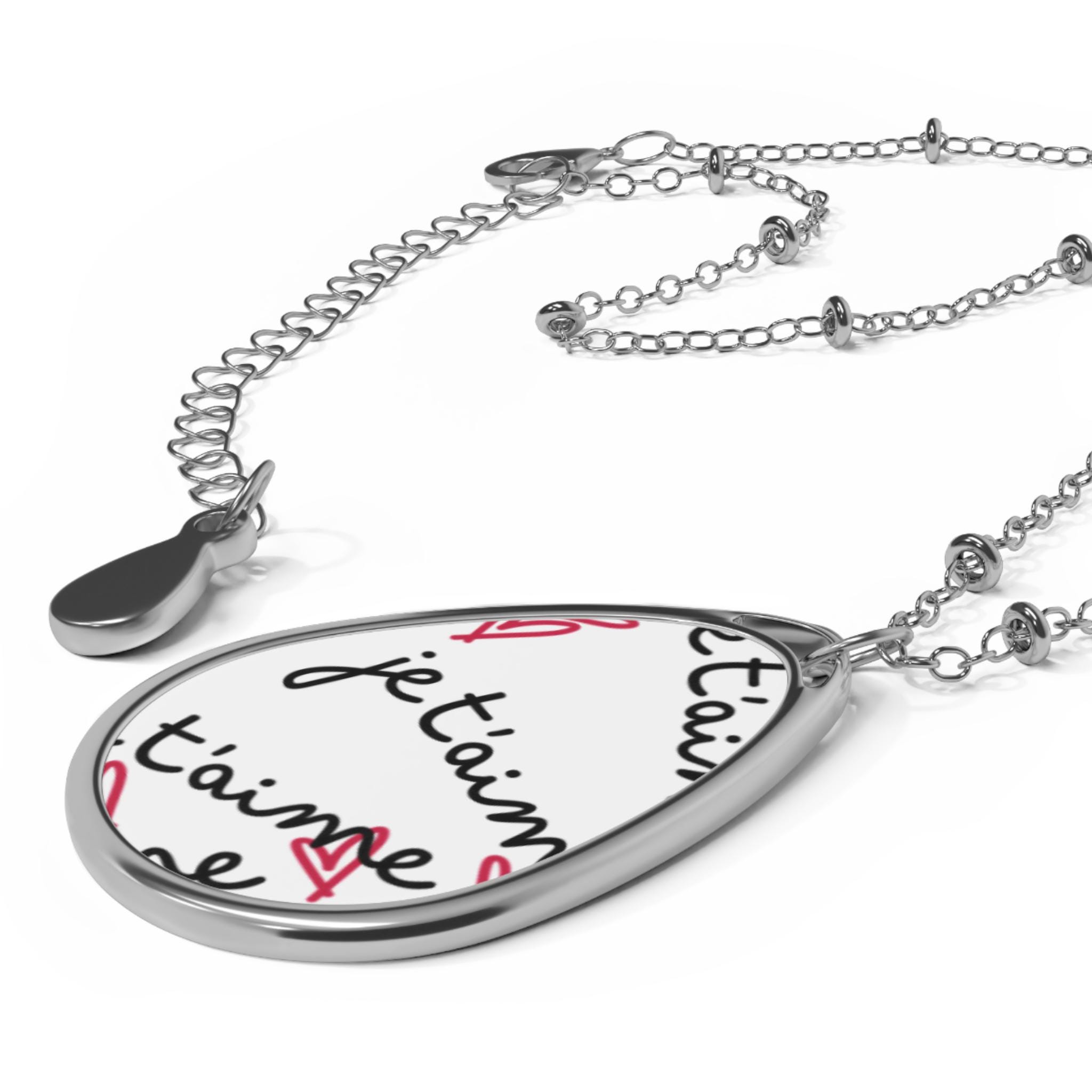 A delicate ellipse pendant that carries a little story close to the heart. The glossy, full-color face showcases vibrant, crisp printing on a white aluminum surface so handwritten script and small motifs stay bright and readable. Set inside a shiny zinc-alloy frame and hung from a slender chain with decorative bead links, the necklace closes with a sturdy lobster clasp for daily wear. It slips easily into everyday outfits — layered with sweaters or worn against a tee —and feels personal and lightweight on the neck.