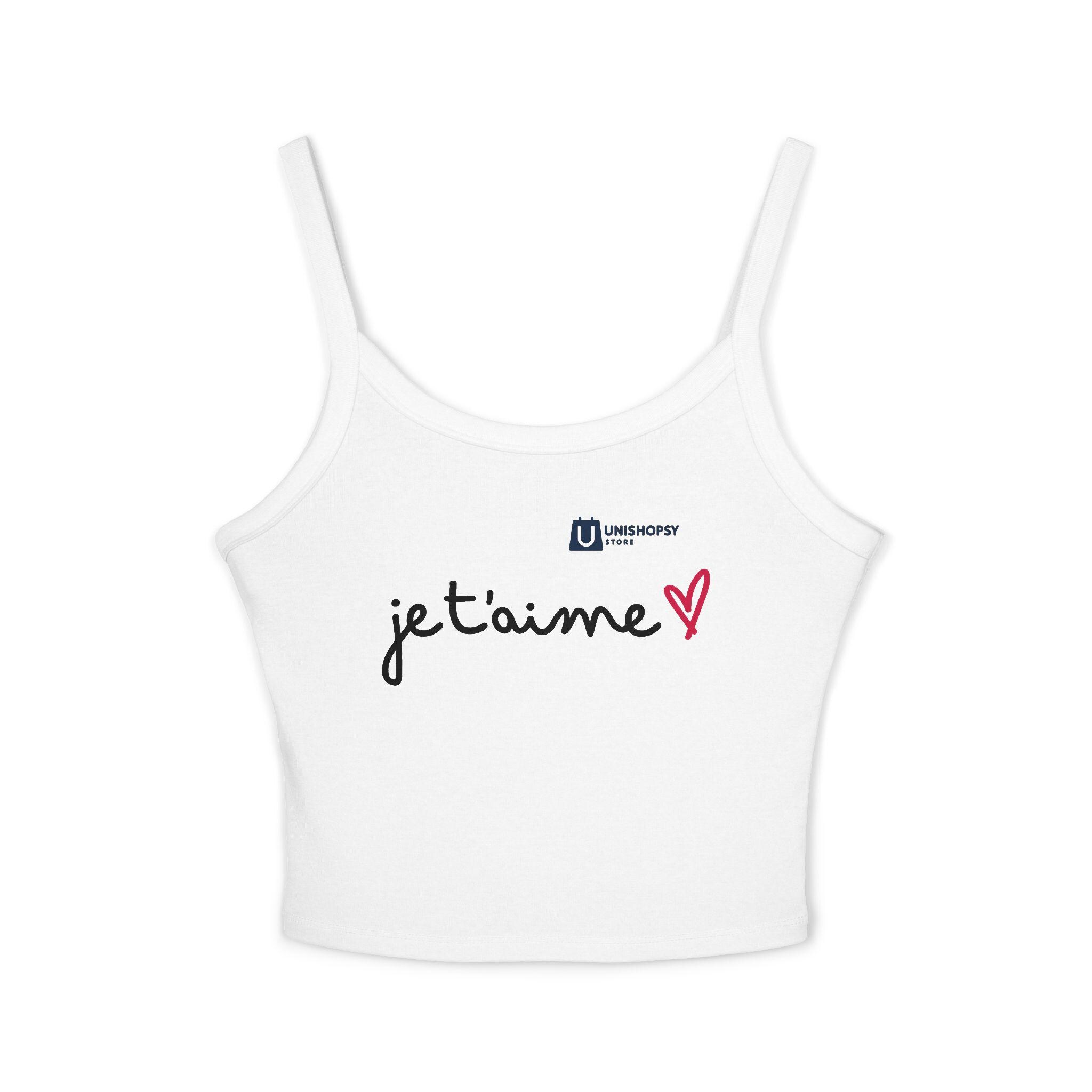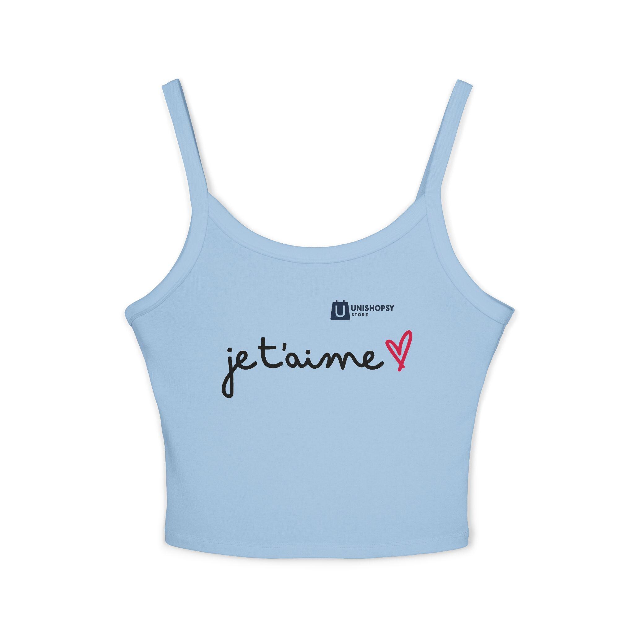 Lightweight and fitted, this spaghetti-strap tank brings a sweet, handwritten “je t’aime” and a tiny pink heart to the front — a quietly romantic piece that layers easily or stands on its own. The mid-length cut flatters the waist while allowing movement, and the thick straps give better support than thinner styles. Printed with DTF for a clean, durable finish, it feels soft against the skin thanks to the Airlume-combed ring-spun cotton blend. Ethically made in a WRAP- and FLA-partnered facility, it’s a small, wearable note of affection you can reach for when you want to feel seen and a little loved.