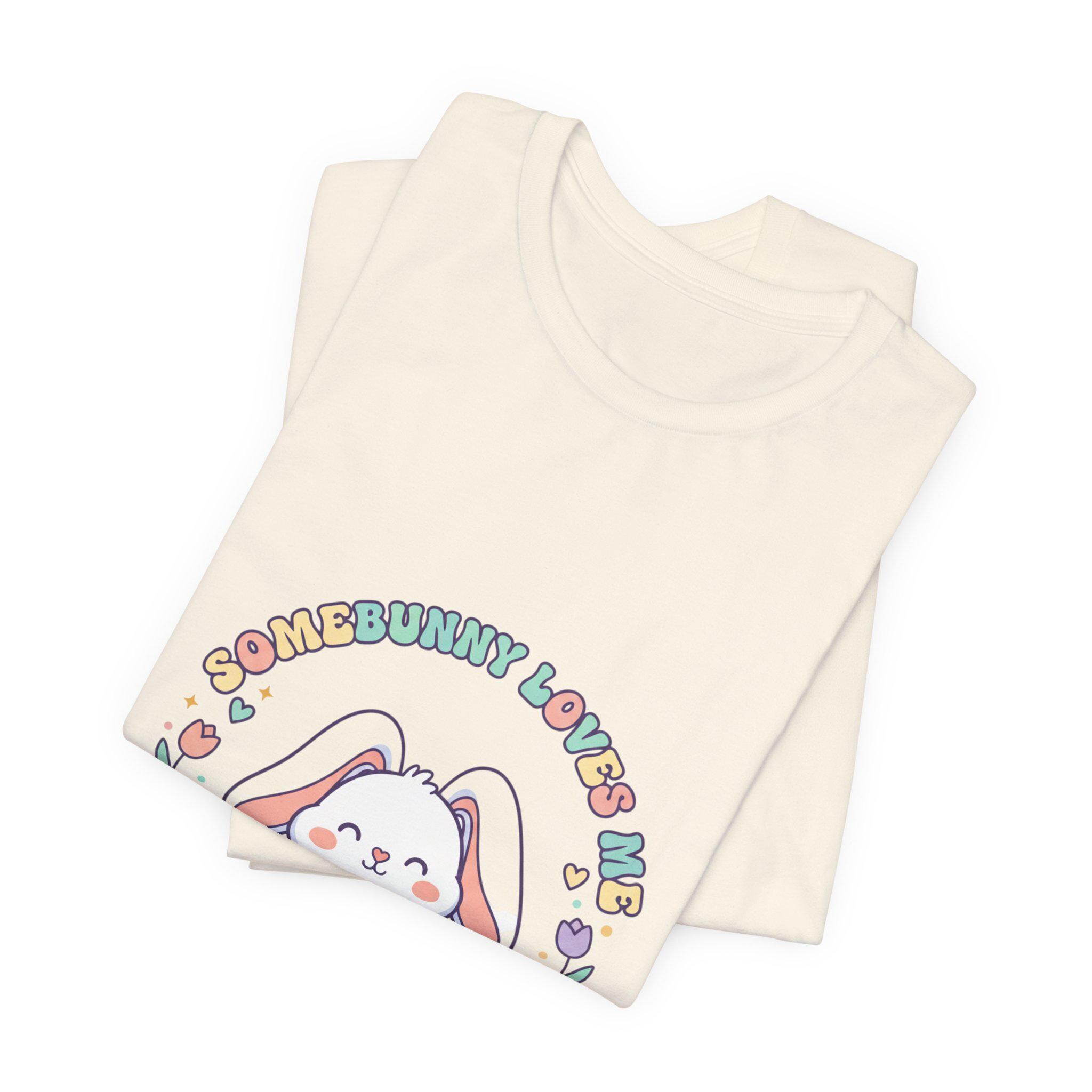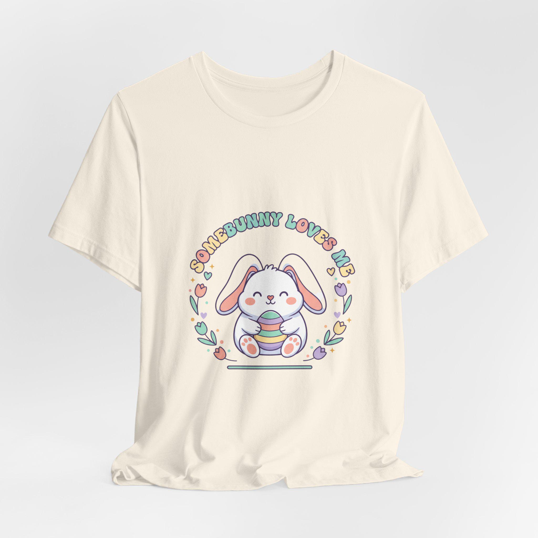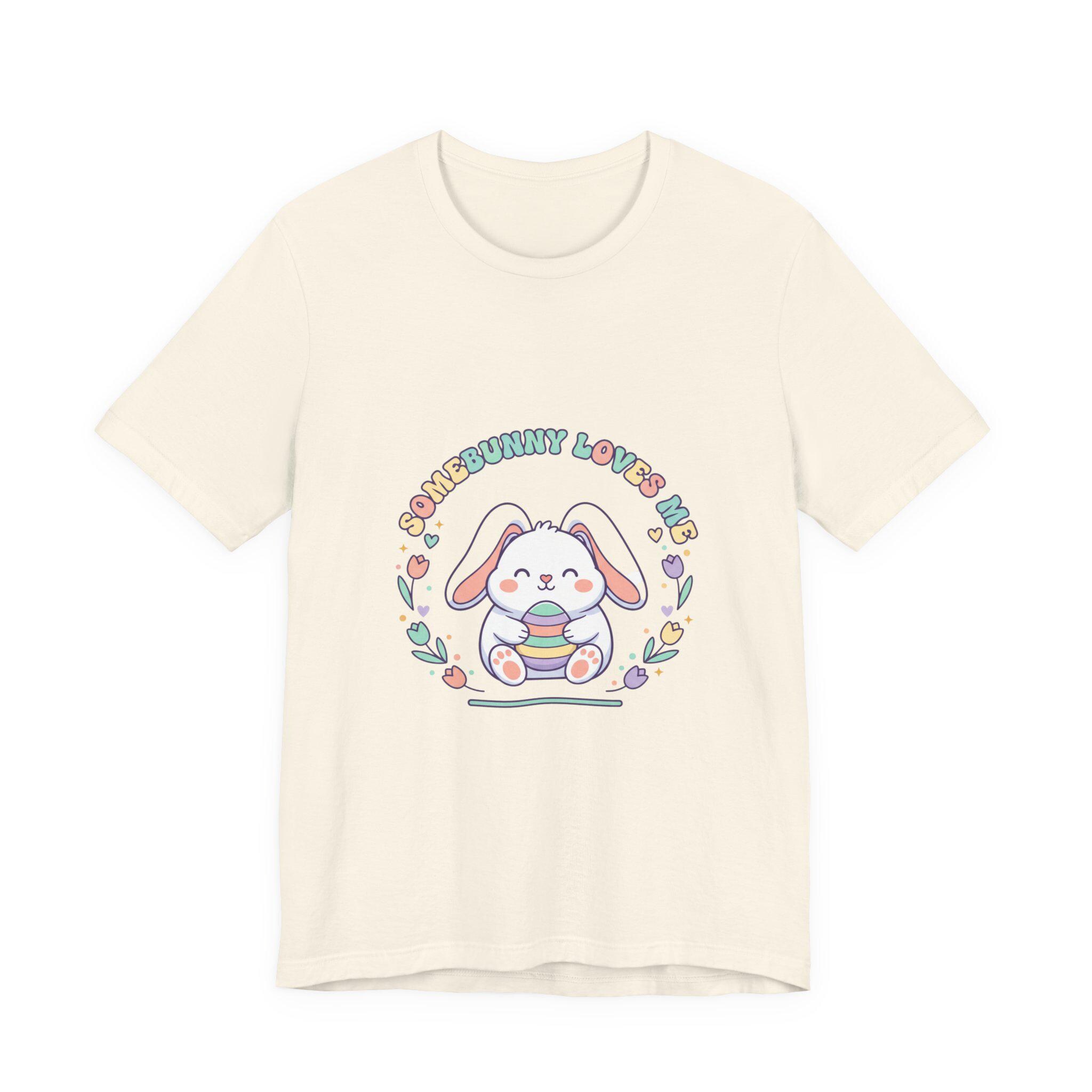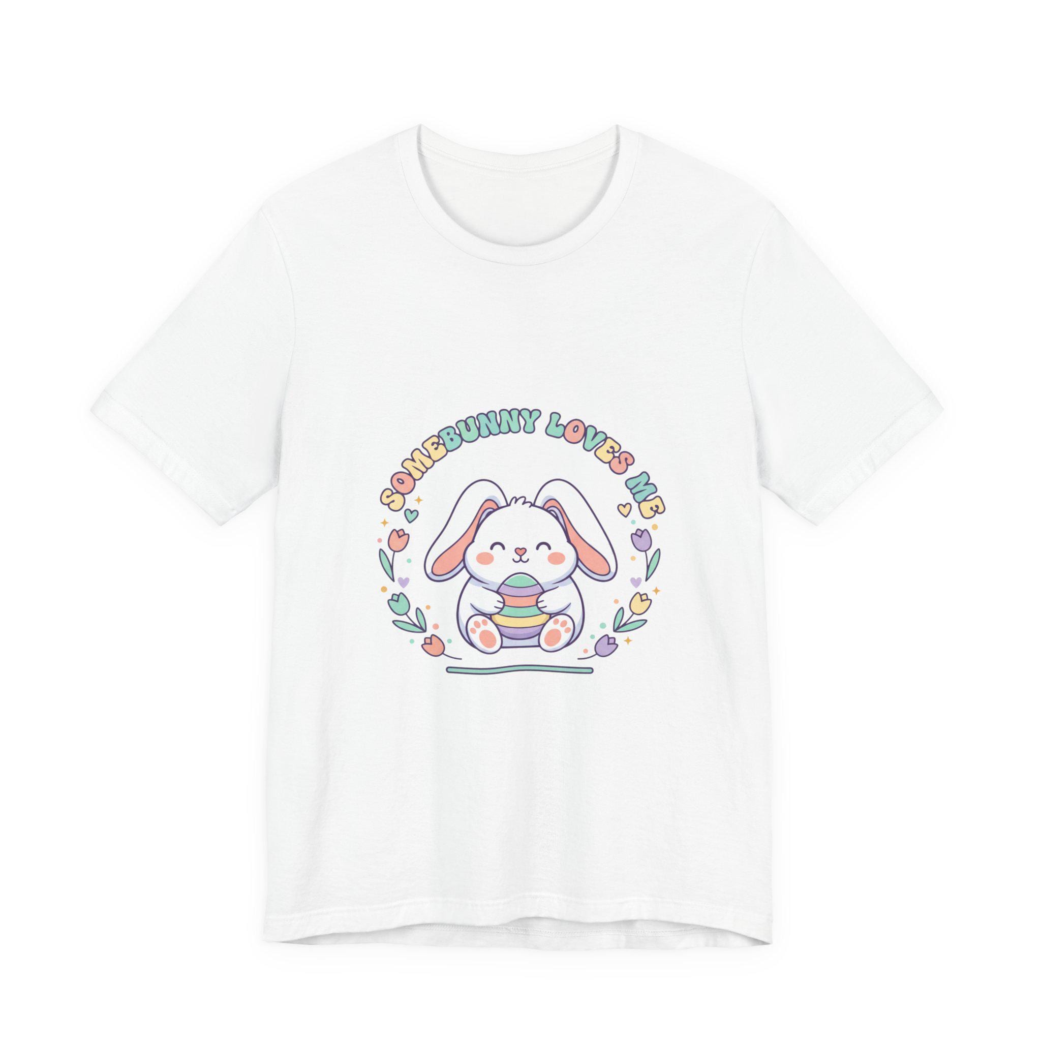 Soft pastel bunny tee with a vintage-inspired, cottagecore-friendly vibe. The front artwork shows a rounded, friendly bunny holding a stack of decorated eggs framed by simple floral sprigs and retro rounded lettering — a quiet, nostalgic take on the Easter bunny aesthetic. Light colors and gentle linework keep the design approachable for family-coordinated spring outfits and seasonal wardrobes.