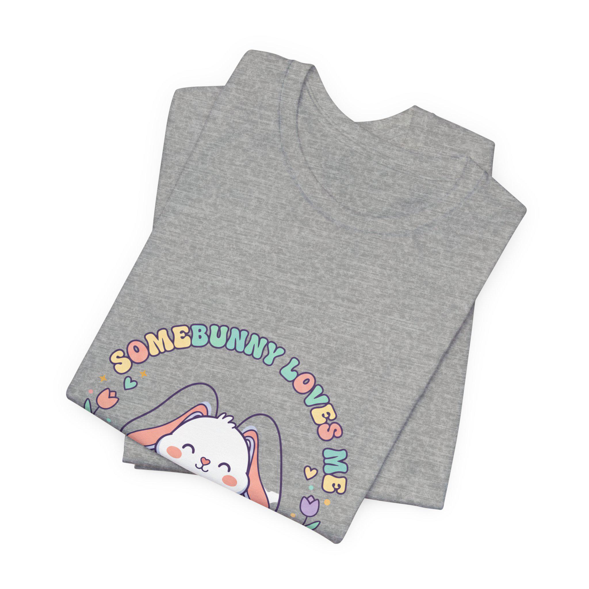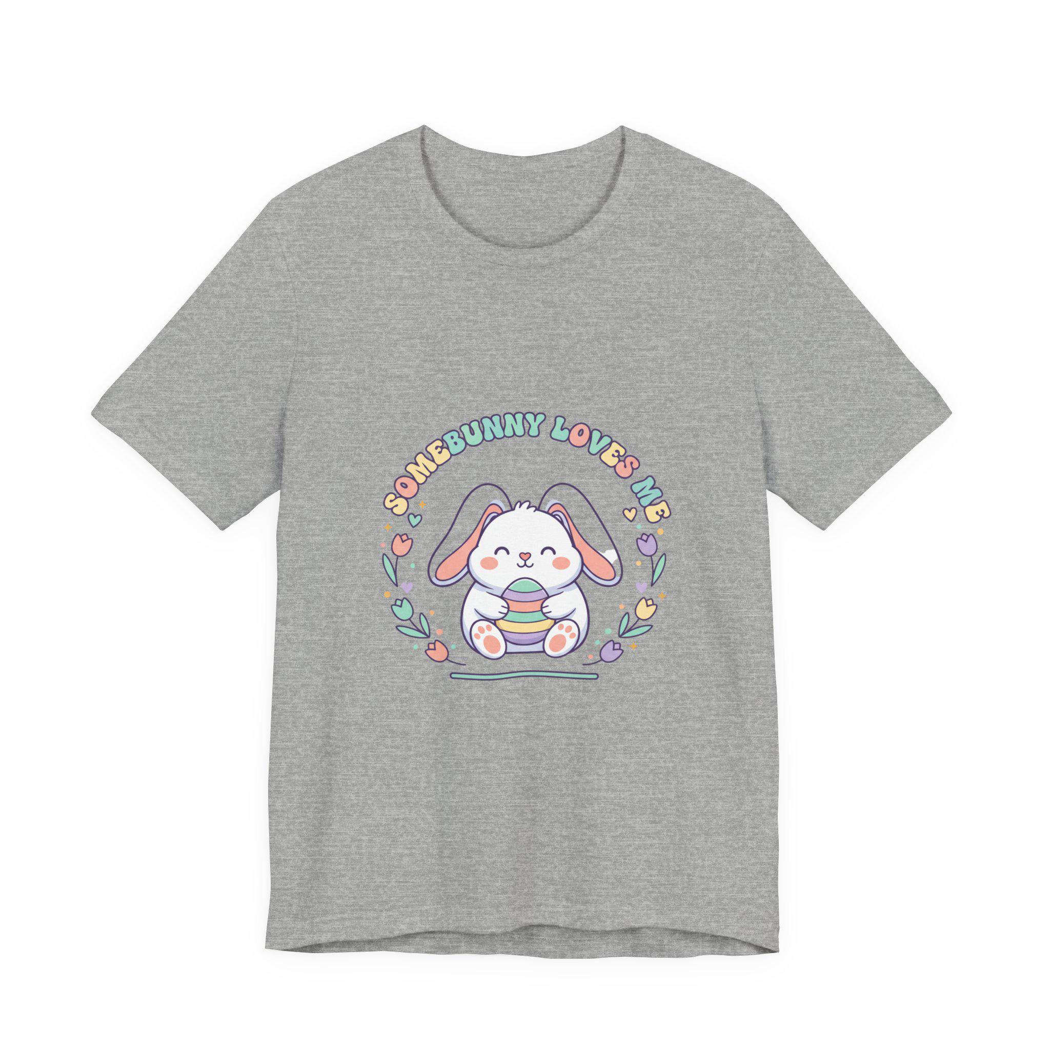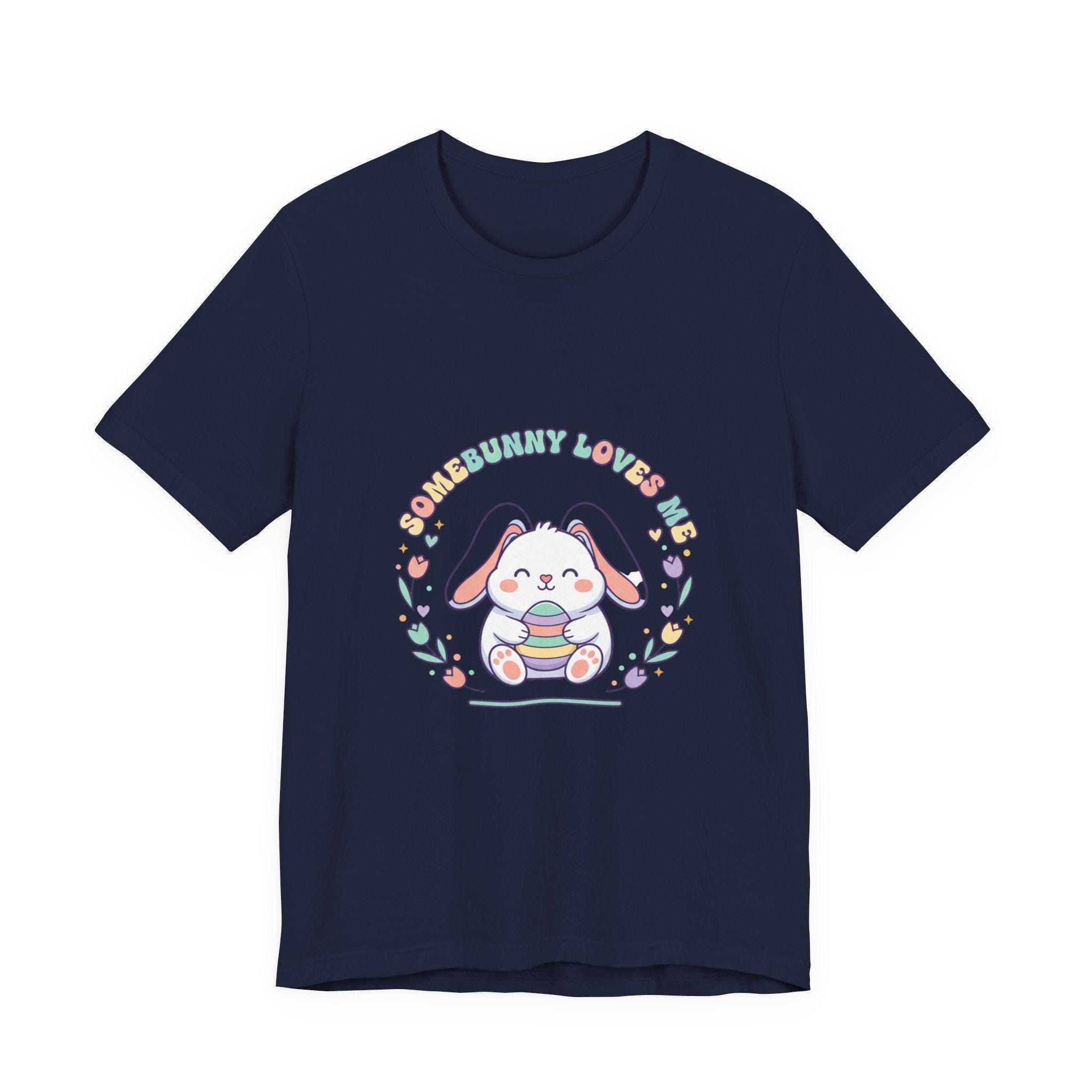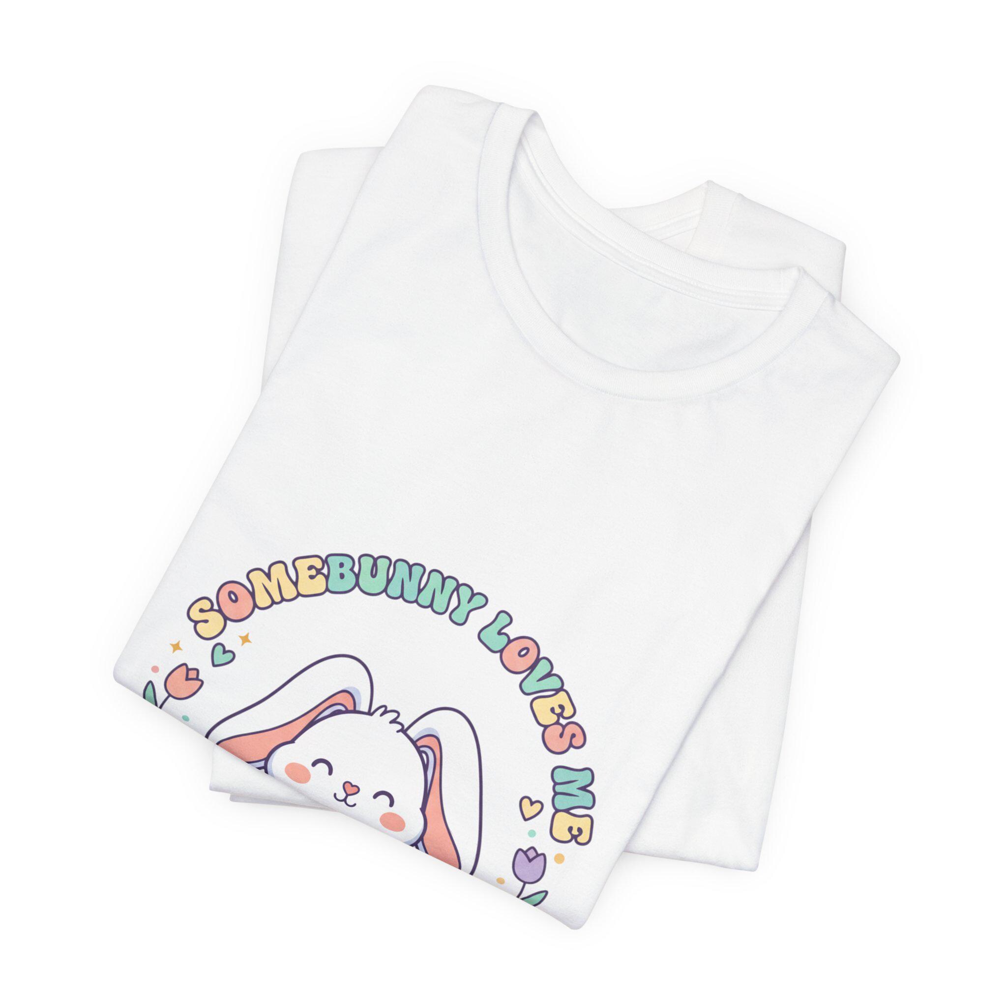 Soft pastel bunny tee with a vintage-inspired, cottagecore-friendly vibe. The front artwork shows a rounded, friendly bunny holding a stack of decorated eggs framed by simple floral sprigs and retro rounded lettering — a quiet, nostalgic take on the Easter bunny aesthetic. Light colors and gentle linework keep the design approachable for family-coordinated spring outfits and seasonal wardrobes.