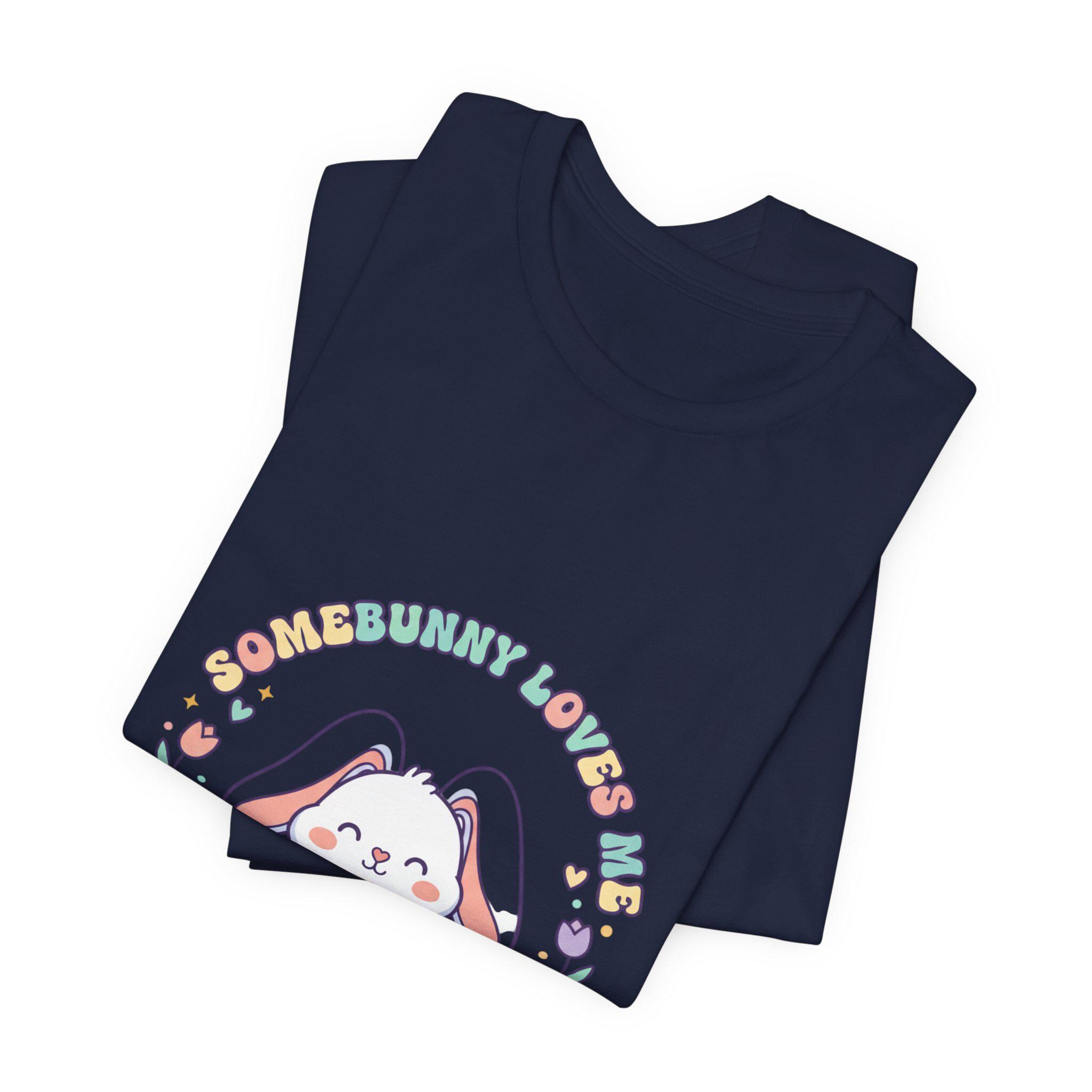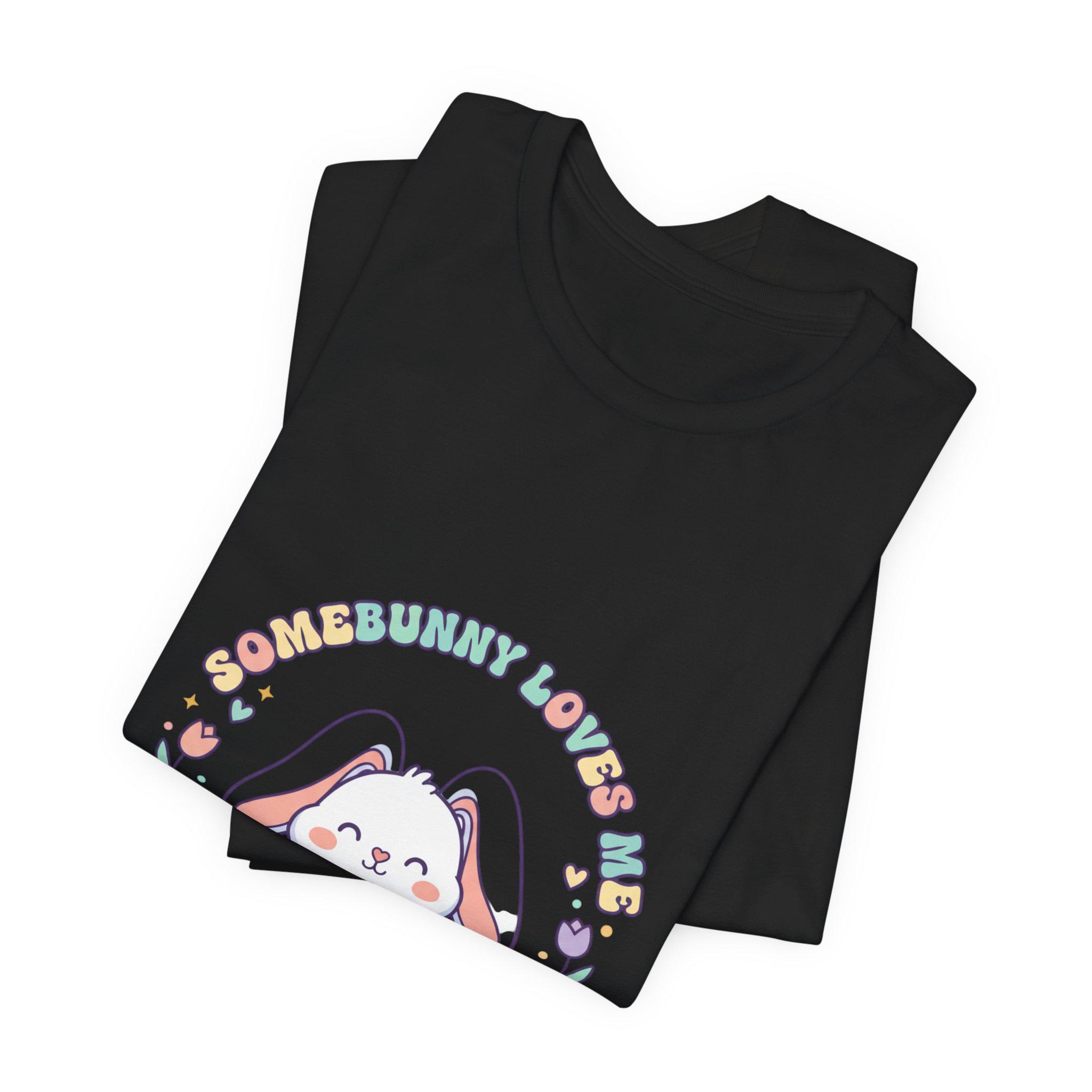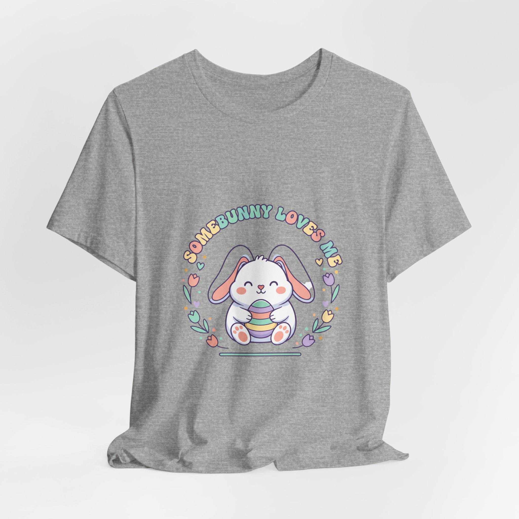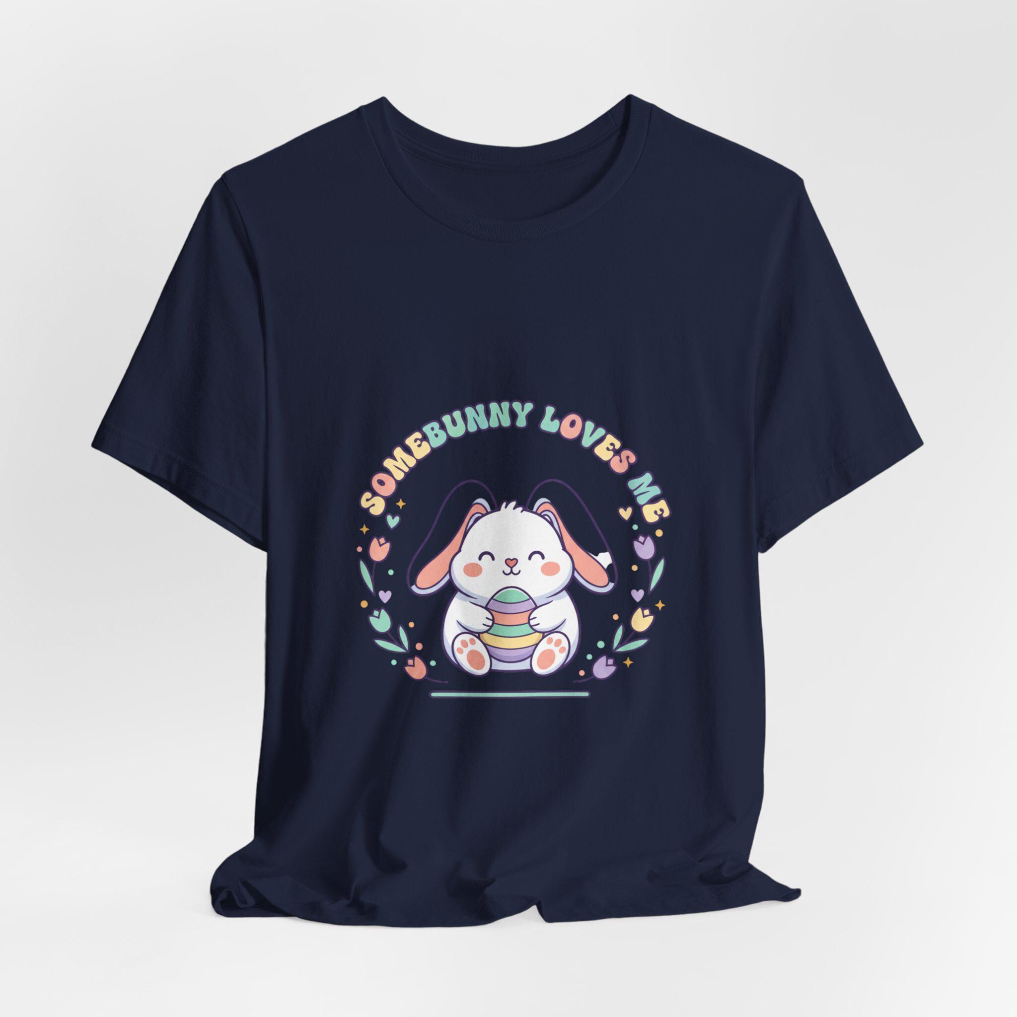 Soft pastel bunny tee with a vintage-inspired, cottagecore-friendly vibe. The front artwork shows a rounded, friendly bunny holding a stack of decorated eggs framed by simple floral sprigs and retro rounded lettering — a quiet, nostalgic take on the Easter bunny aesthetic. Light colors and gentle linework keep the design approachable for family-coordinated spring outfits and seasonal wardrobes.