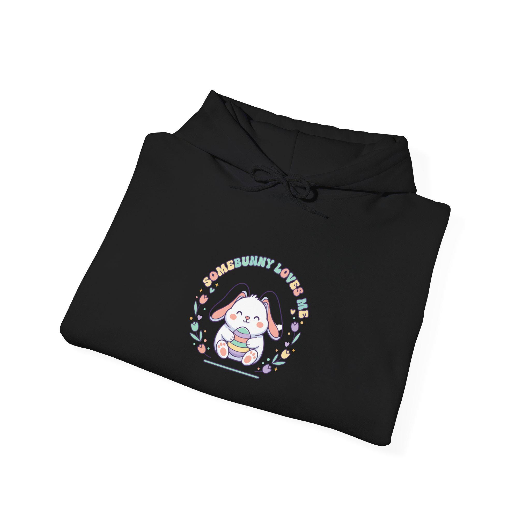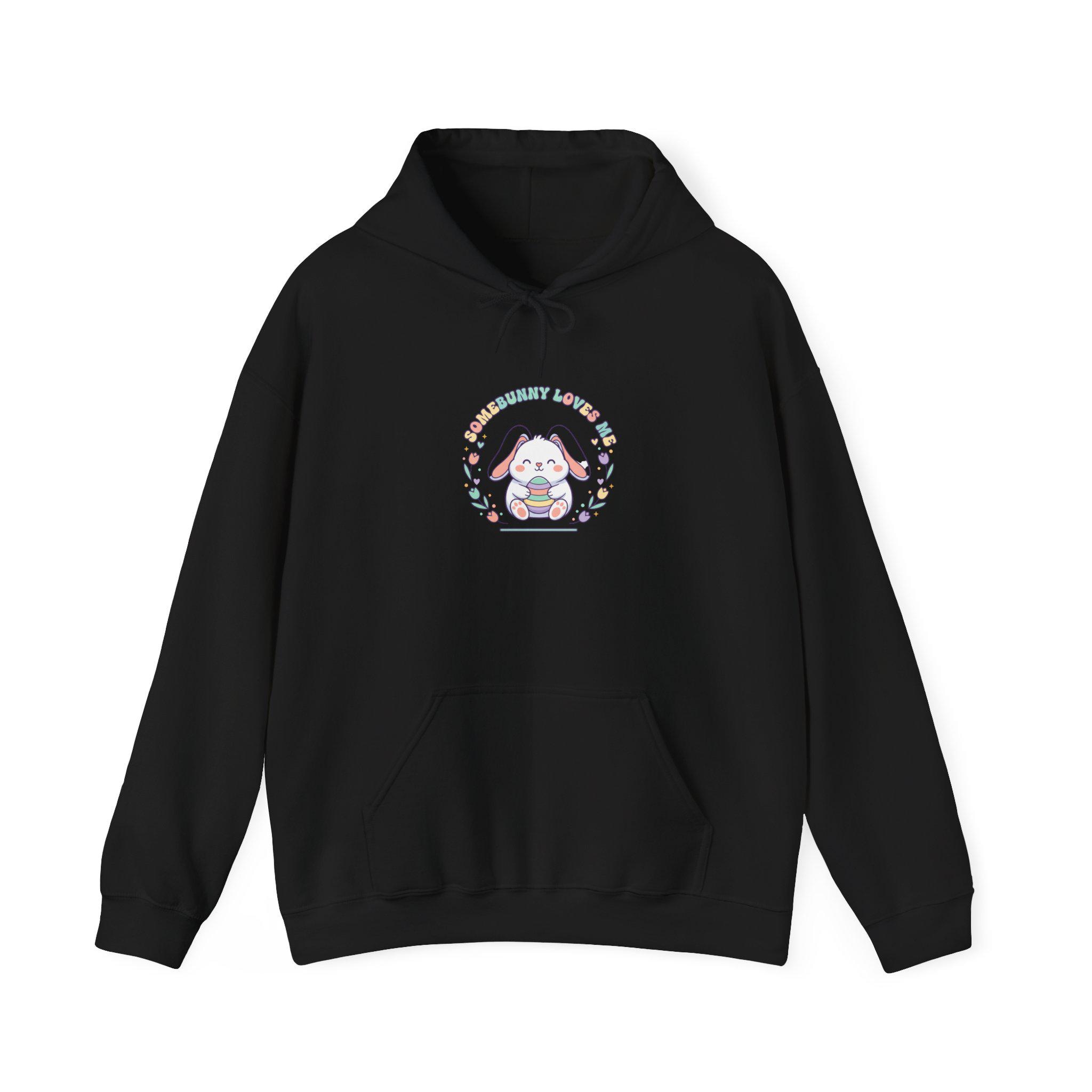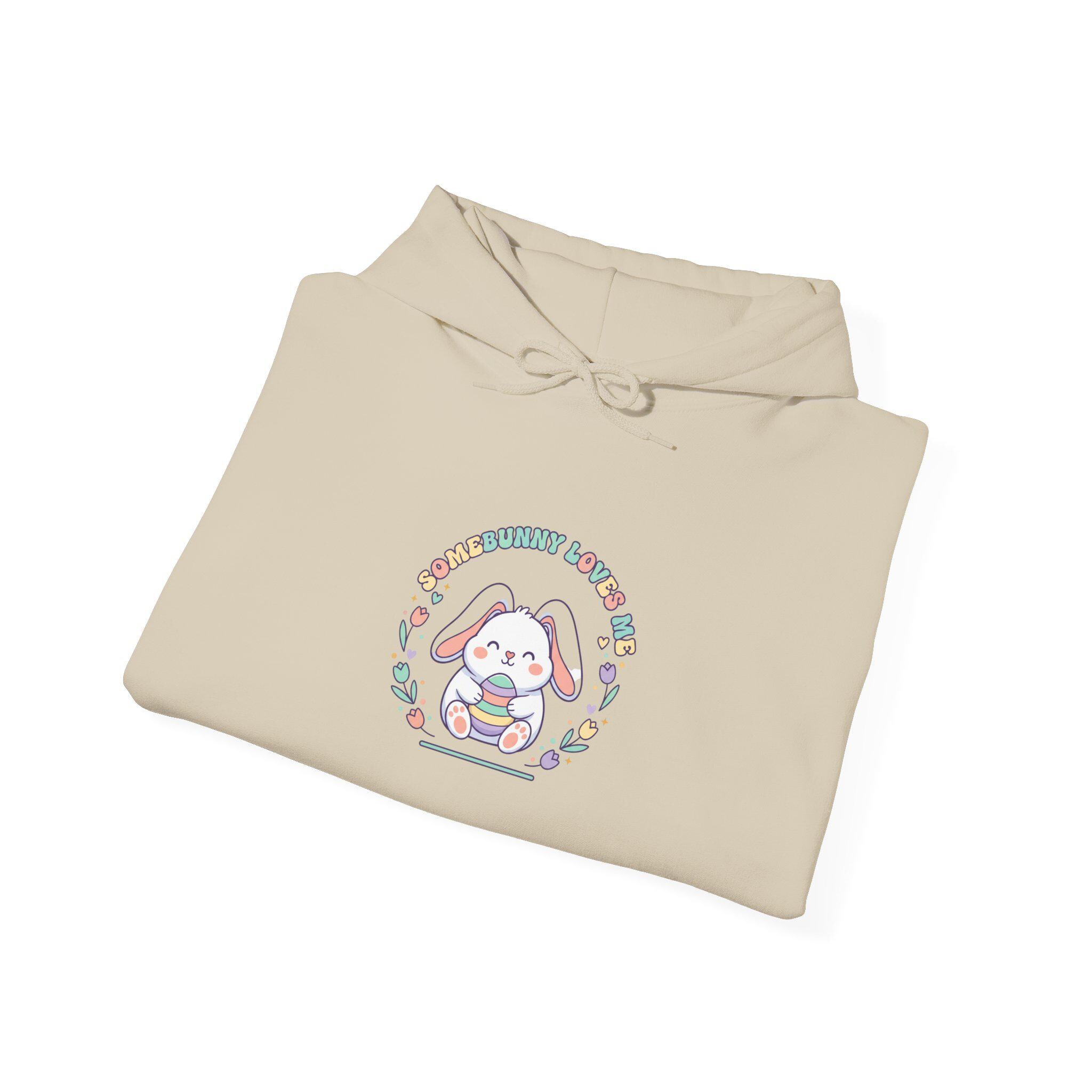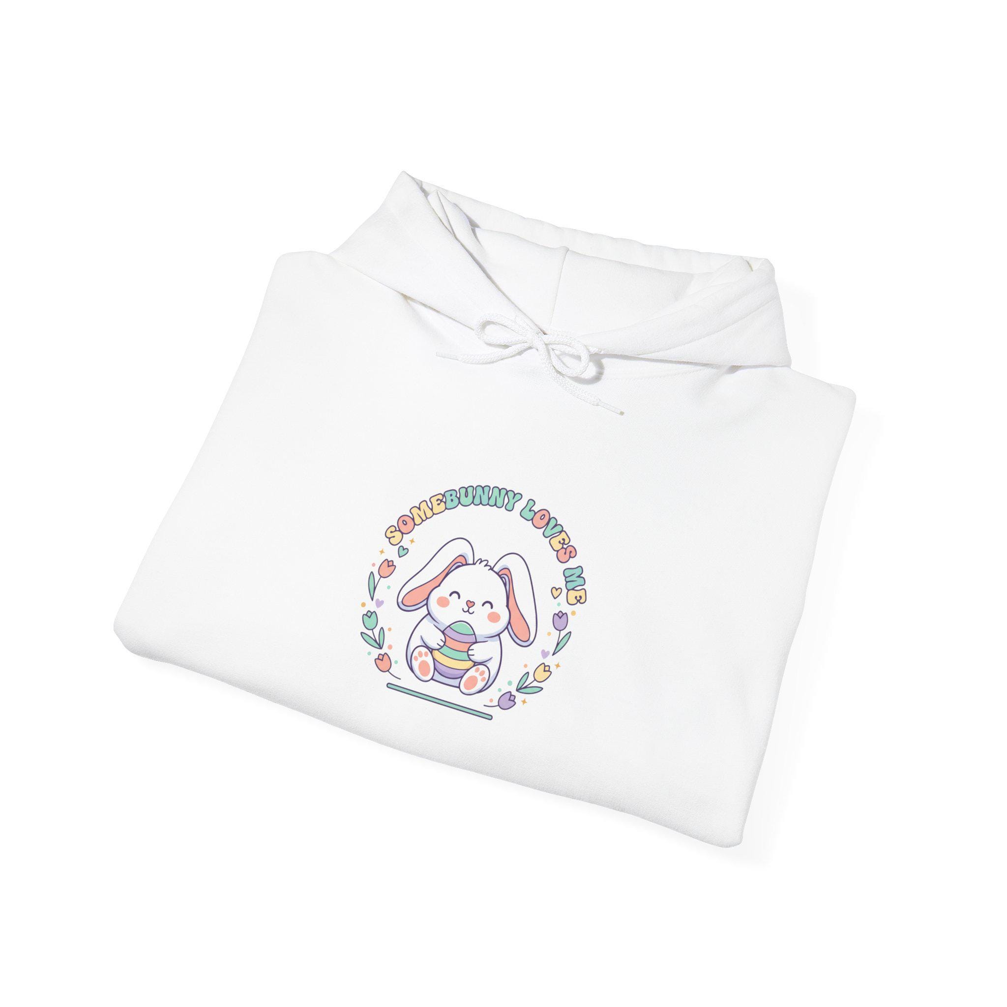 Soft pastel Easter bunny hoodie with a gentle, nostalgic vibe: a small, centered illustration of a cuddly bunny holding an egg, framed by tiny florals and rounded retro lettering. The artwork uses a light pastel palette and simple, friendly lines that read cottagecore and vintage Easter aesthetic at a glance. This hooded sweatshirt brings seasonal spring charm to casual outfits and coordinates easily with family looks or layered cool-weather springwear.