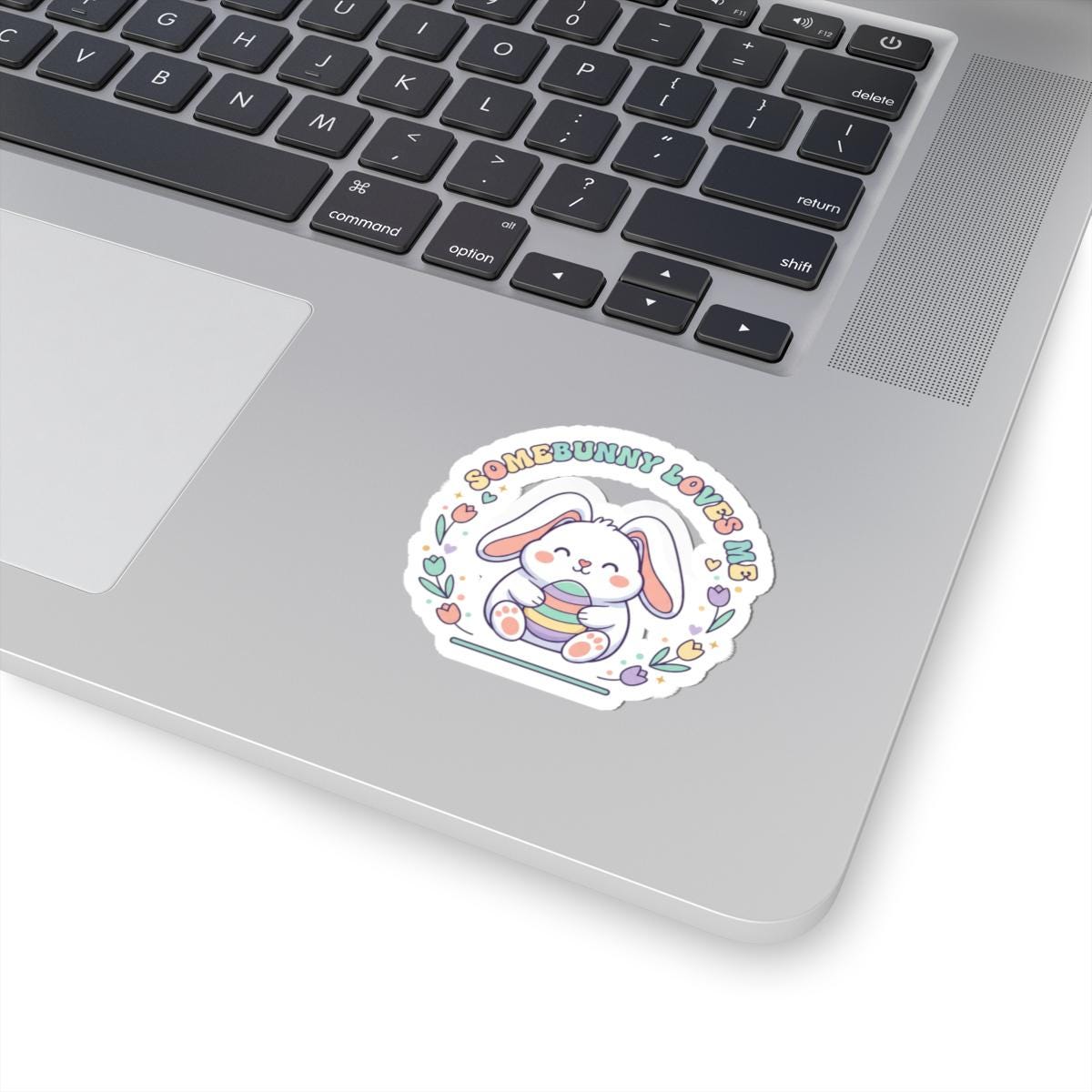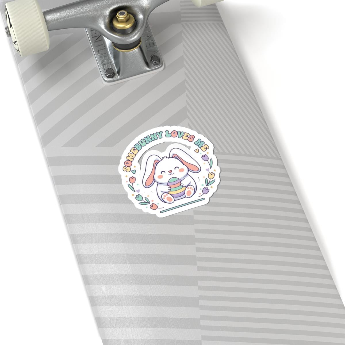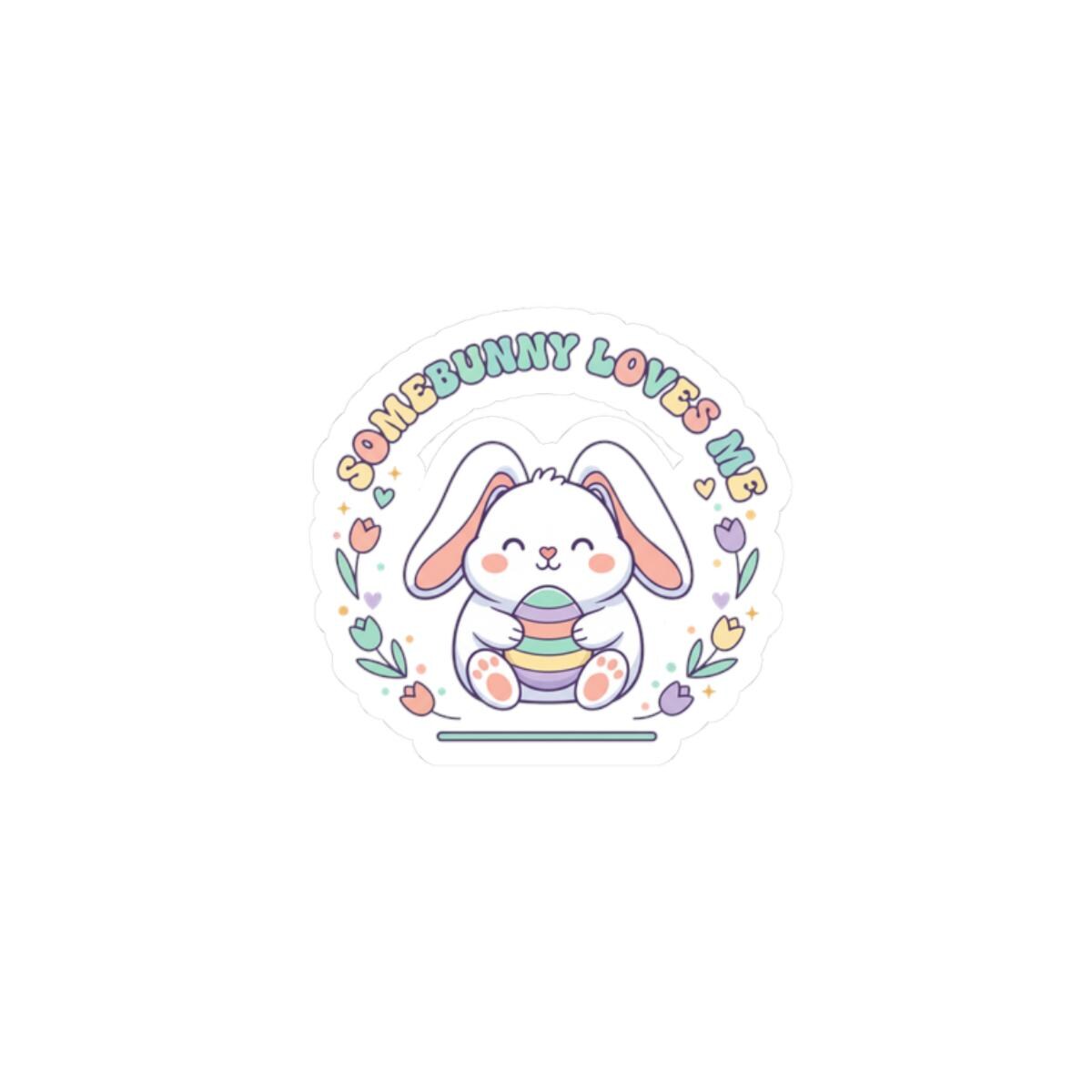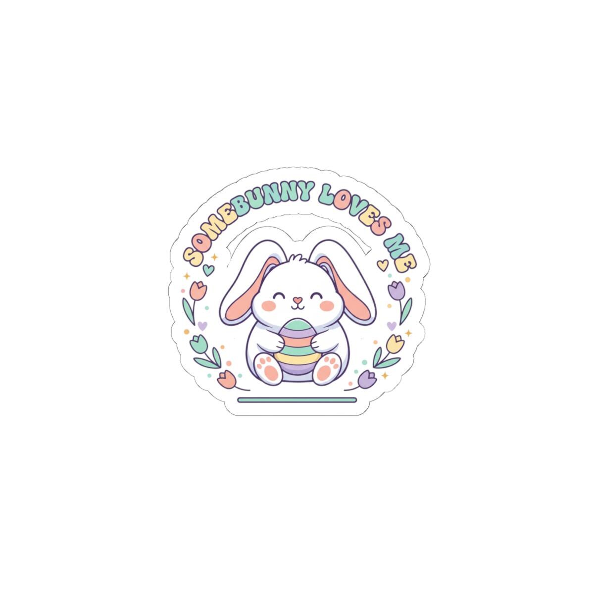 Pastel Easter bunny sticker featuring a soft, rounded rabbit holding a striped egg, framed by tiny tulips and retro-inspired rounded lettering that reads a short, playful phrase. The artwork leans into a gentle, cottagecore-meets-vintage-Easter vibe with airy composition and a light pastel palette that complements spring wardrobes and seasonal decor. Sized for laptops, journals, and windows, this kiss-cut vinyl sticker adds a whimsical, nostalgic touch to everyday items and coordinates with pastel spring looks and family Easter themes.