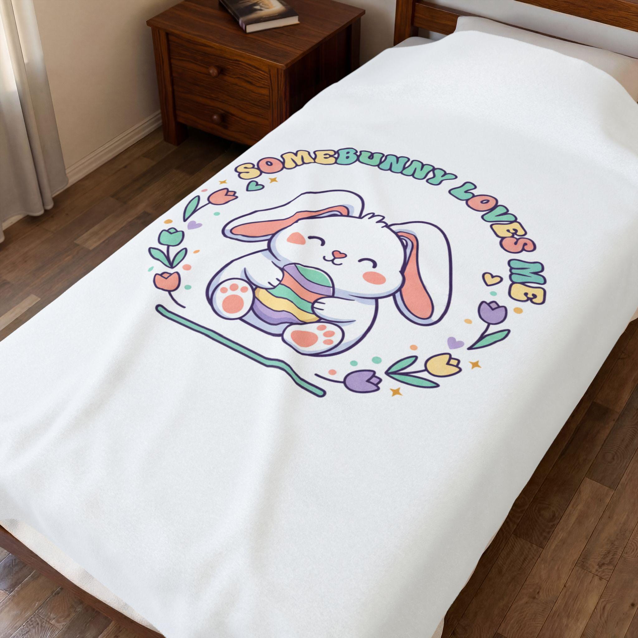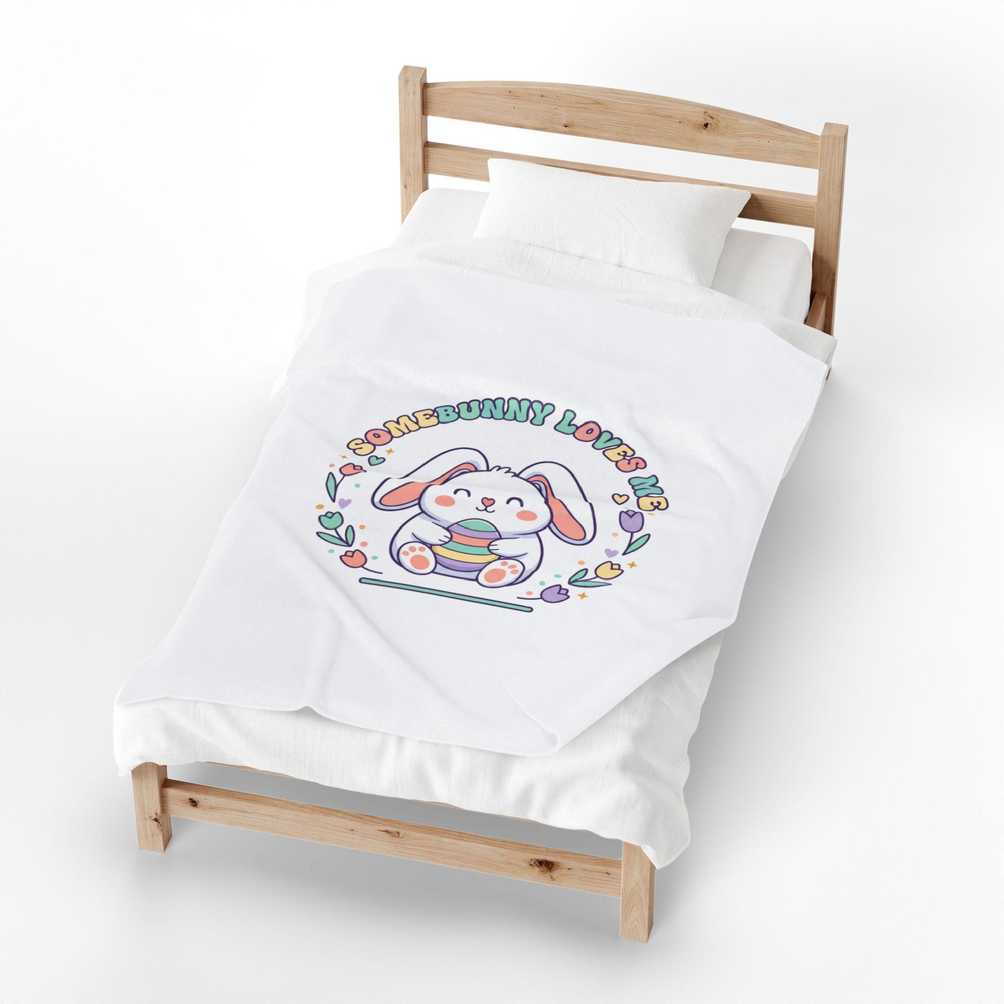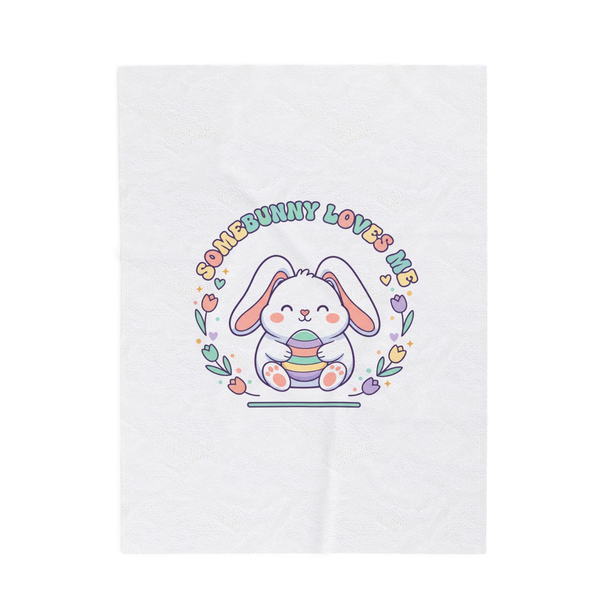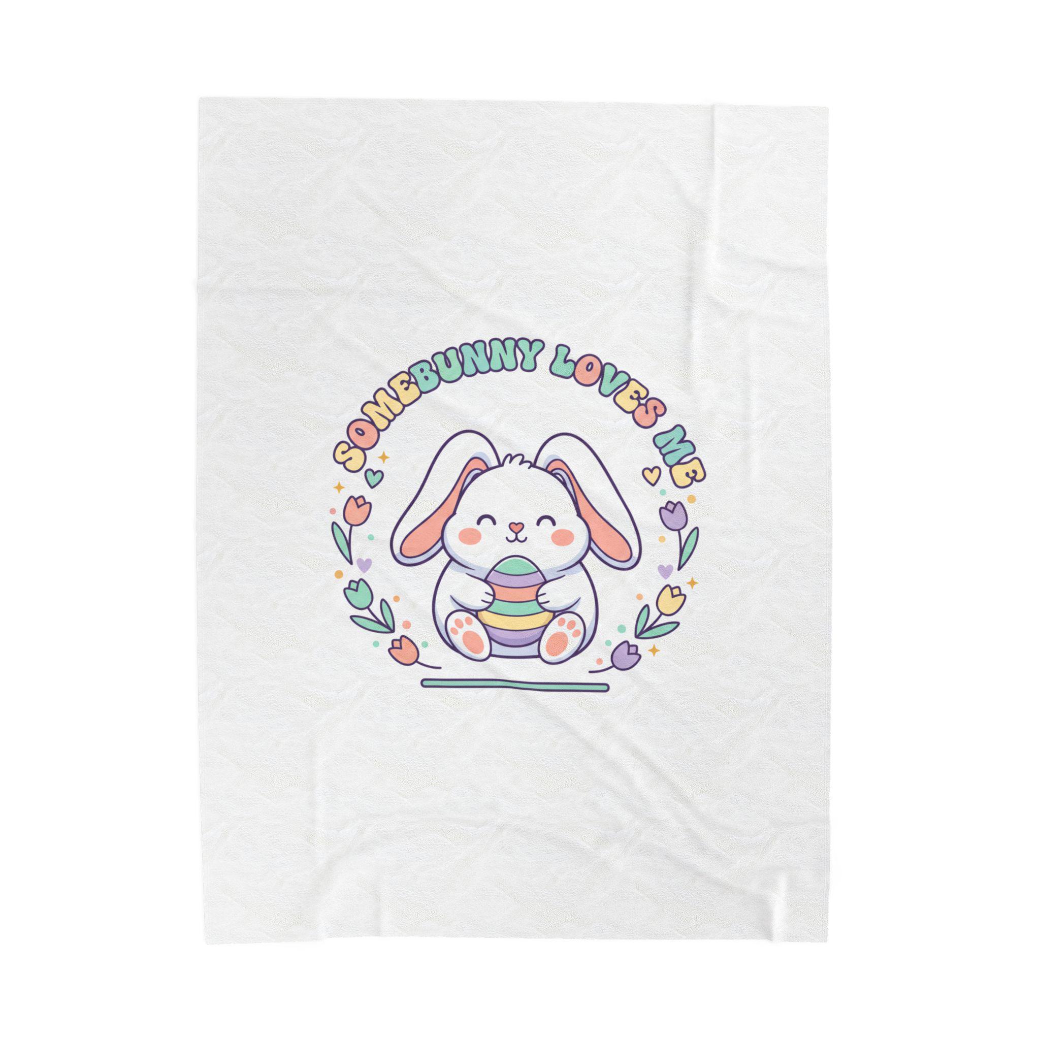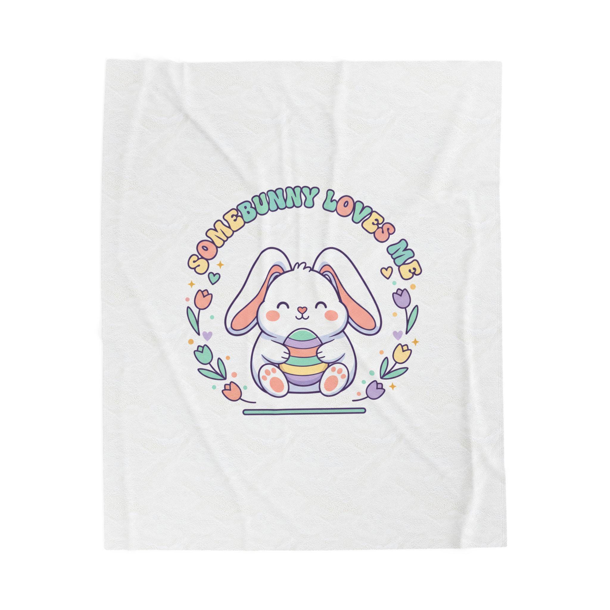 A soft, pastel-themed velveteen throw featuring a sweet, rounded bunny illustration holding a striped egg, framed by tulip and heart motifs with retro-inspired curved lettering. The artwork channels a gentle Easter bunny aesthetic and cottagecore nostalgia—airy, lighthearted, and playful—making it a cozy seasonal accent for springtime bedrooms, nurseries, or family living spaces. The single-sided vibrant print keeps the colors bright against the plush white velveteen, fitting shoppers seeking pastel spring decor and Easter-themed home accents.