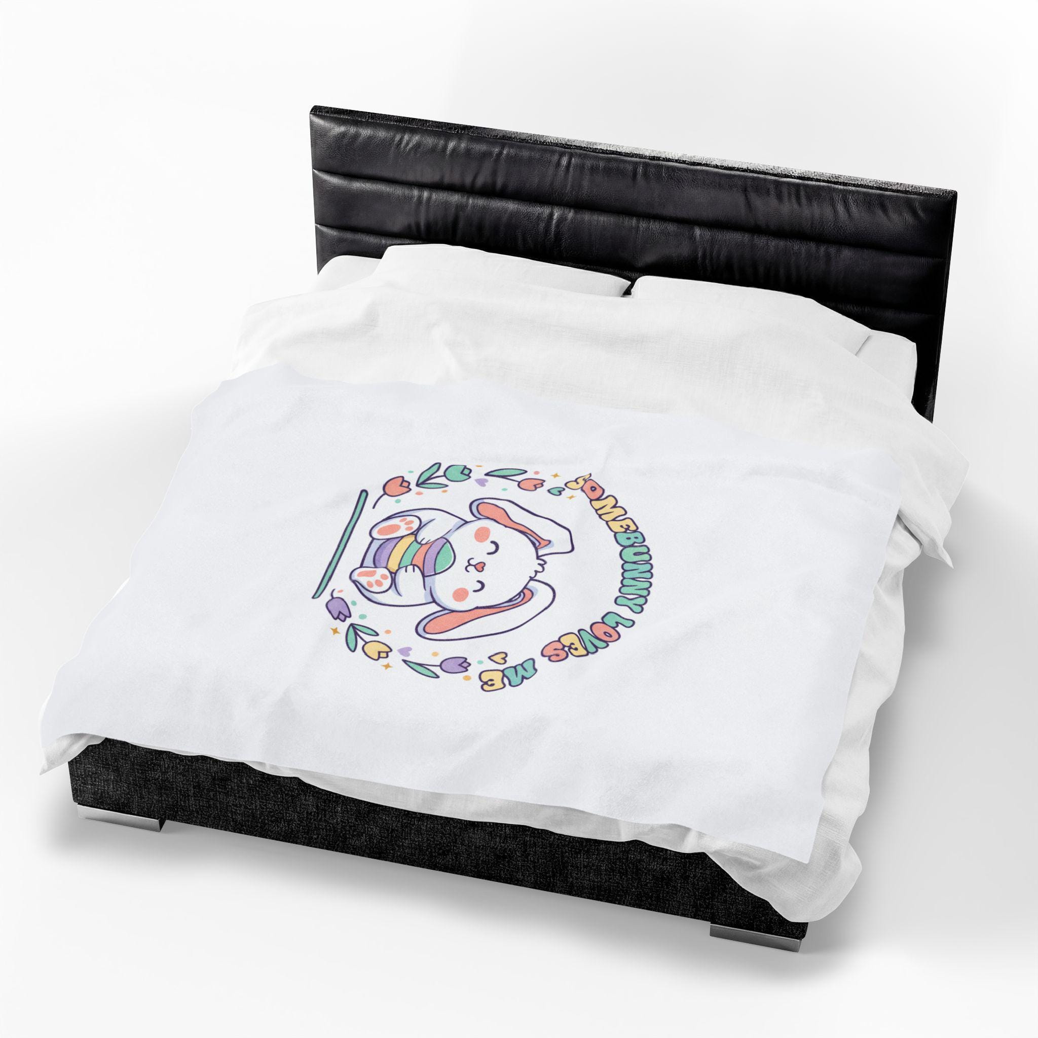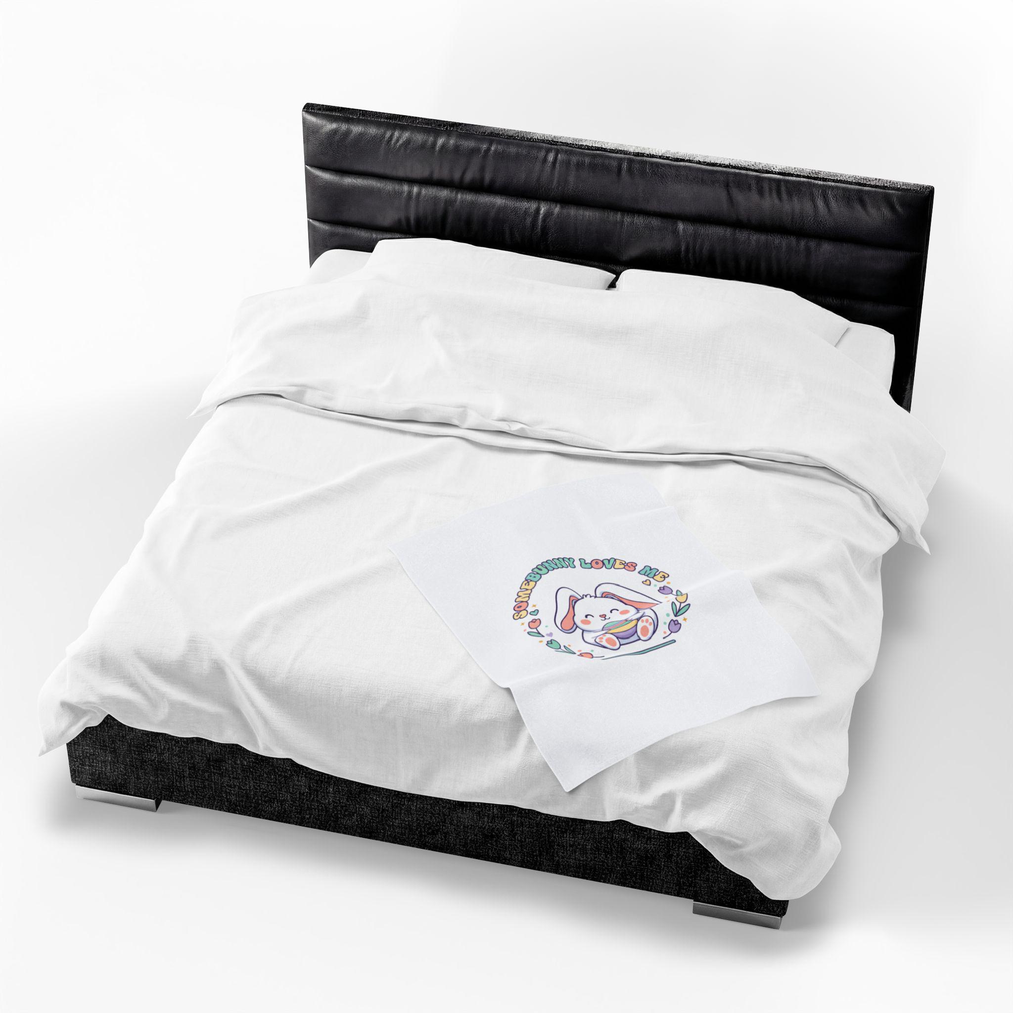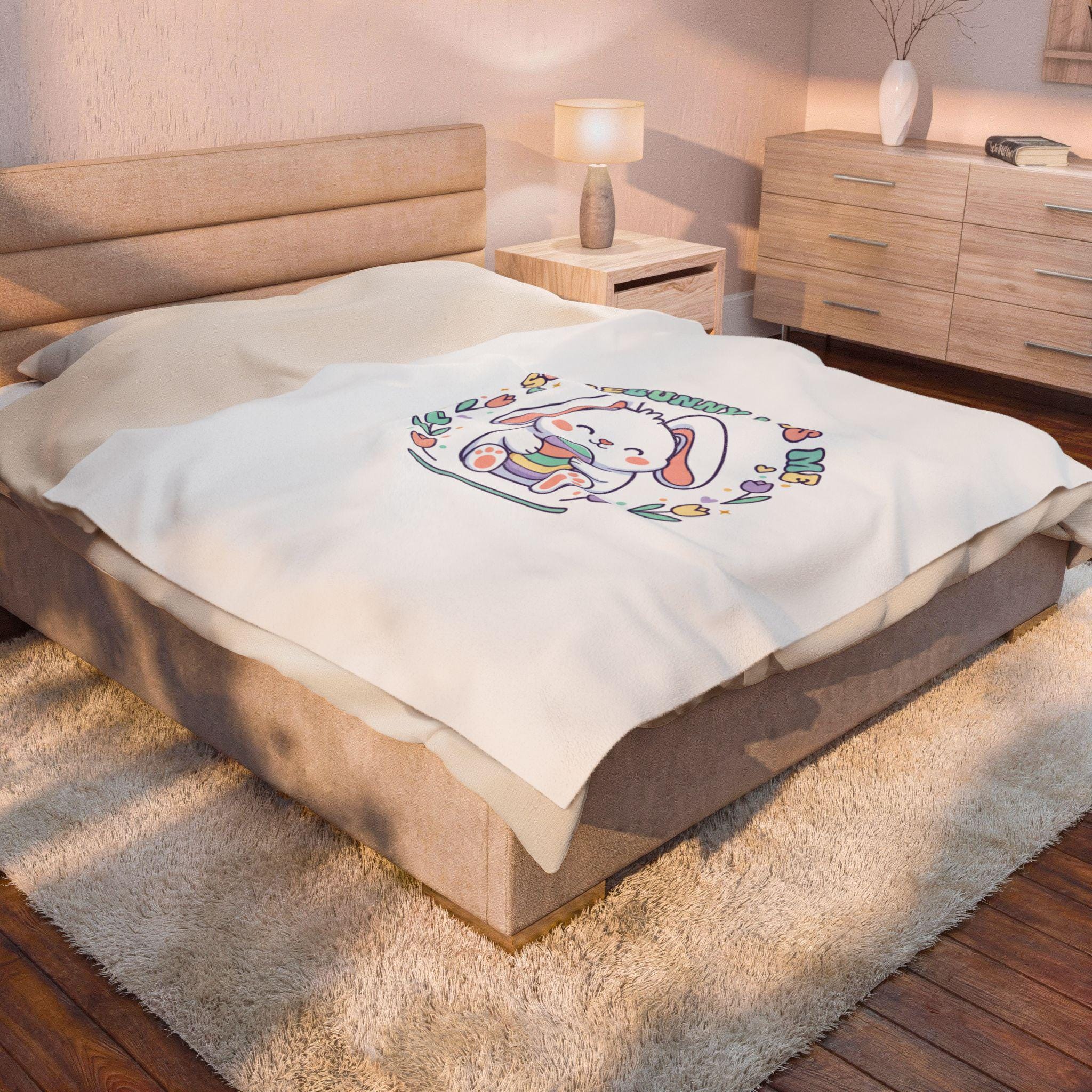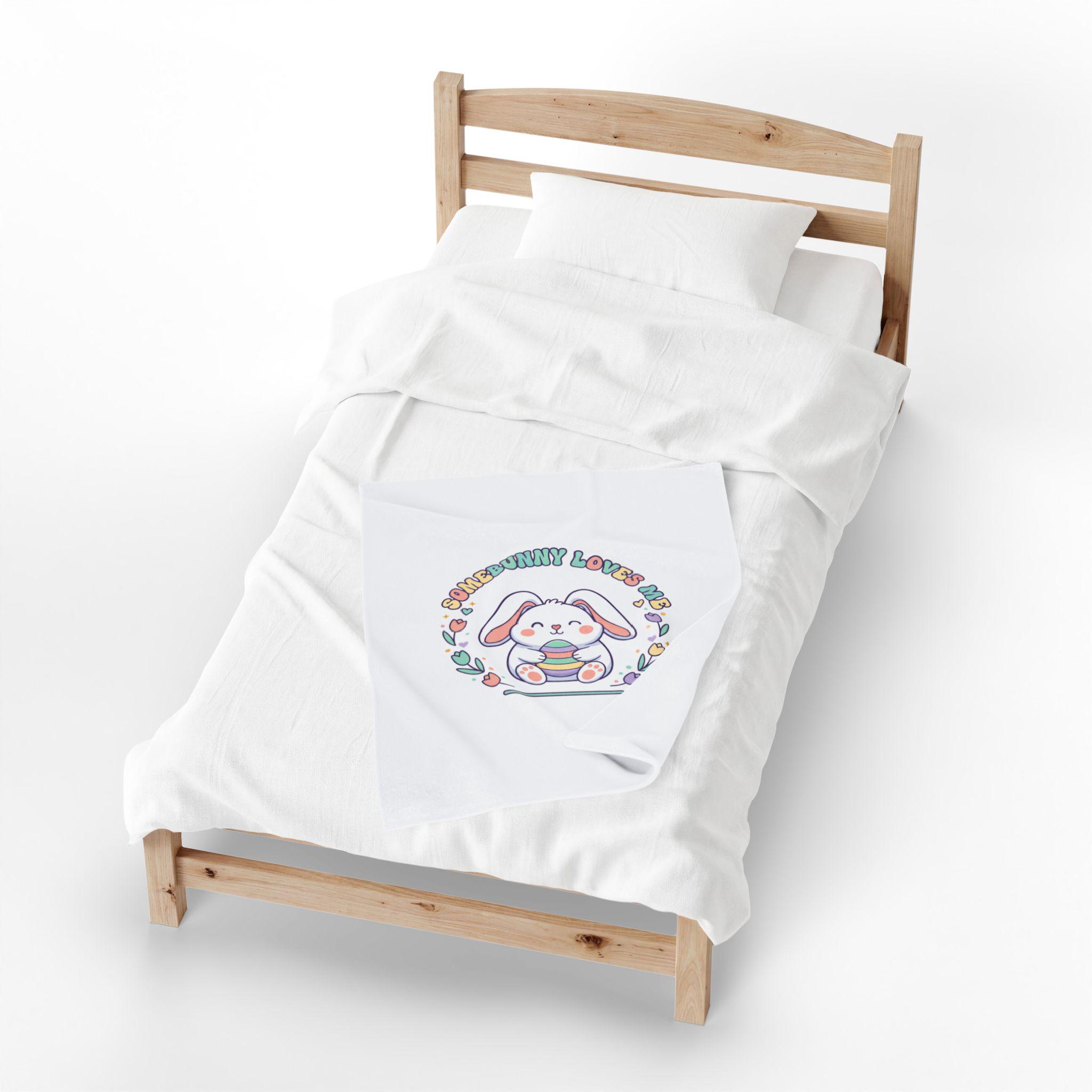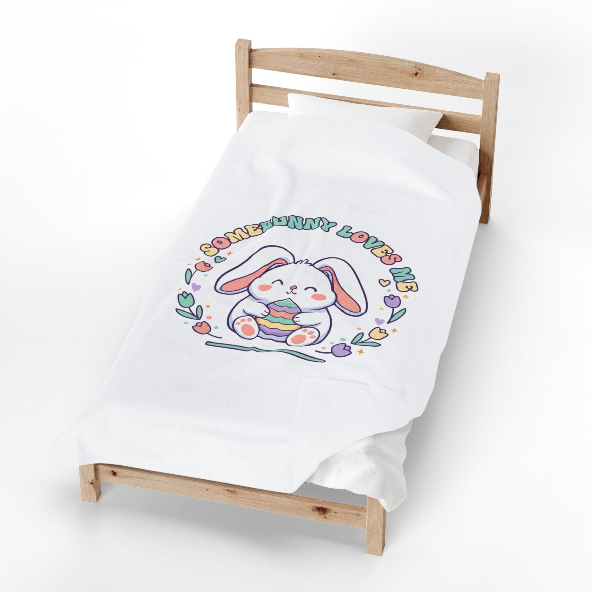 A soft, pastel-themed velveteen throw featuring a sweet, rounded bunny illustration holding a striped egg, framed by tulip and heart motifs with retro-inspired curved lettering. The artwork channels a gentle Easter bunny aesthetic and cottagecore nostalgia—airy, lighthearted, and playful—making it a cozy seasonal accent for springtime bedrooms, nurseries, or family living spaces. The single-sided vibrant print keeps the colors bright against the plush white velveteen, fitting shoppers seeking pastel spring decor and Easter-themed home accents.