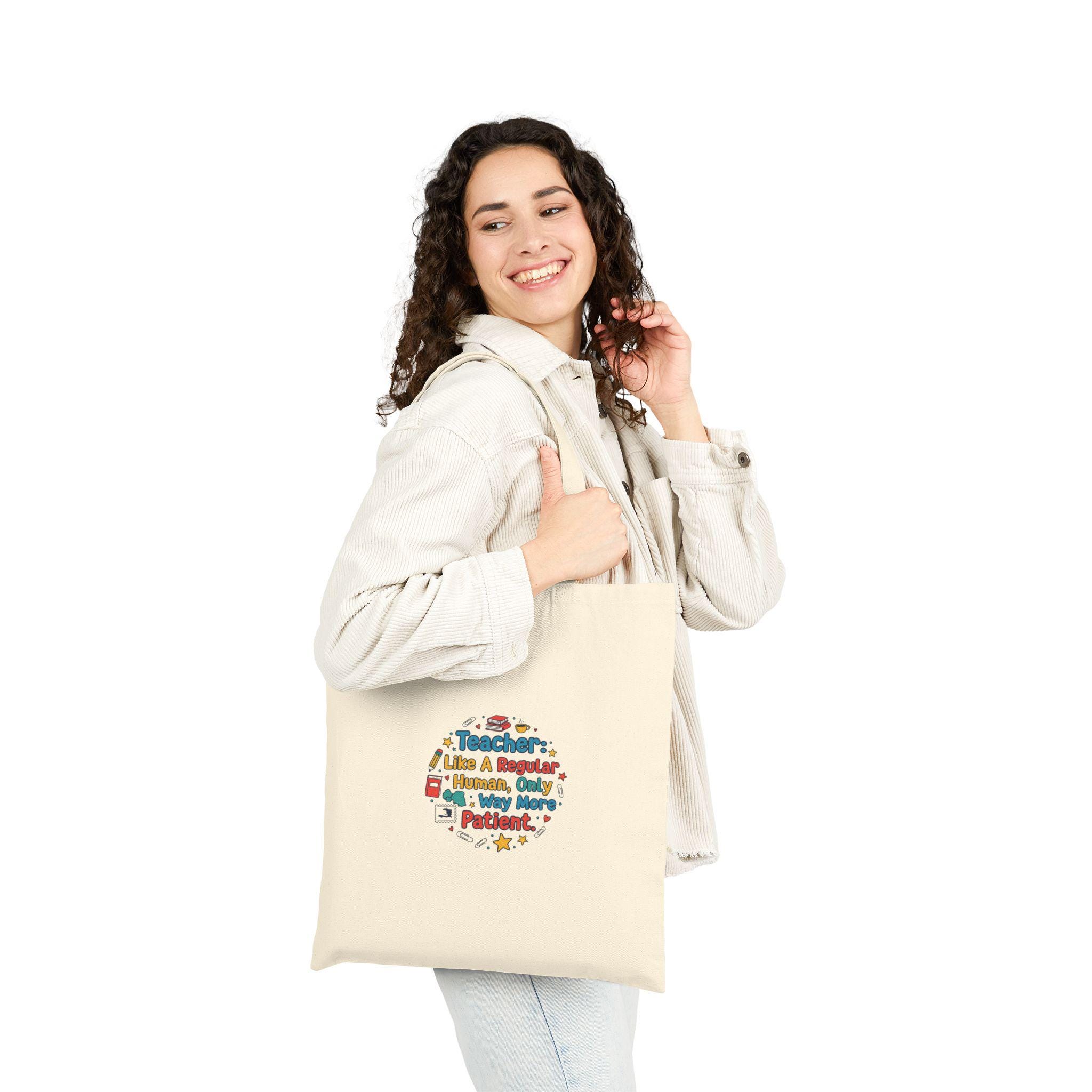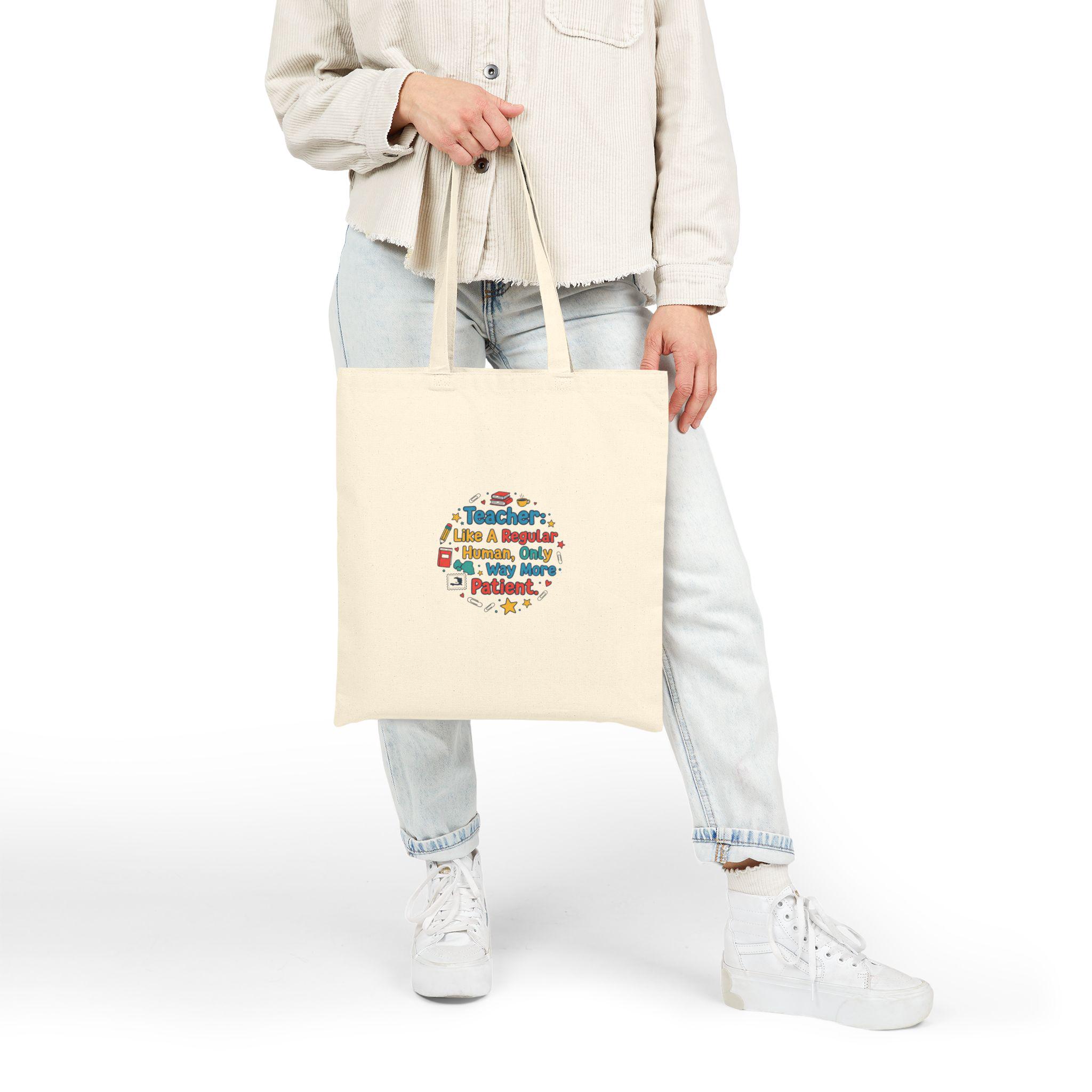 Nostalgic school-style lettering and playful classroom icons form a compact, readable design that celebrates teacher life with a warm, slightly cheeky tone. The print sits centered on a natural canvas surface, using upbeat colors and simple motifs (apple, pencil, stars) that read well at a glance and align with teacher appreciation gifting searches. Practical and low-key, this tote fits daily classroom runs and informal thank-you gestures during Teacher Appreciation Week or end-of-year moments.