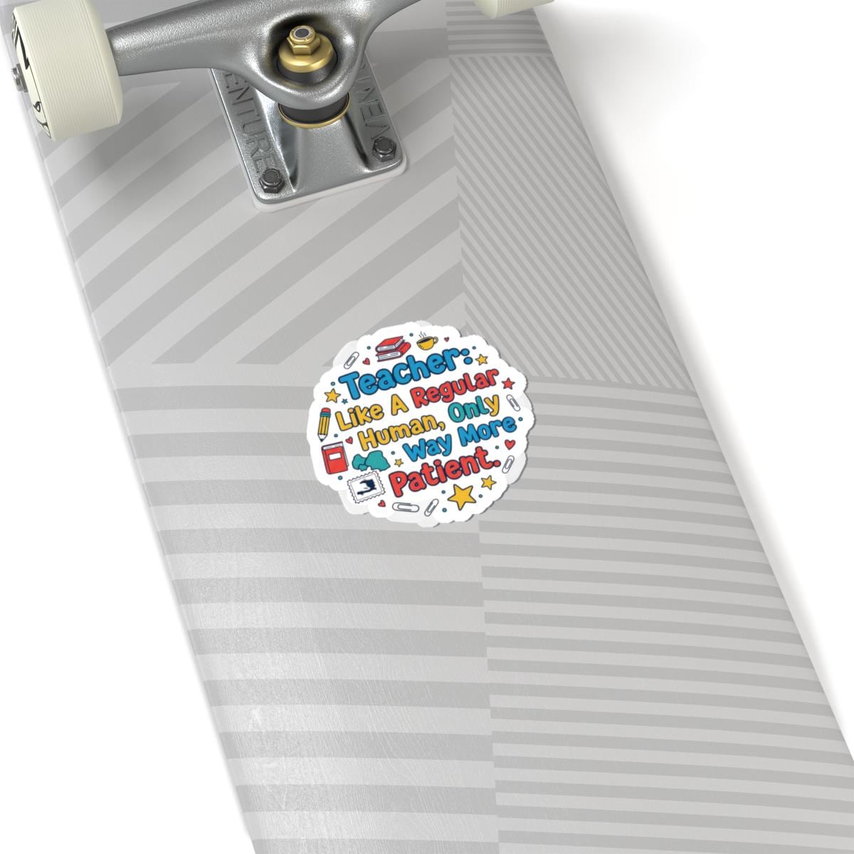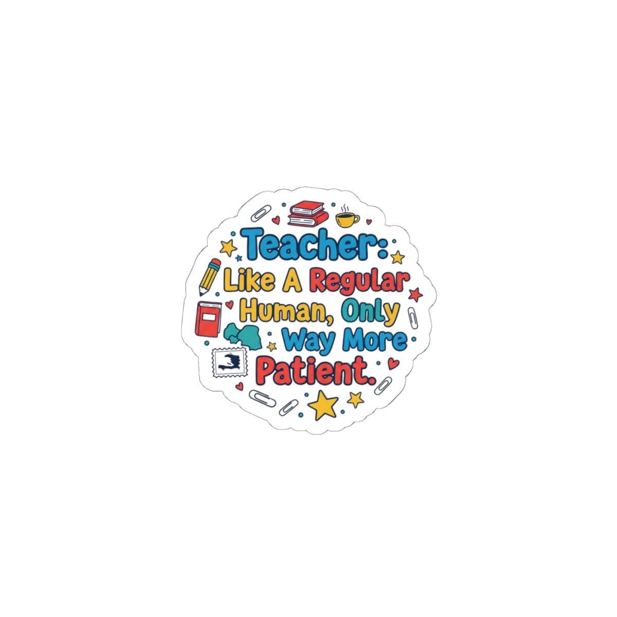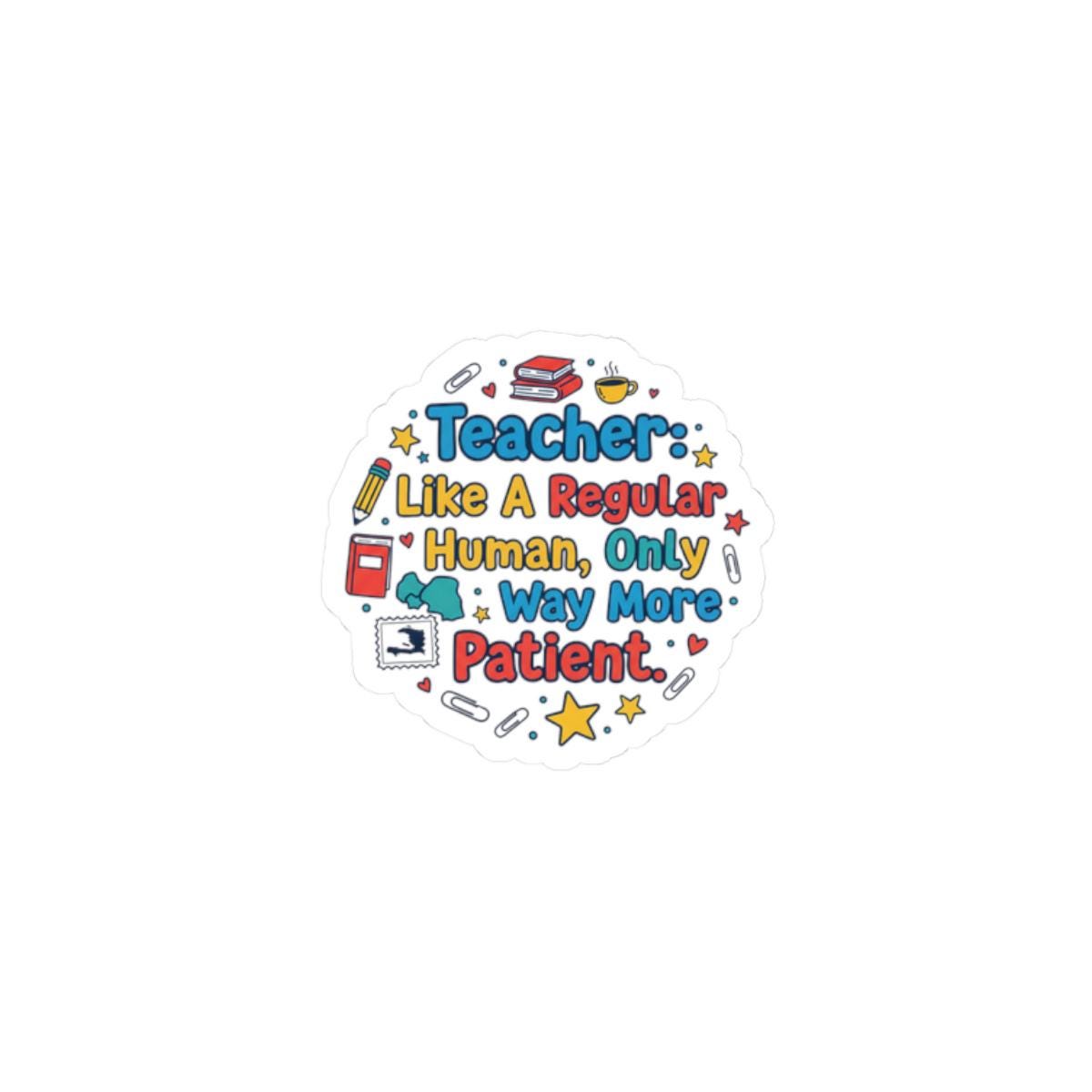 Cheerful school-inspired sticker celebrating the everyday patience of teachers with bold, readable lettering and playful classroom motifs. The round kiss-cut design pairs colorful, nostalgic type with tiny icons (books, pencils, stars) to read clearly at a glance — aligned with teacher appreciation gifts and teacher life searches. Durable glossy vinyl and bright eco-solvent printing make it a low-cost, classroom-ready token that sticks cleanly to laptops, journals, and other smooth surfaces.