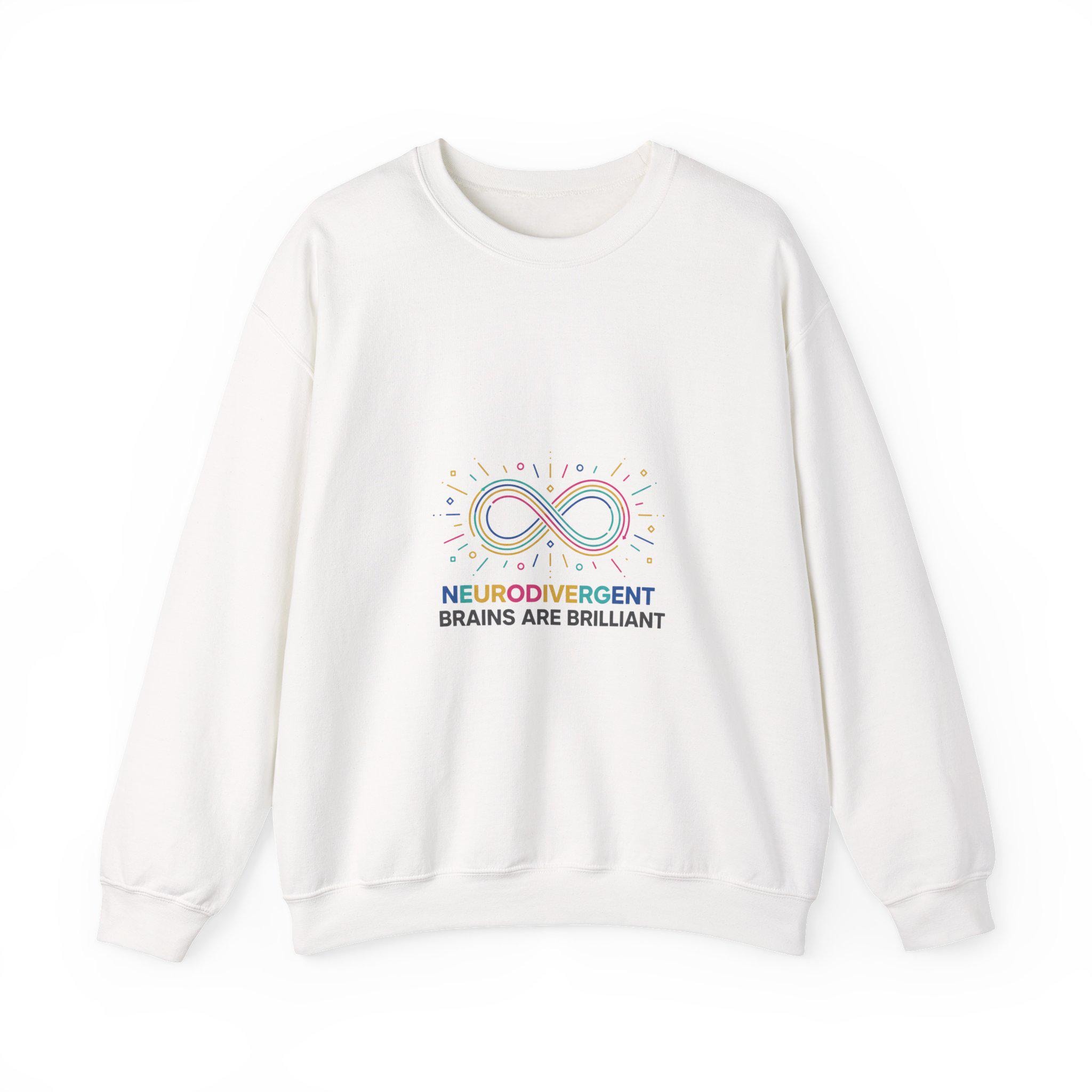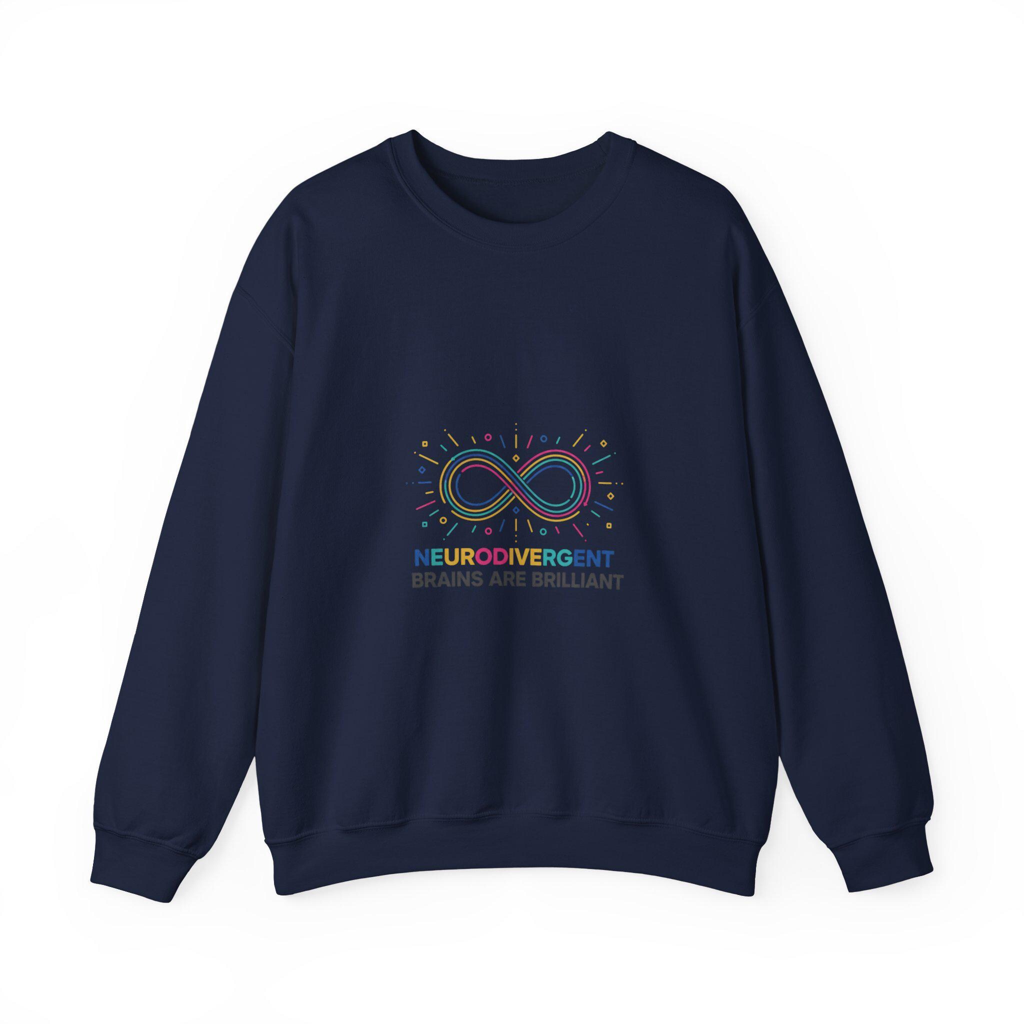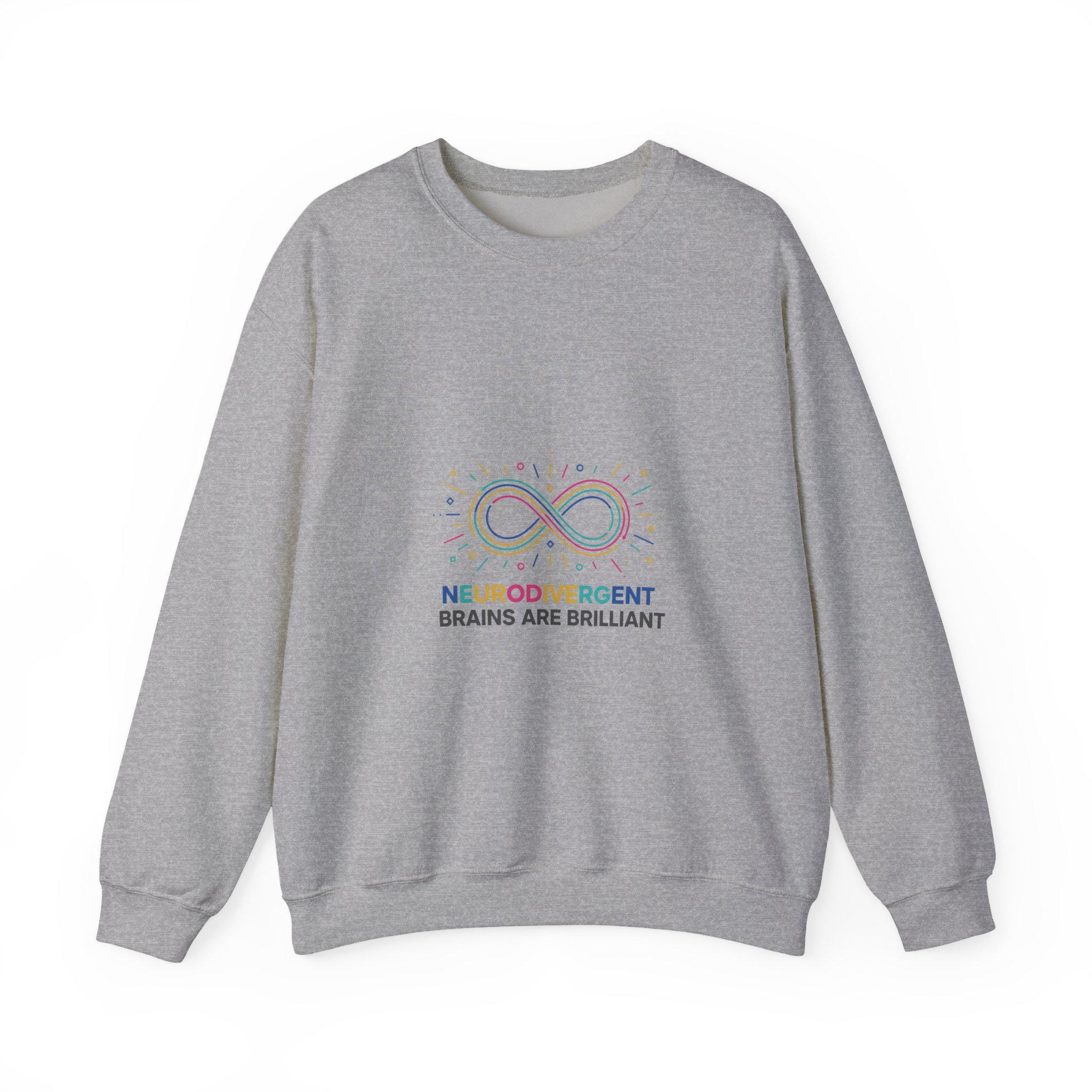 Soft, affirming sweatshirt featuring a stitched infinity motif in gentle rainbow hues and the statement “NEURODIVERGENT BRAINS ARE BRILLIANT.” The artwork reads as celebratory and strength-focused rather than awareness-only, using approachable colors and clear, readable type that fits neurodiversity and autistic pride wardrobes. The crewneck silhouette and understated placement make it suitable for everyday wear, advocacy spaces, or workplace-casual settings where a calm, positive message is wanted.
